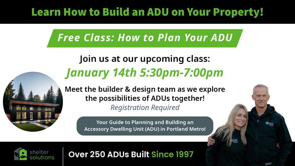 Since 1997, we have built 250+ ADUs in the Portland Metro area for people who want to age in place, keep family close, earn rental income, have a: guest house, home office, entertainment space, studio, home gym... The list of reasons continues to grow! Whether you’re curious about possibilities or already have specific goals in mind, our team at Shelter Solutions provides comprehensive guidance on ADU design and development. You’ll discover key insights on designing for efficiency, following local zoning guidelines, and understanding project timelines—from conceptual sketches to final plans. Our experienced professionals address questions about floor plan optimization, sustainable practices, and selecting materials that fit your preferences. Thanks to our years of combined expertise in Portland ADU construction, design, and project management, we can help you save time, reduce costs, and confidently launch your ADU project.