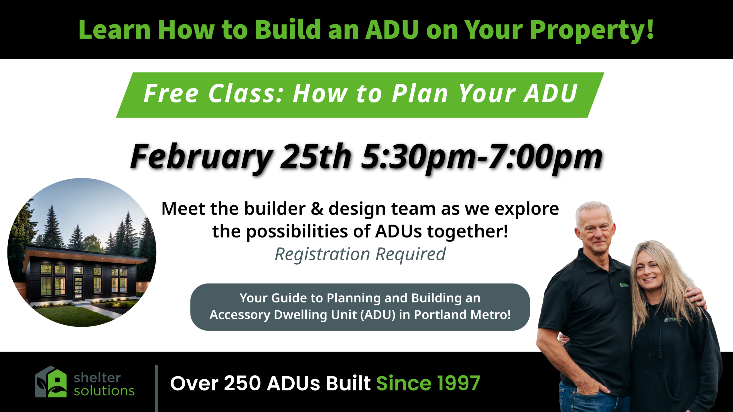 Since 1997, we have built 250+ ADUs in the Portland Metro area for people who want to age in place, keep family close, earn rental income, have a: guest house, home office, entertainment space, studio, home gym... The list of reasons continues to grow! Whether you’re curious about possibilities or already have specific goals in mind, our team at Shelter Solutions provides comprehensive guidance on ADU design and development. You’ll discover key insights on designing for efficiency, following local zoning guidelines, and understanding project timelines—from conceptual sketches to final plans. Our experienced professionals address questions about floor plan optimization, sustainable practices, and selecting materials that fit your preferences. Thanks to our years of combined expertise in Portland ADU construction, design, and project management, we can help you save time, reduce costs, and confidently launch your ADU project.