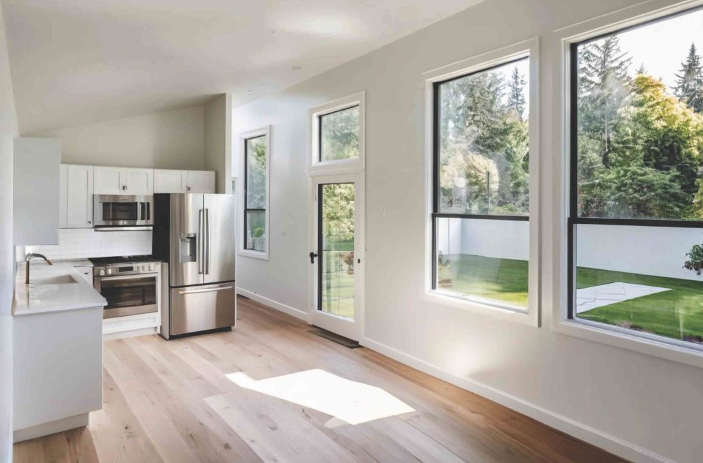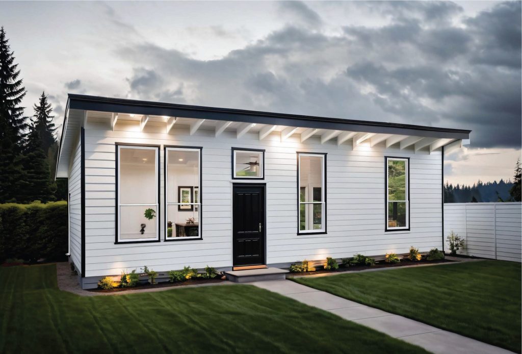 The Montgomery offers a modern ADU focused on clean lines and a bright aesthetic. This sleek, contemporary design features a one-level layout with a shed-style roof and vaulted ceiling, complemented by a light interior color palette with soft tones. The crisp white exterior is accented by open rafter details, adding a touch of classic craftsmanship to the modern design. Expansive windows ensure ample natural light fills the space, creating an airy, inviting atmosphere.