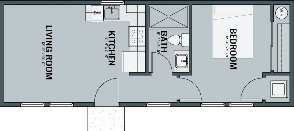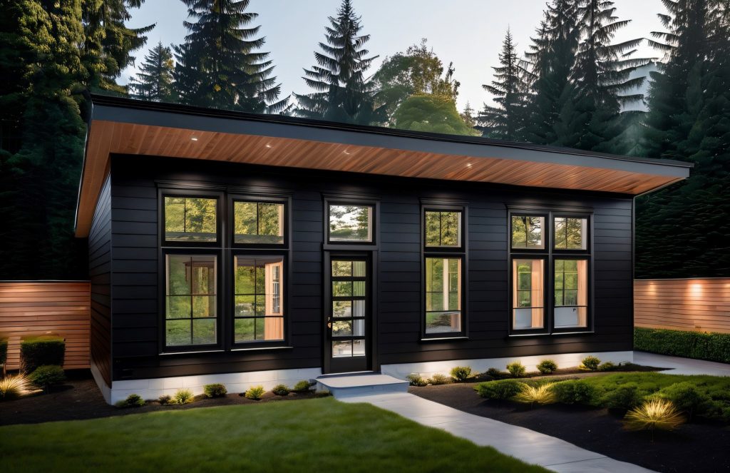 The Montgomery “Black” presents a modern ADU with Black Andersen Windows. We have also enhanced the interior light, and exterior ascetic by adding 5 additional windows, and a Modern glass & wood front door. The darker exterior is accentuated by the warm T&G wood soffit with dramatic up/down lighting.
