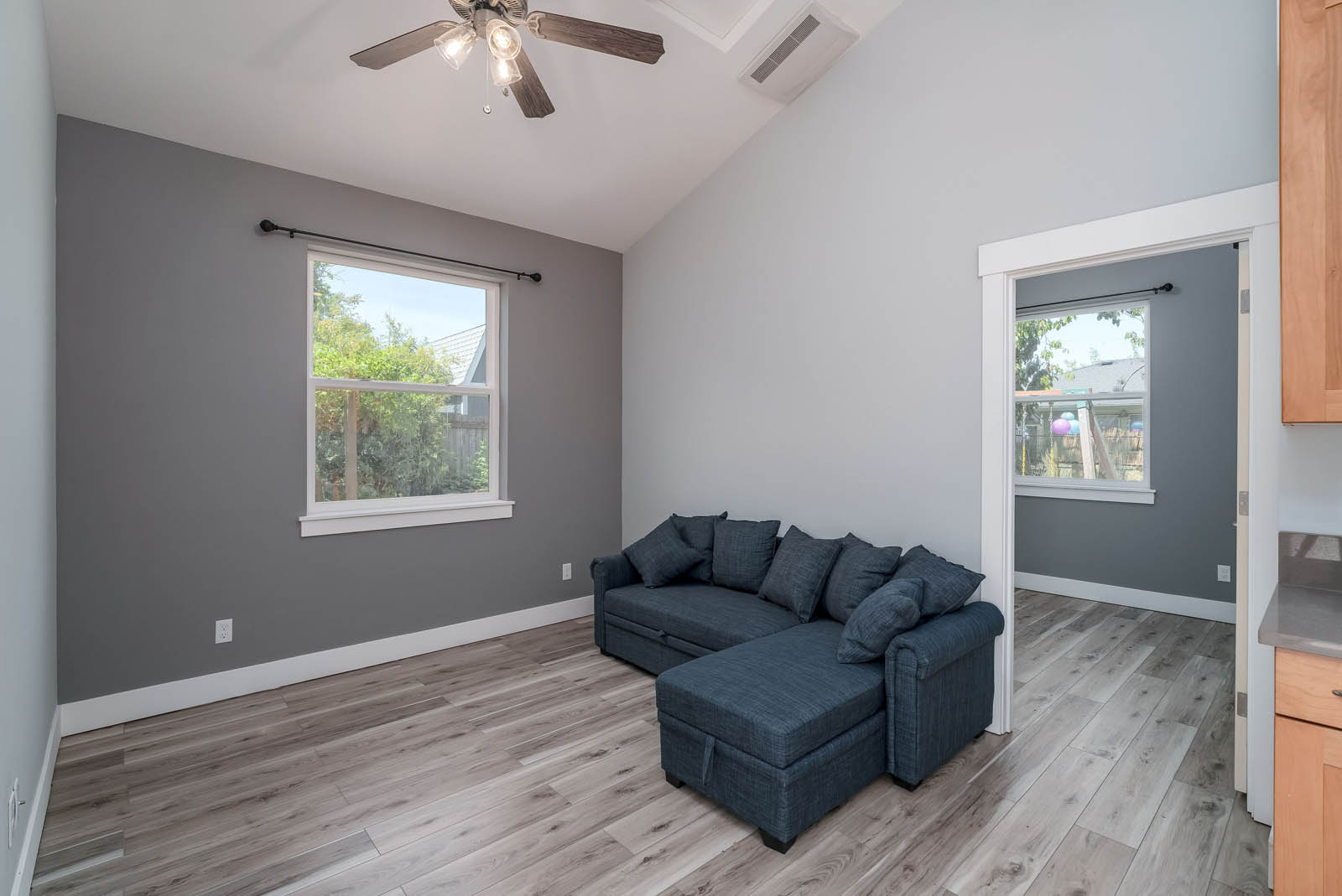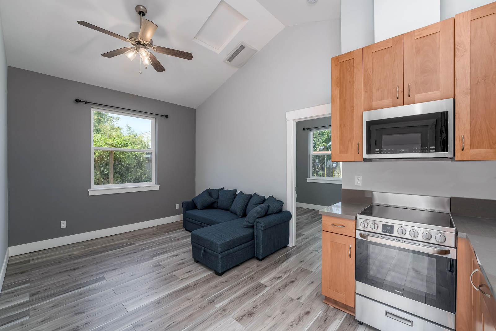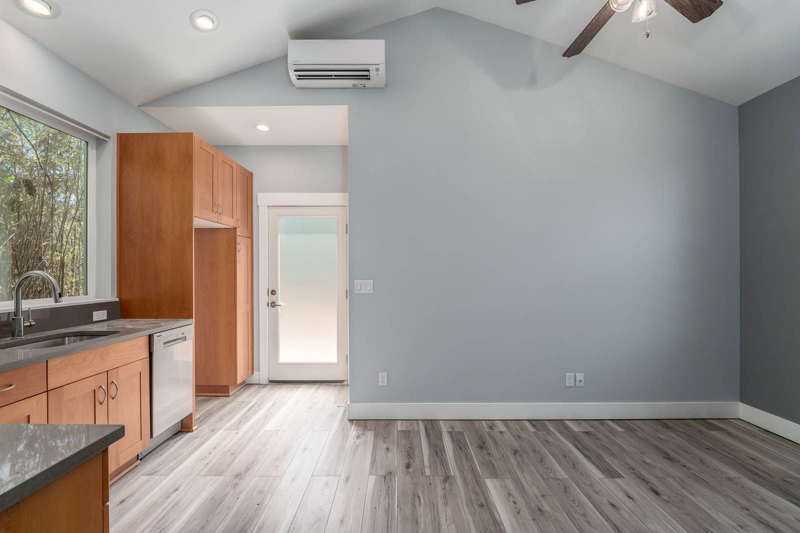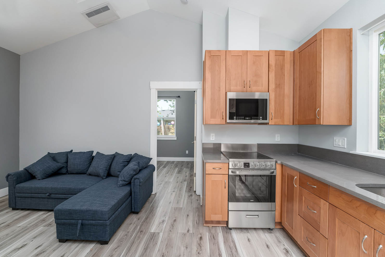 This ADU showcases Shelter Solutions’ expertise in efficiently utilizing very small spaces. You can see how tightly built the ADU is to the property line and the existing house. This 410 sq ft gem was built for our client to “age in place” on her daughter’s property, allowing her to stay close to her grandkids and family while enjoying her own private retreat at the end of the day.