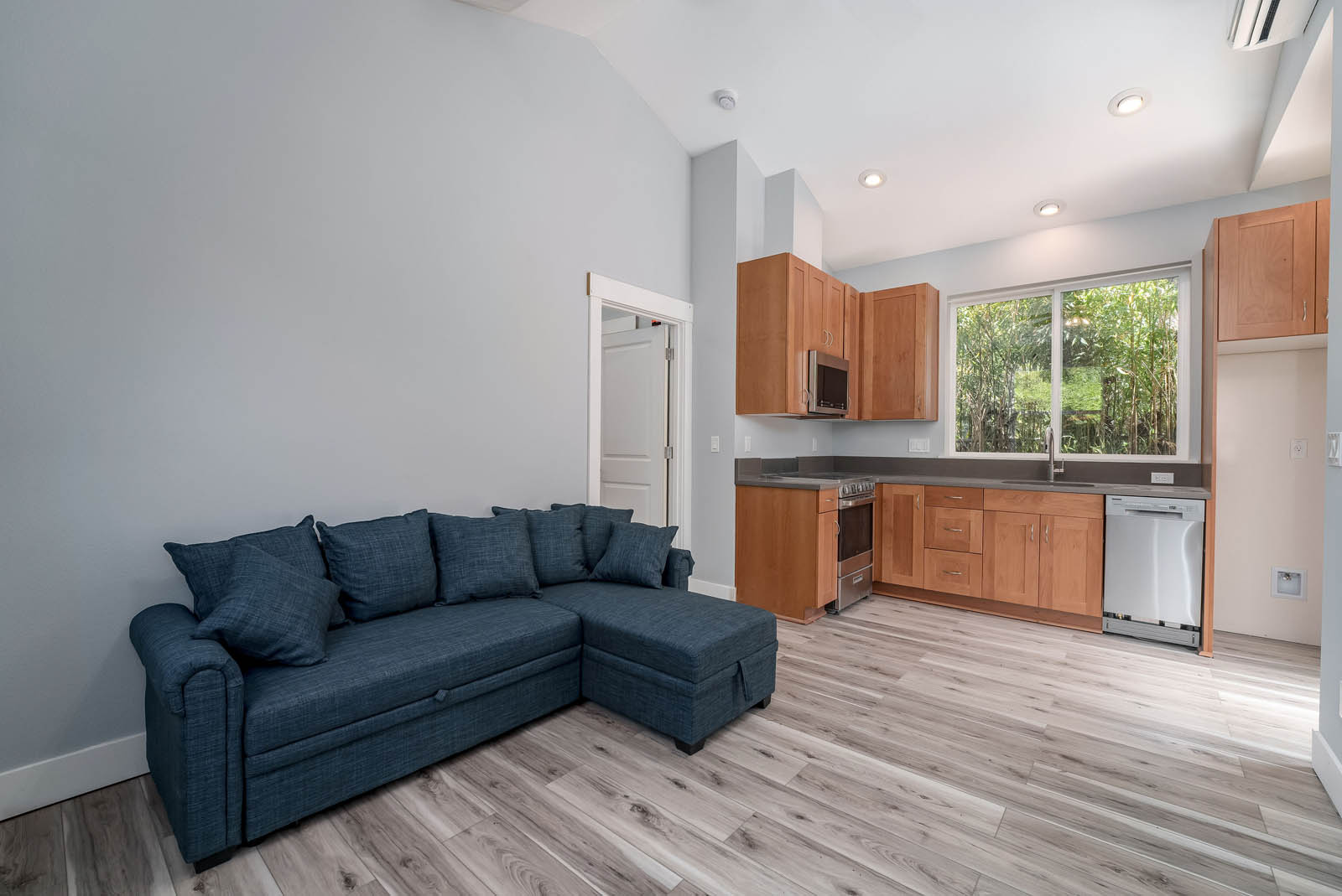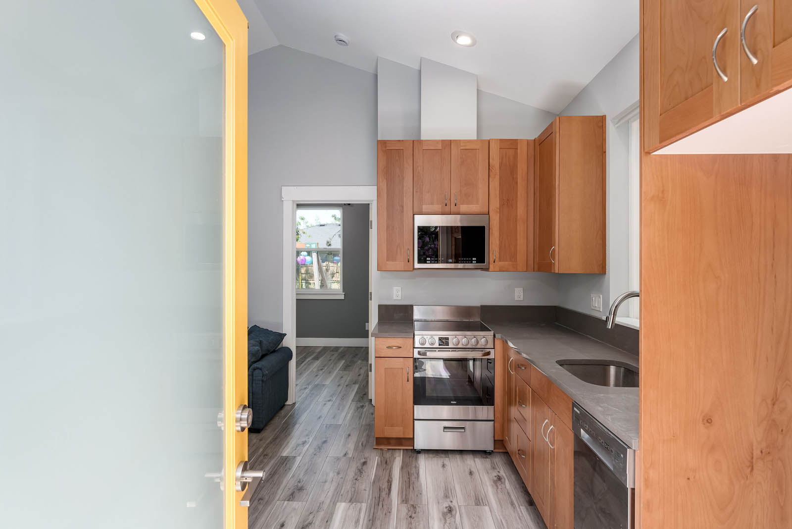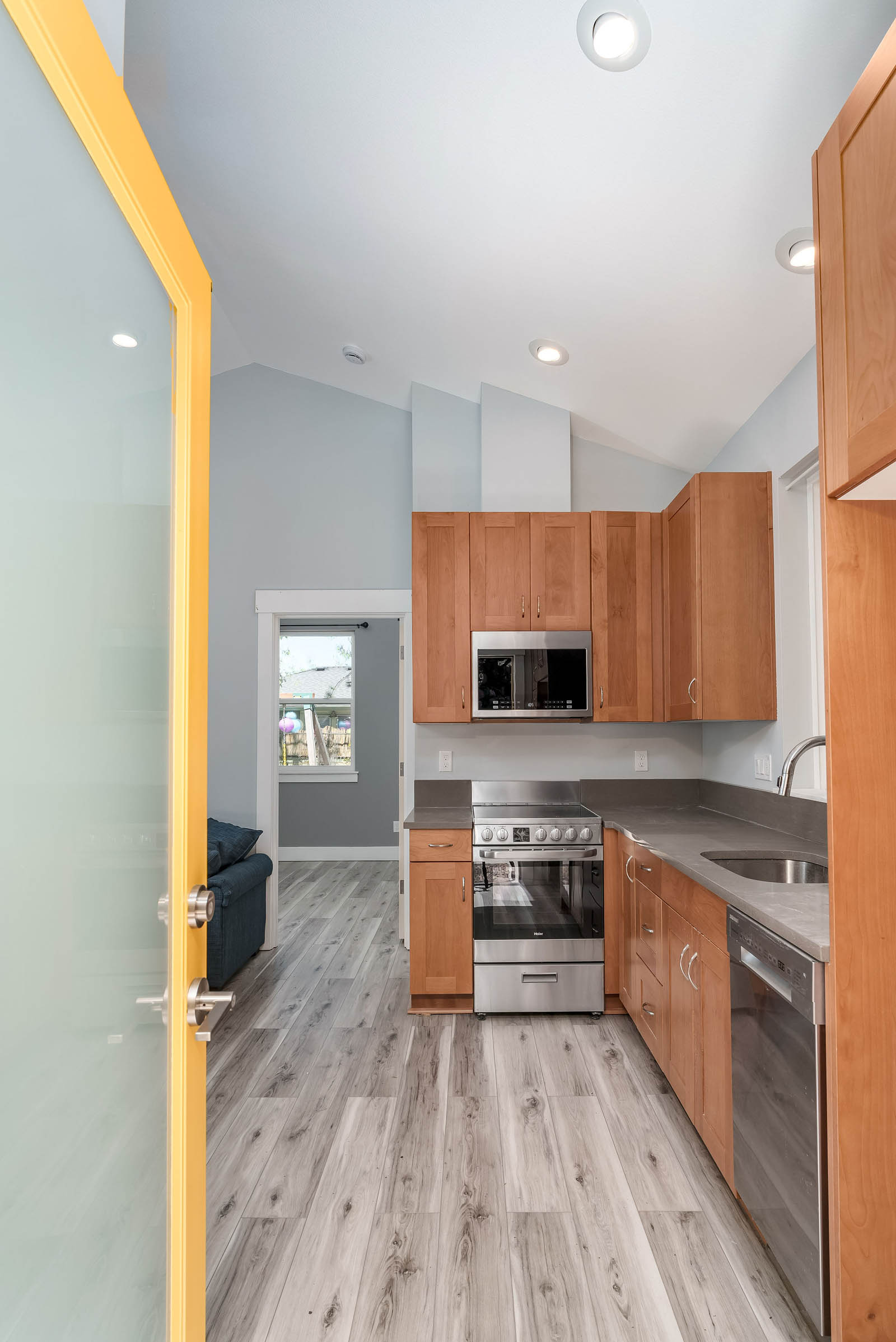 This ADU showcases Shelter Solutions’ expertise in efficiently utilizing very small spaces. You can see how tightly built the ADU is to the property line and the existing house. This 410 sq ft gem was built for our client to “age in place” on her daughter’s property, allowing her to stay close to her grandkids and family while enjoying her own private retreat at the end of the day.
