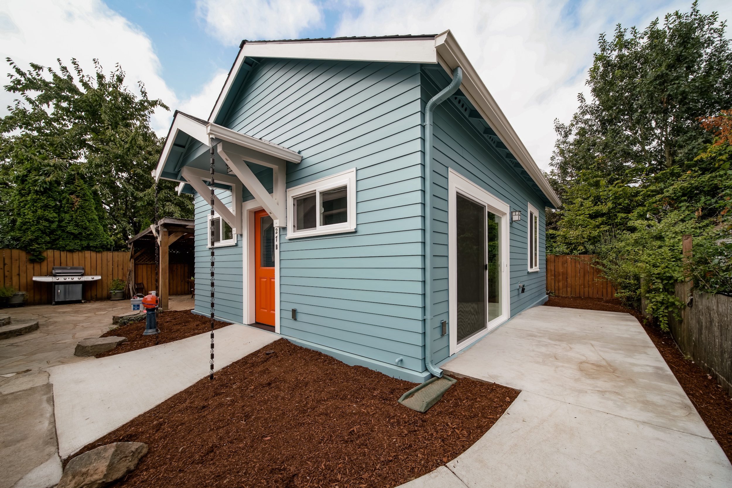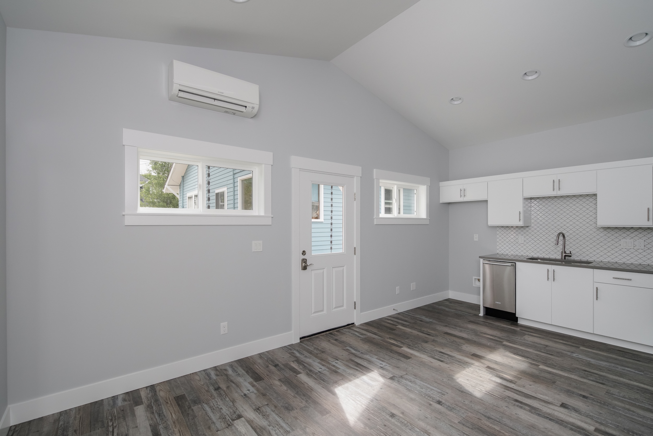 This detached one-level dwelling spans 475 square feet within a 20×26 footprint was designed for parents to Age-In-Place. The exterior bursts with color, while the interior opts for minimalist hues, allowing for easy adaptation to various design schemes.
