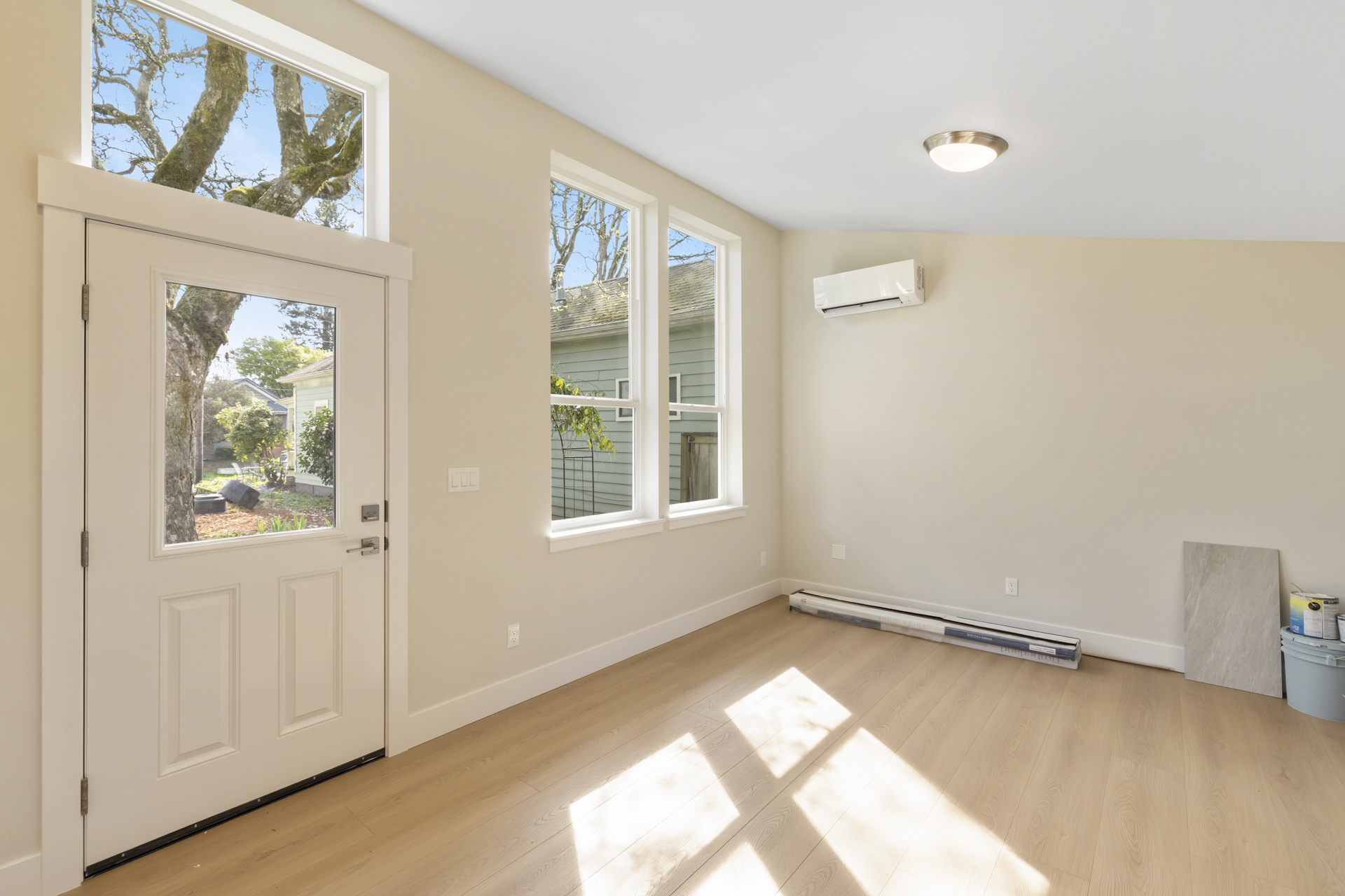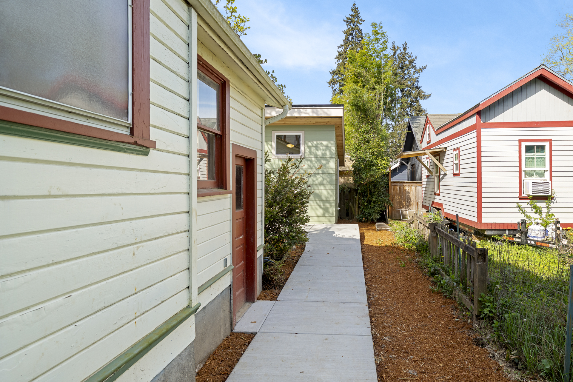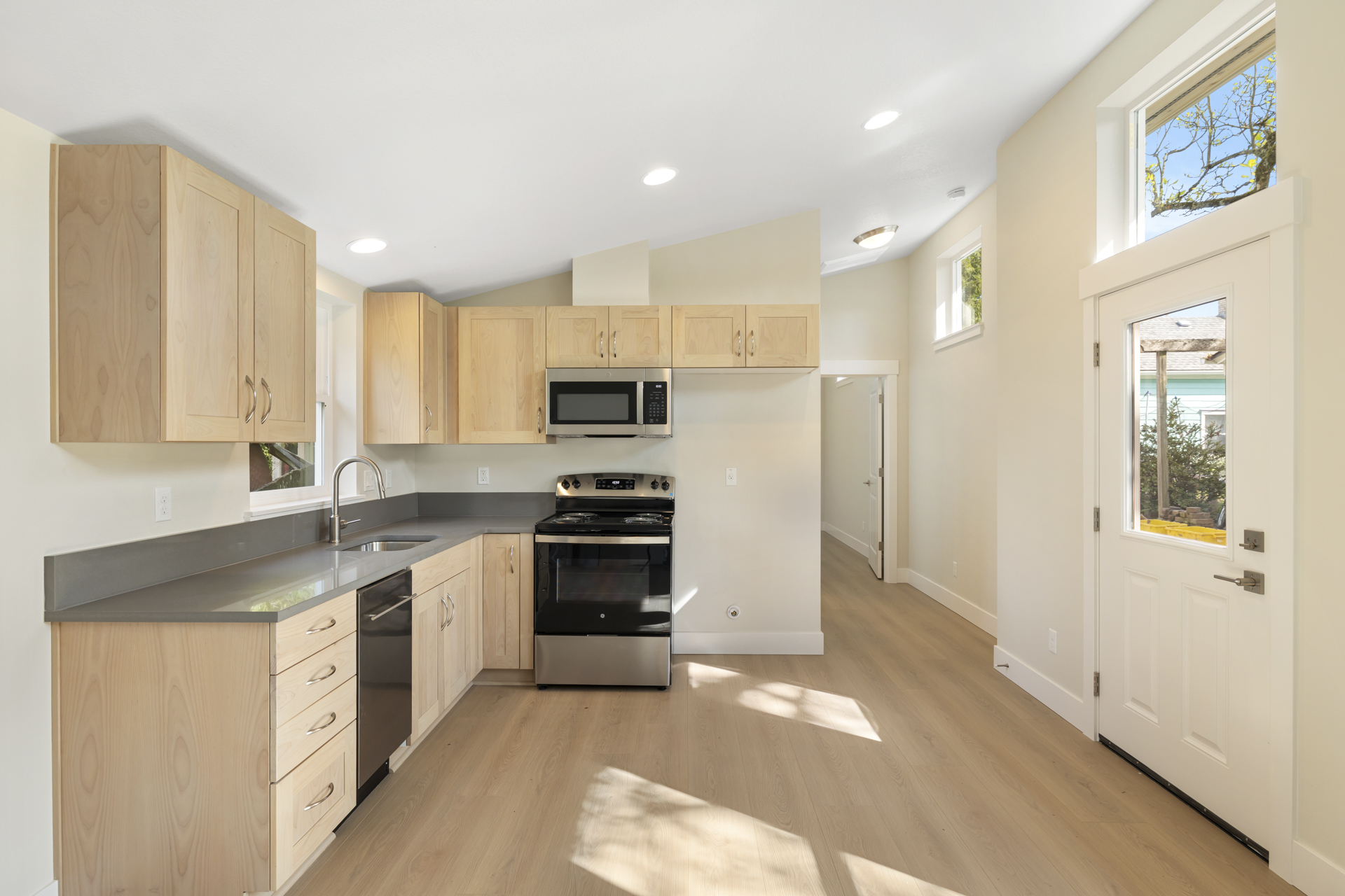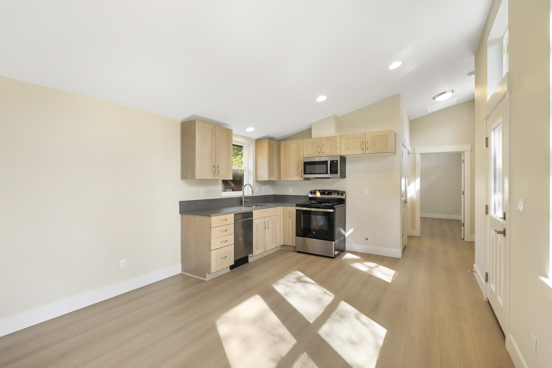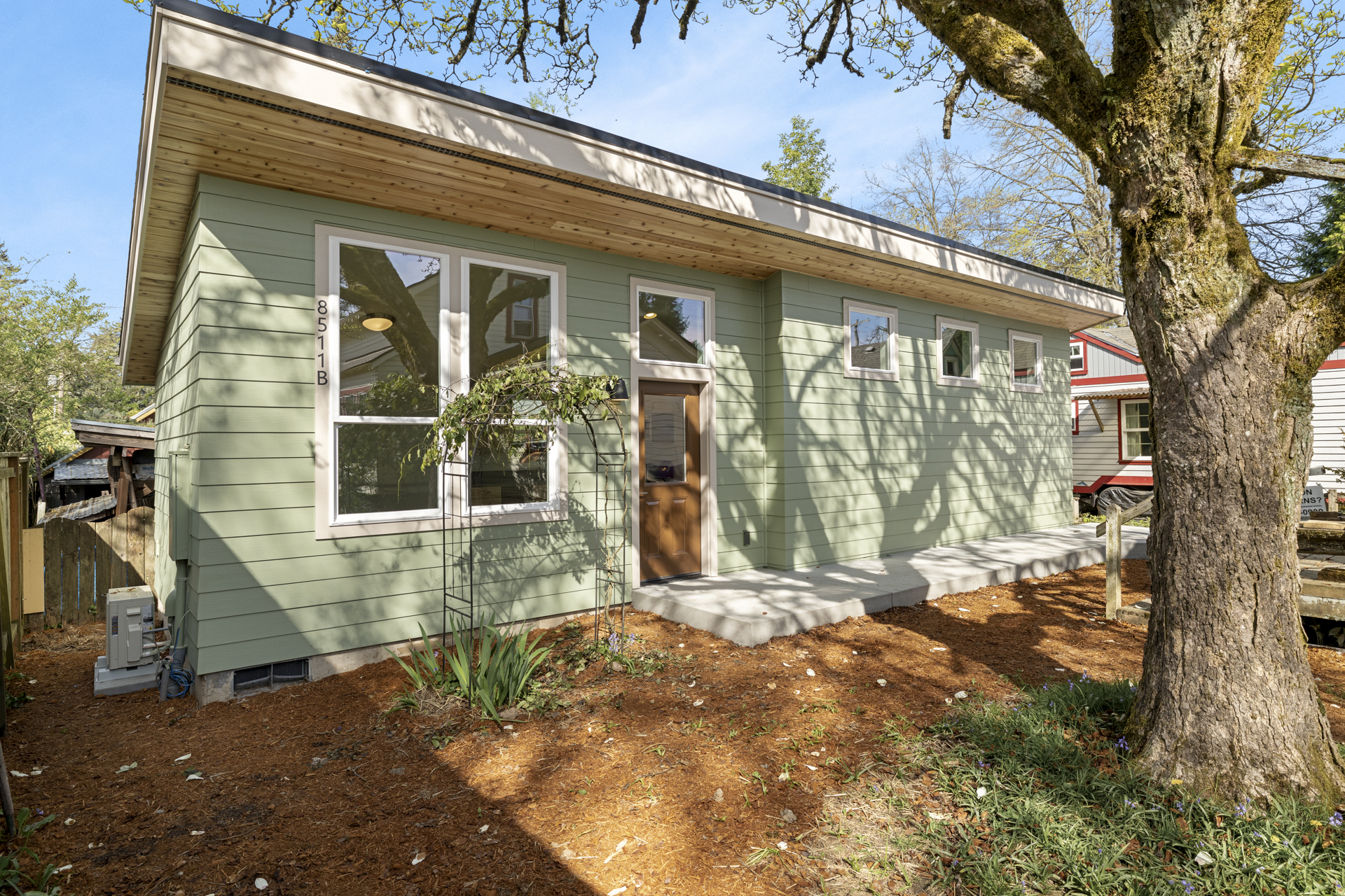 Inside, intentional upgrades elevate both function and feel. The bathroom features a fully tiled floor and a curbless walk-in shower, blending clean design with everyday practicality. The shed-style roofline and vaulted ceilings bring a sense of openness, while a generous window layout fills the home with soft, natural light throughout the day.