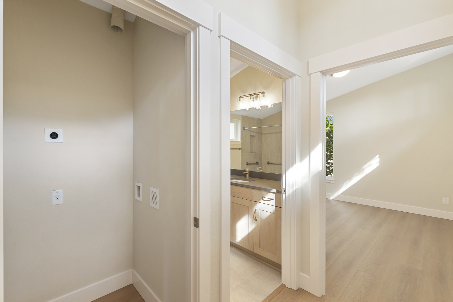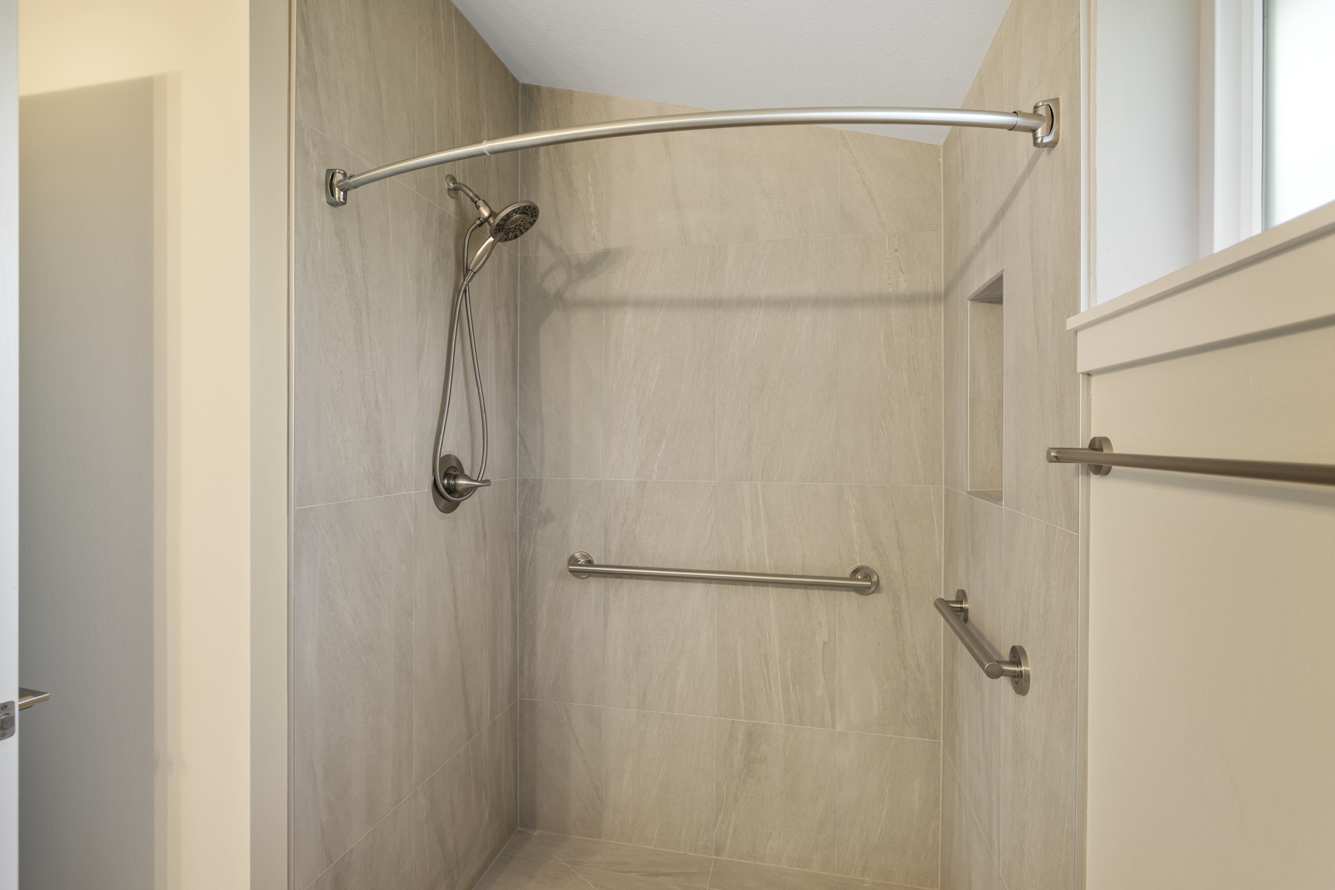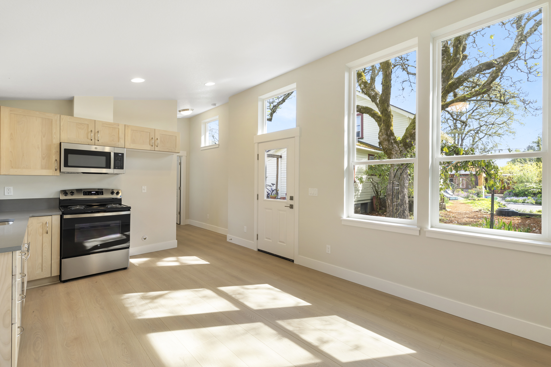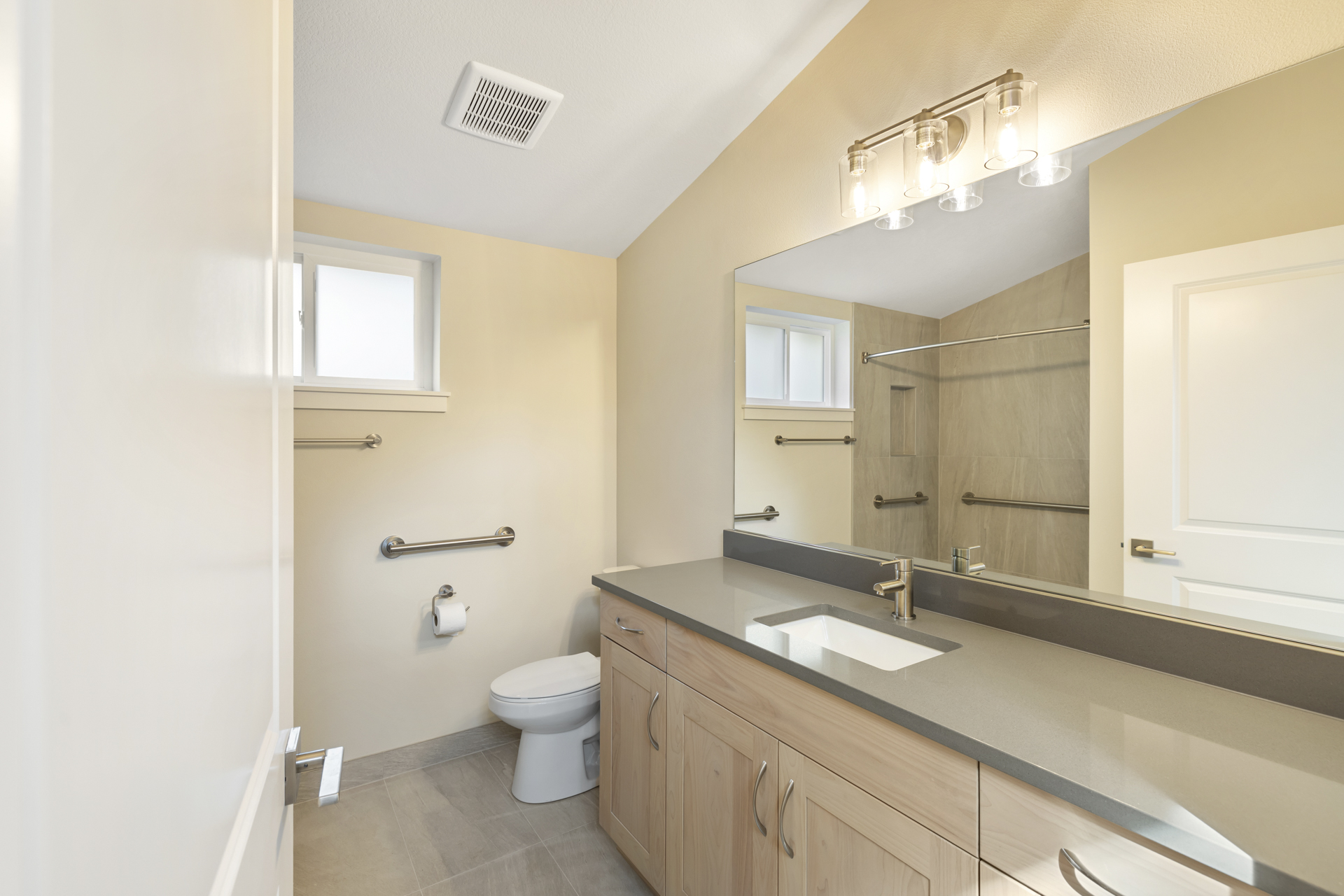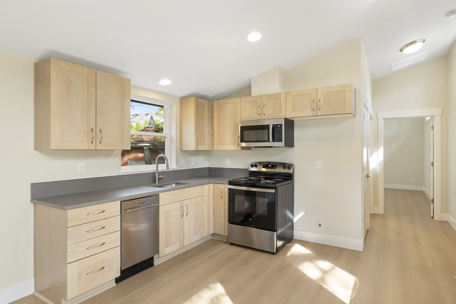 Inside, intentional upgrades elevate both function and feel. The bathroom features a fully tiled floor and a curbless walk-in shower, blending clean design with everyday practicality. The shed-style roofline and vaulted ceilings bring a sense of openness, while a generous window layout fills the home with soft, natural light throughout the day.