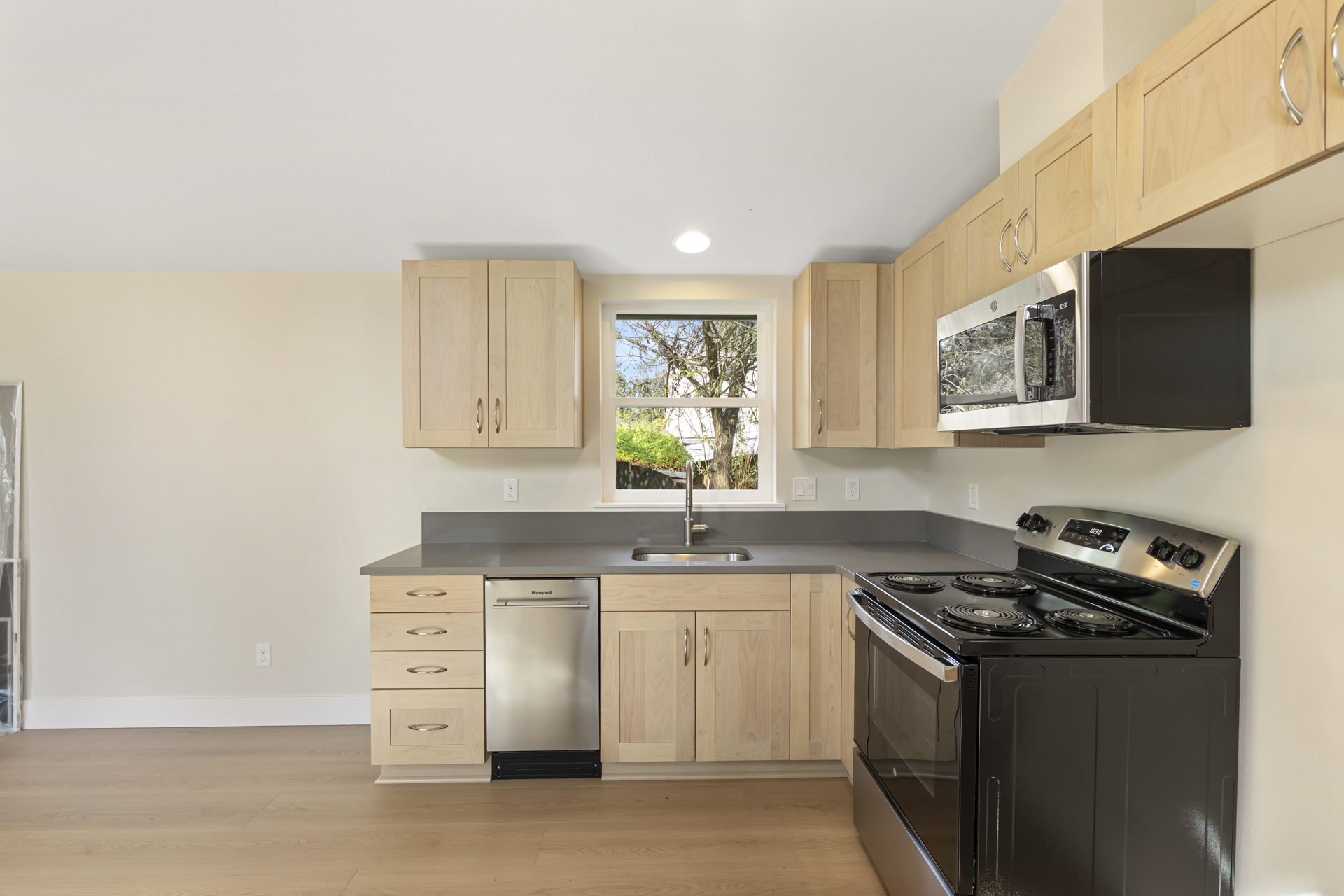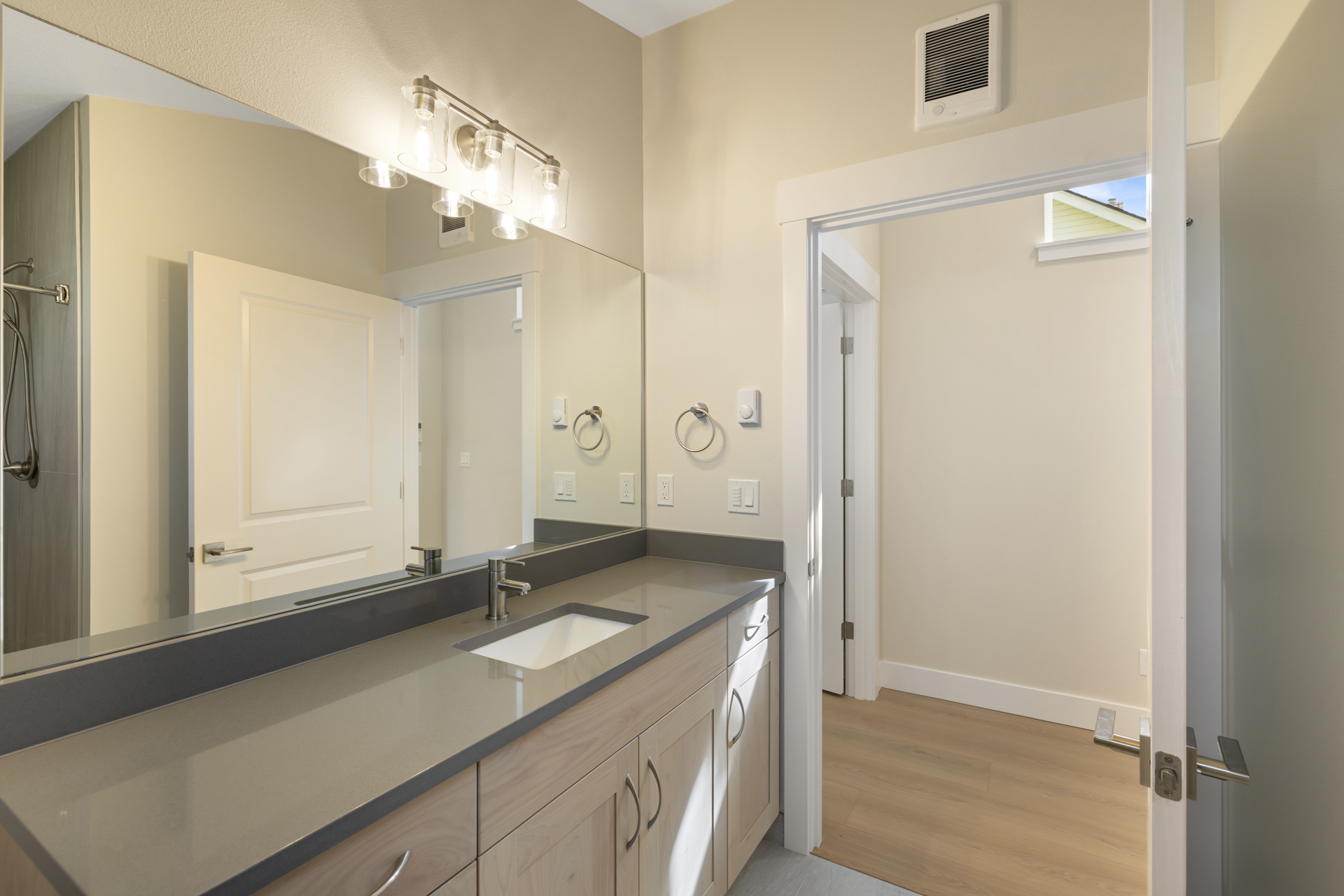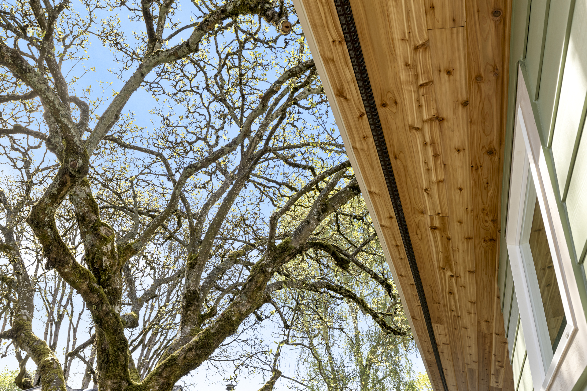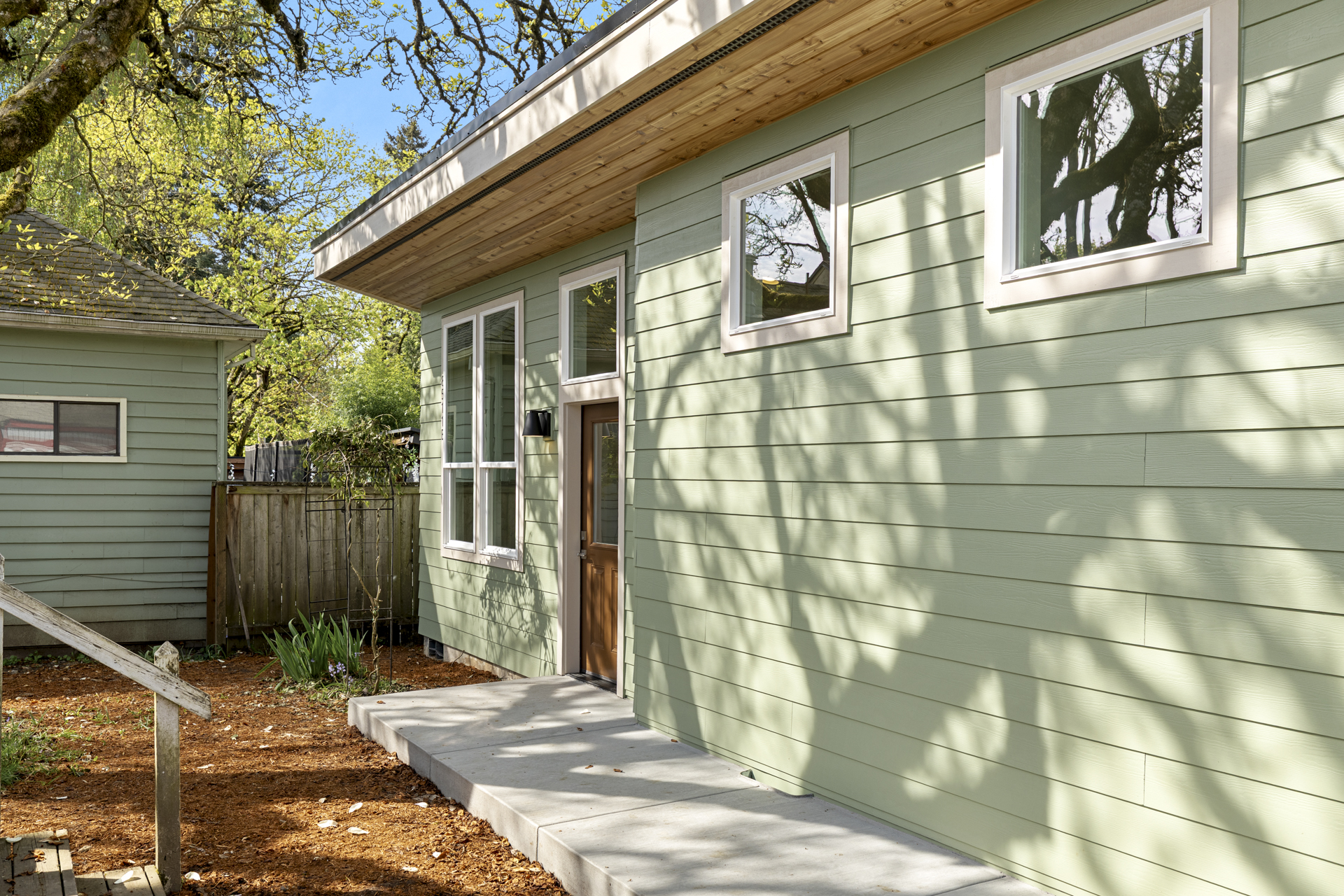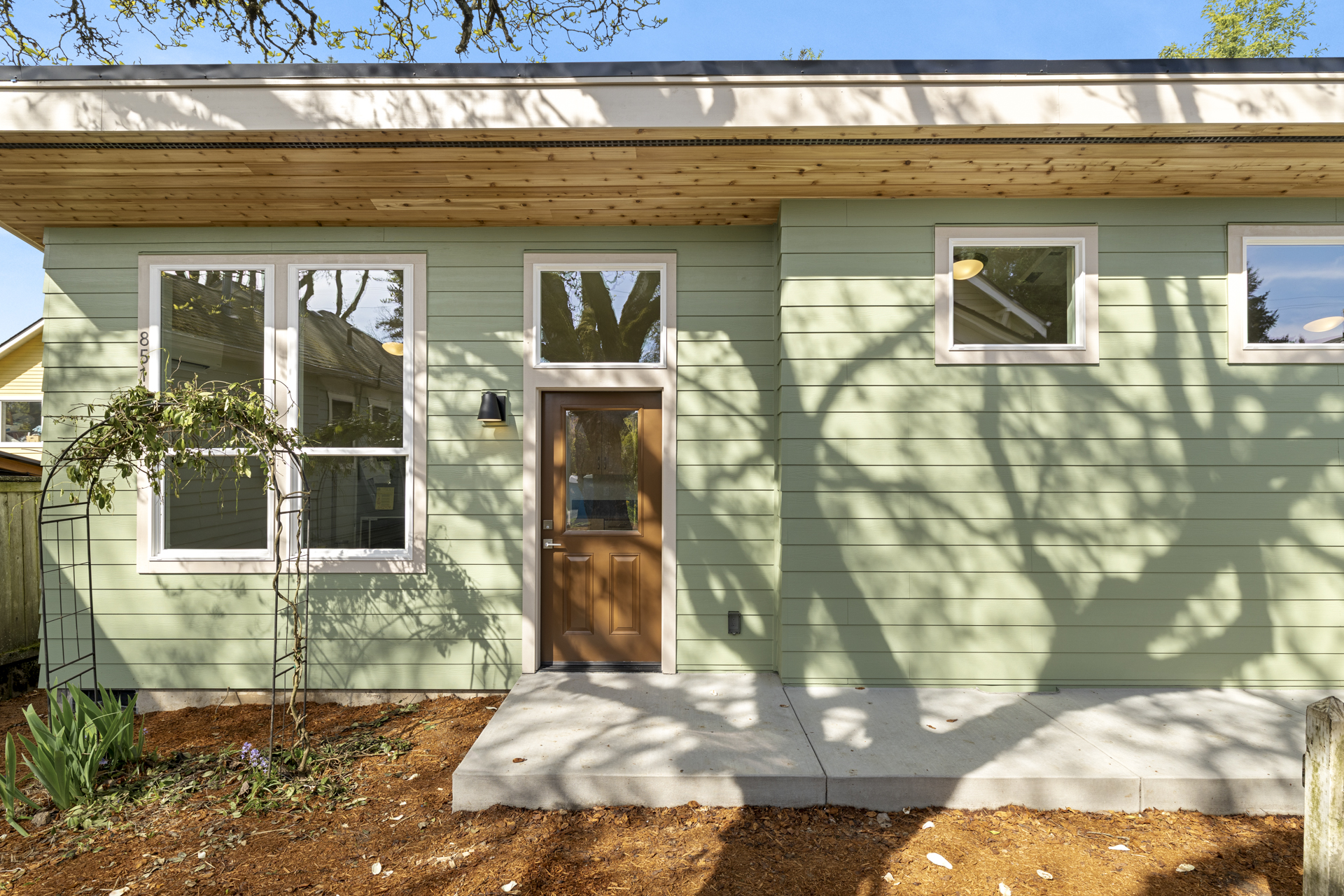 On the exterior, clean lines are complemented by warm wood soffits, adding natural texture and contrast.