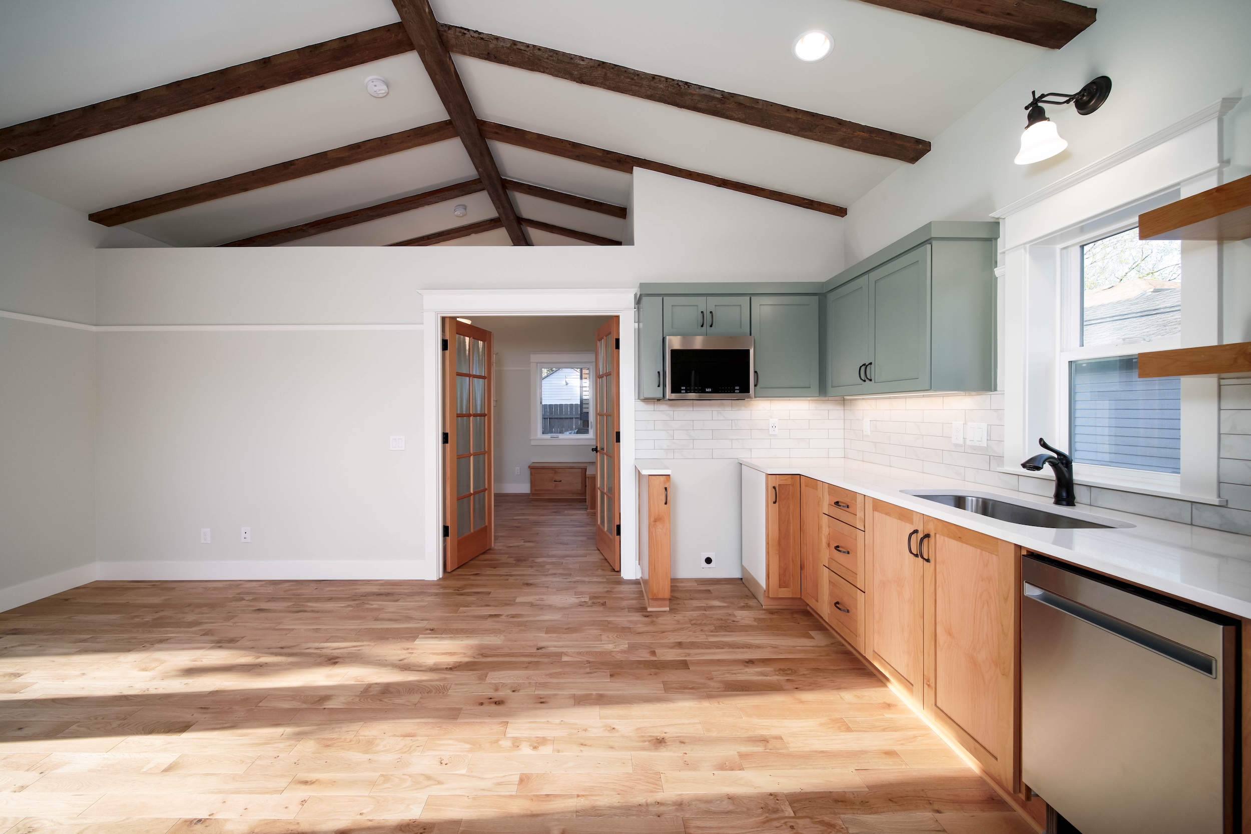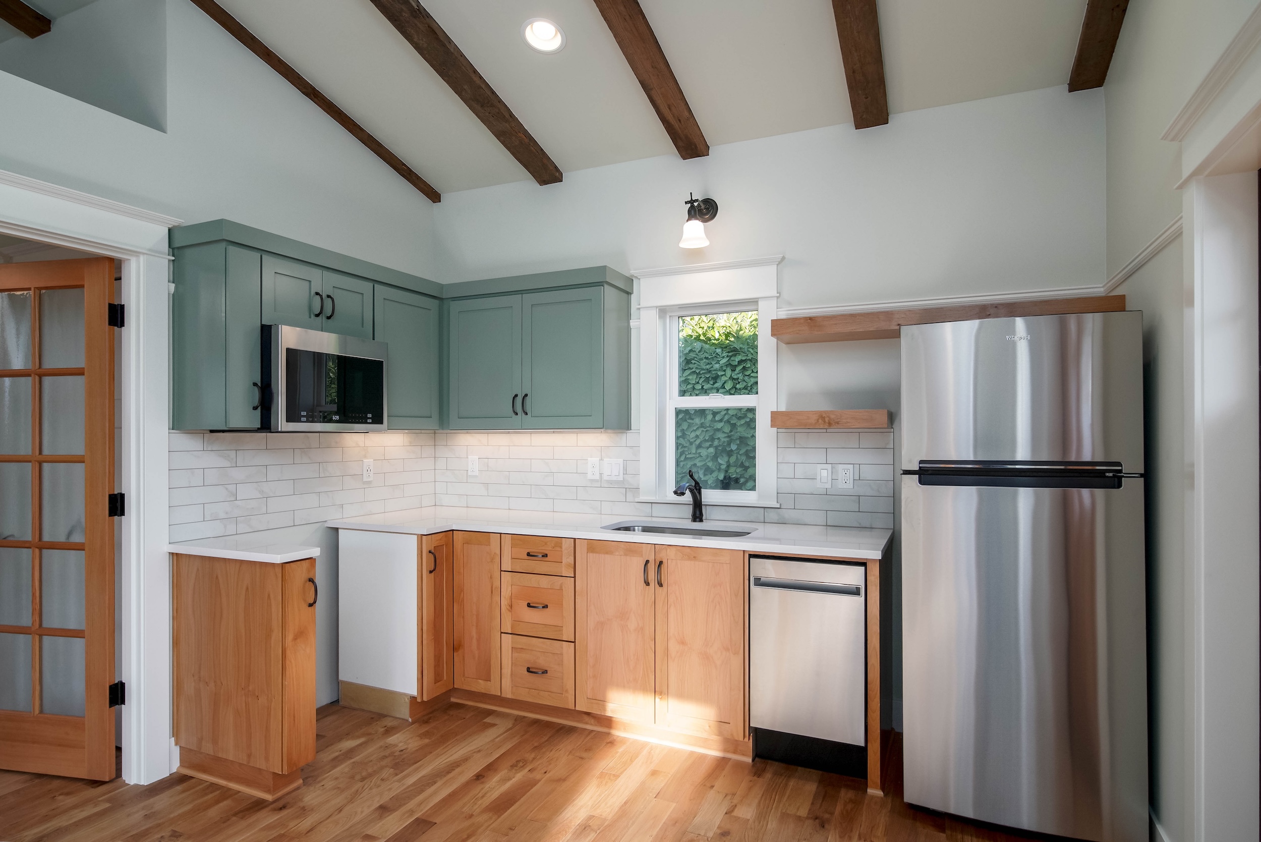 This charming ADU is filled with thoughtful details at every turn. With 437 square feet of space designed for aging-in-place, every inch was carefully planned and utilized. From the extra storage in the dining nook bench to the additional floating shelves above the refrigerator, no detail was overlooked.