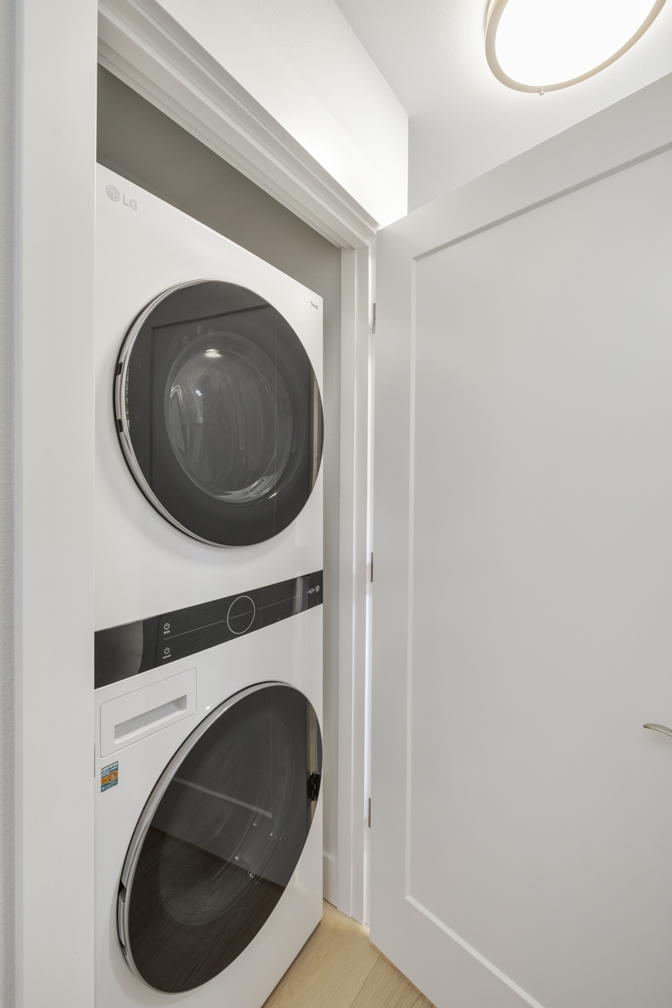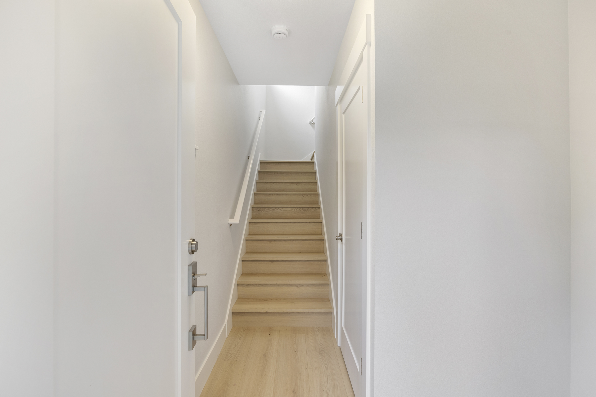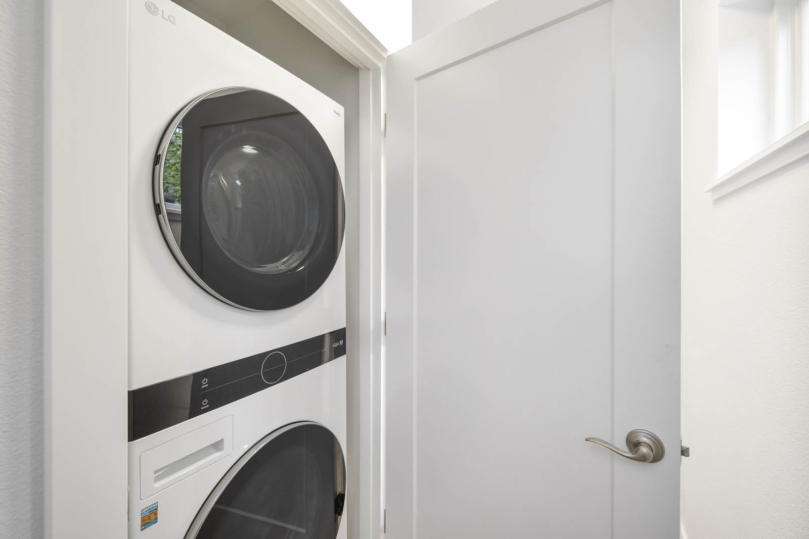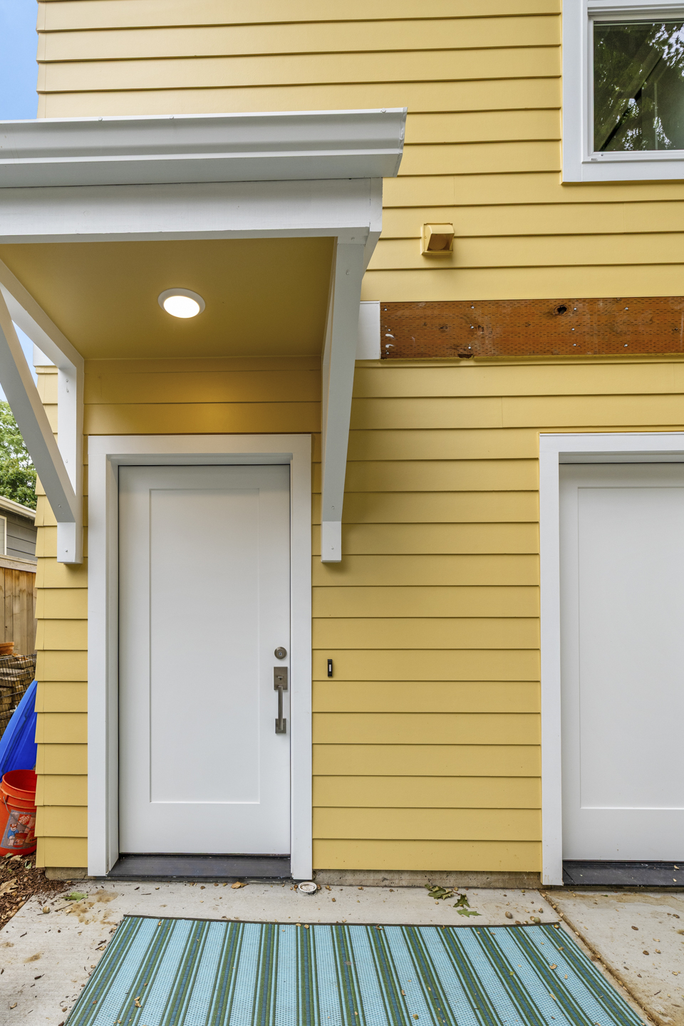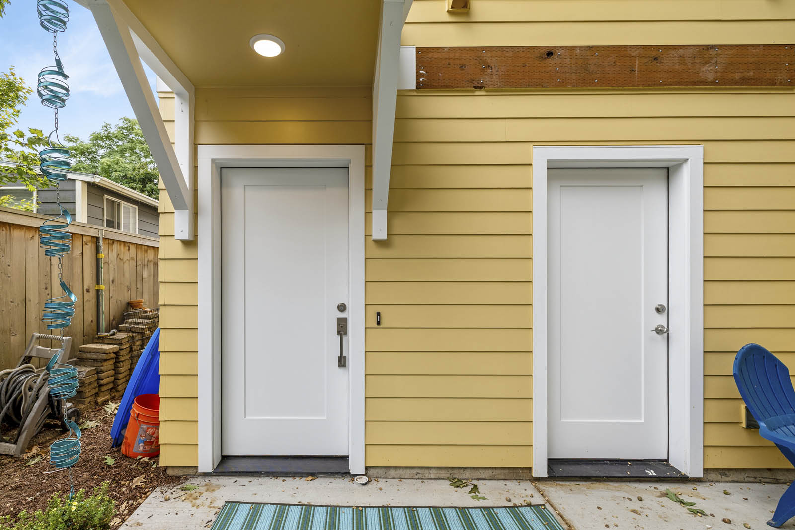 The private entry leads to a bright and colorful exterior that reflects the vibrancy of its owner, while the interior offers a soft, cozy retreat with just the right amount of separation for quiet living above. A dedicated laundry space is conveniently located in the 1st floor entry foyer.