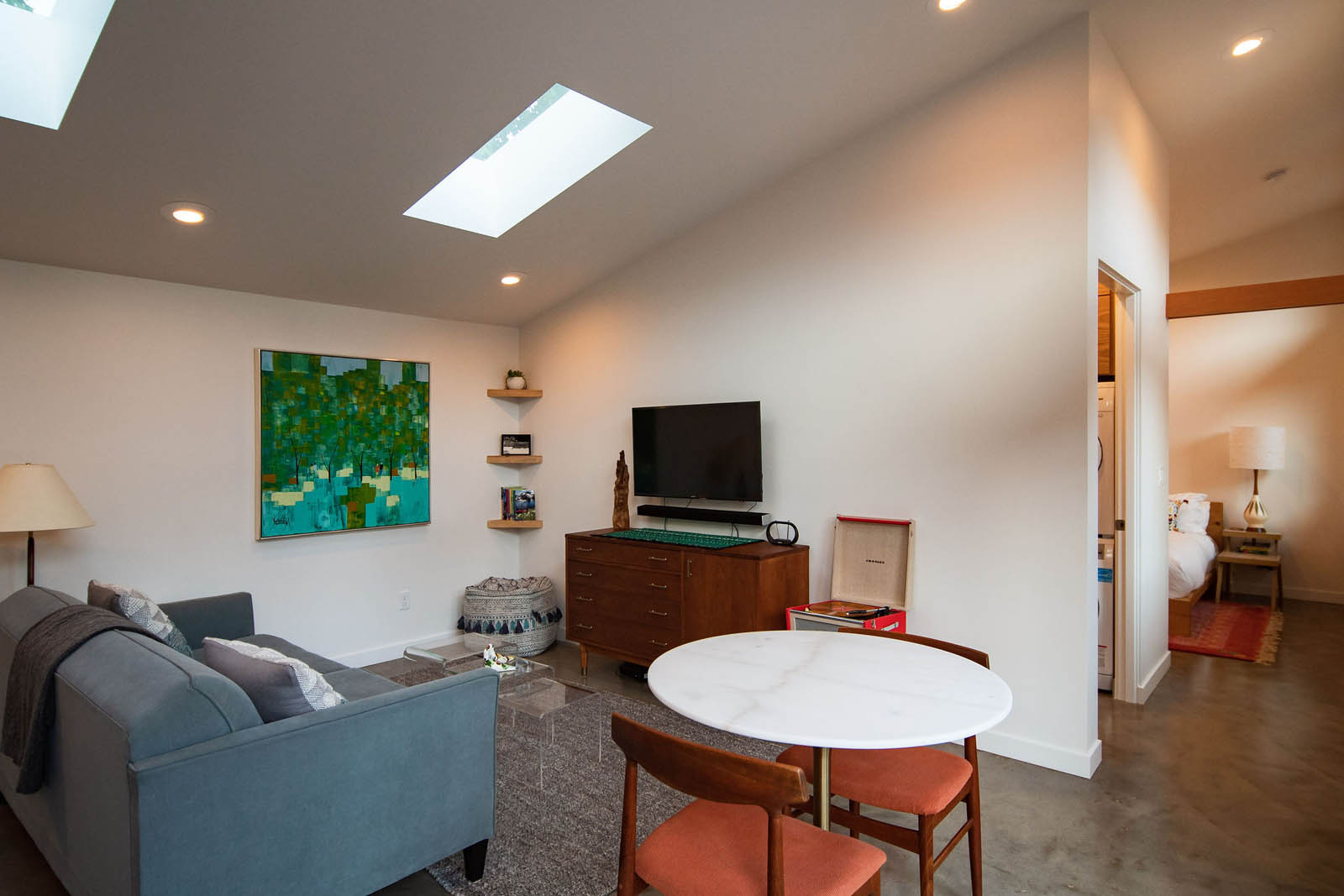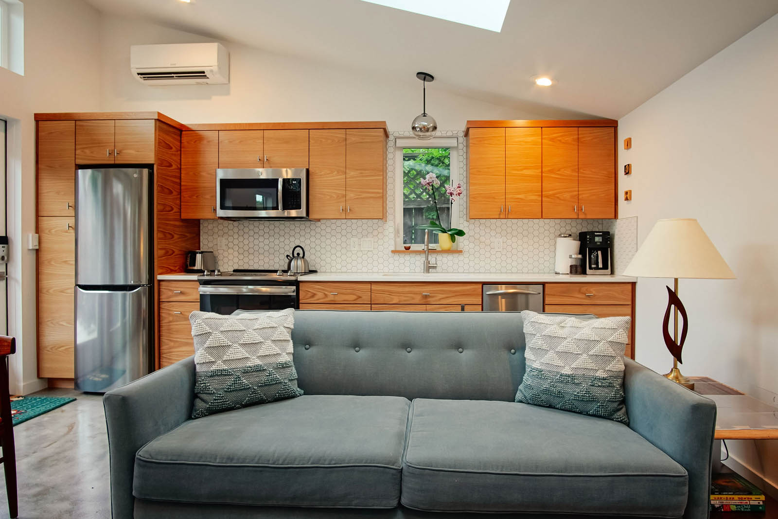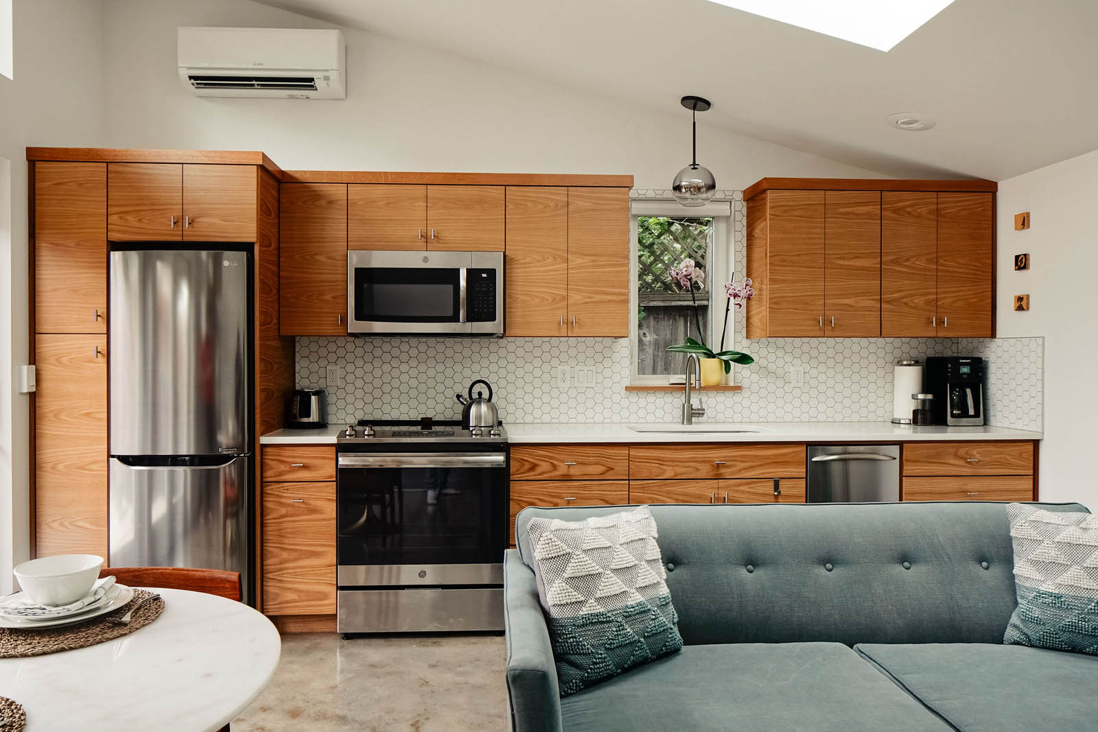 The separation of yard space between the ADU and the main home offers privacy and extends indoor-outdoor living. Inside, universal design concepts ensure accessibility, with wider door openings and a curbless shower for aging in place.