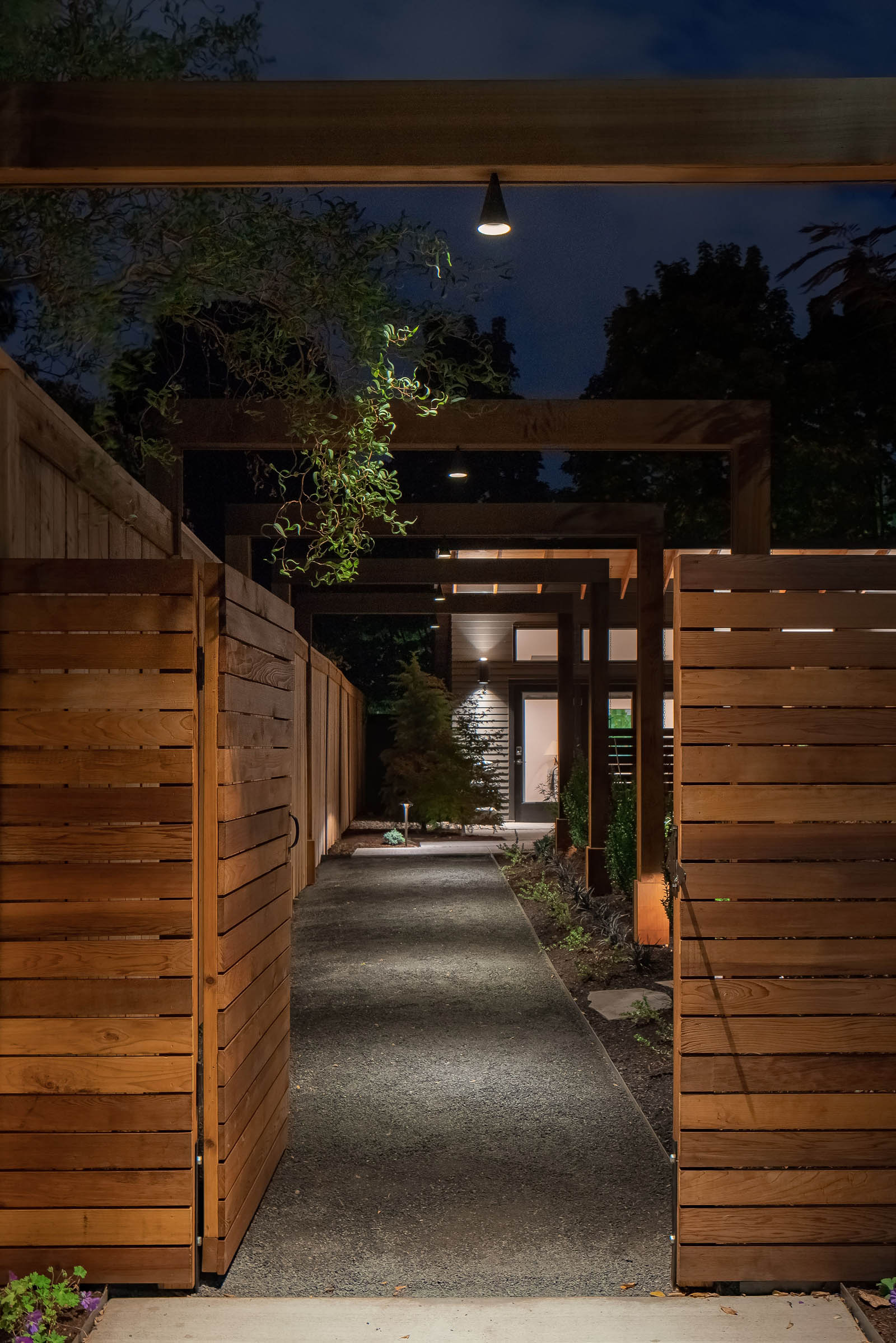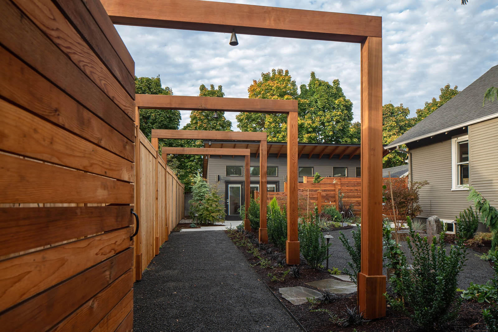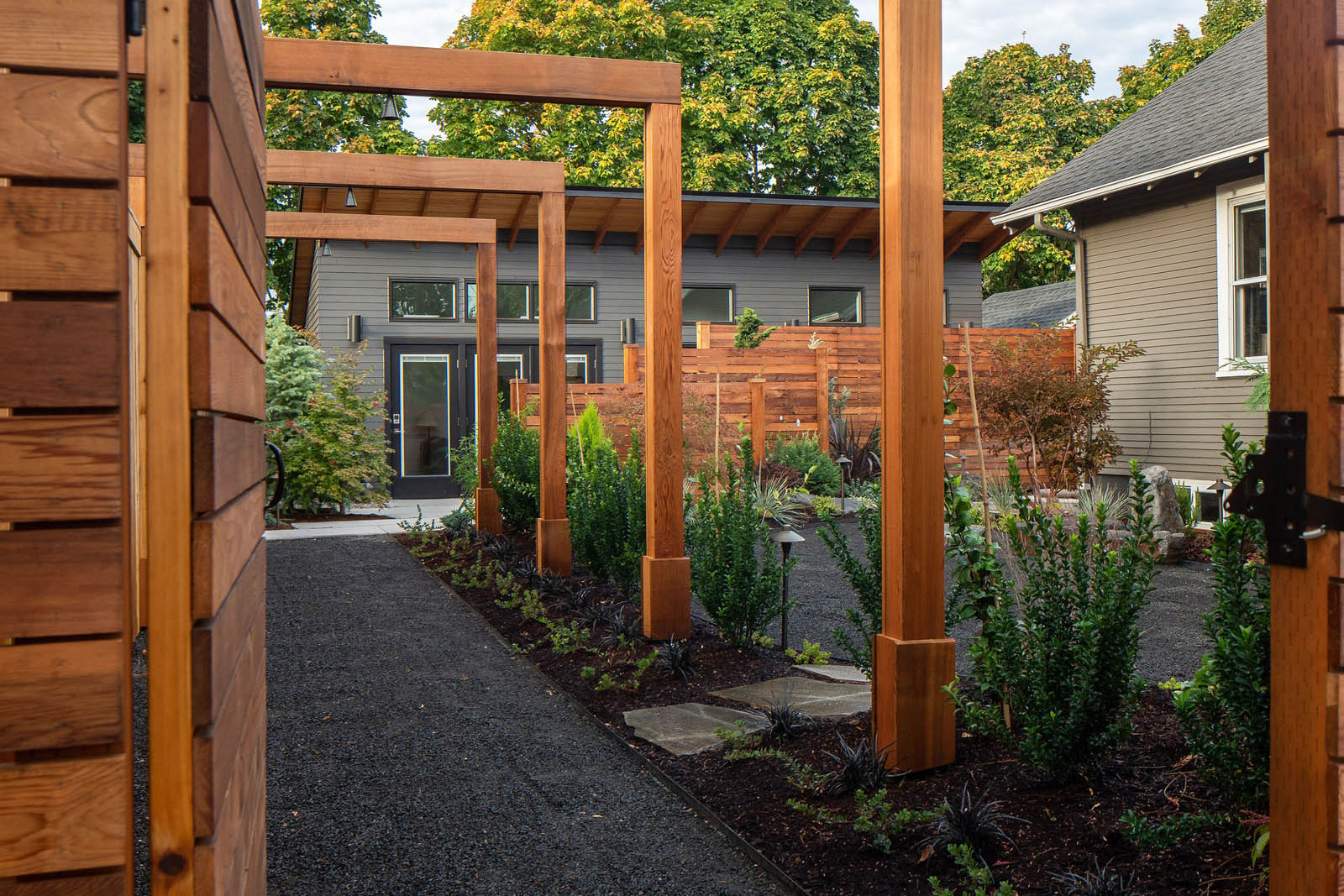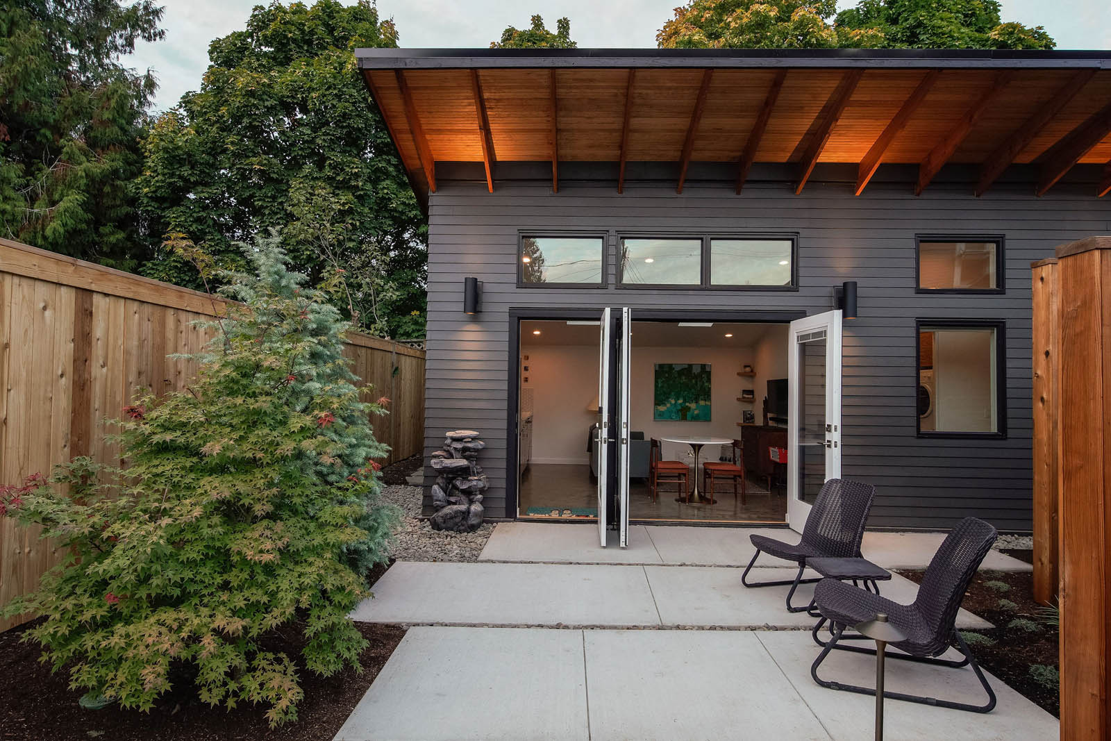 The height of the shed-style roof minimizes noise from the busy street behind the ADU, while thoughtful landscaping and hardscaping by Haven Garden Design enhances intentionality in the outdoor experience.