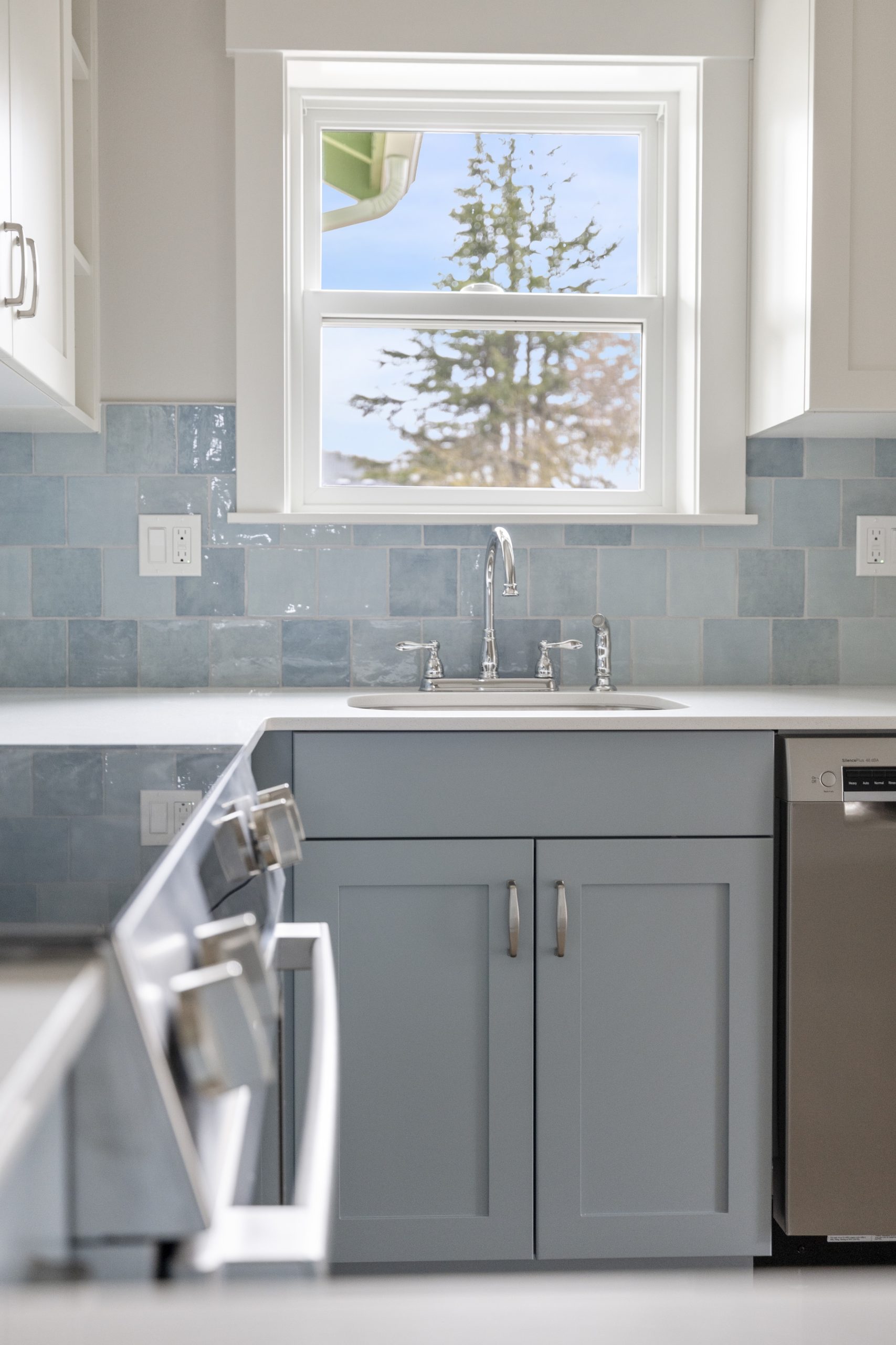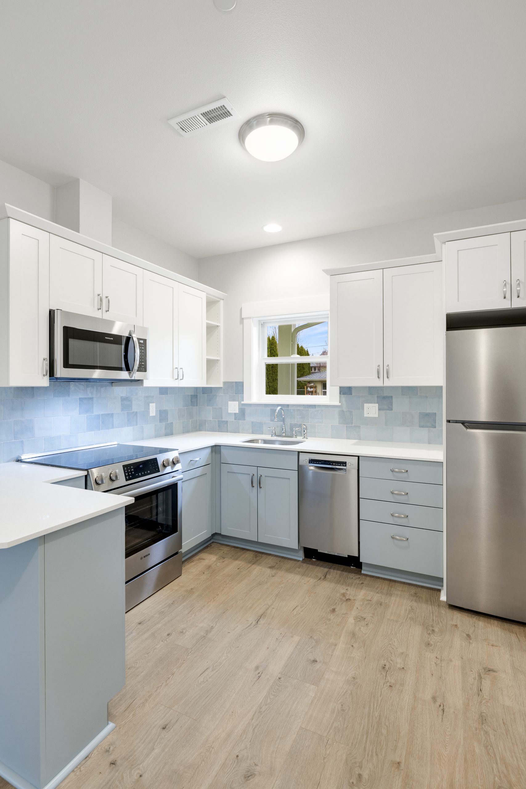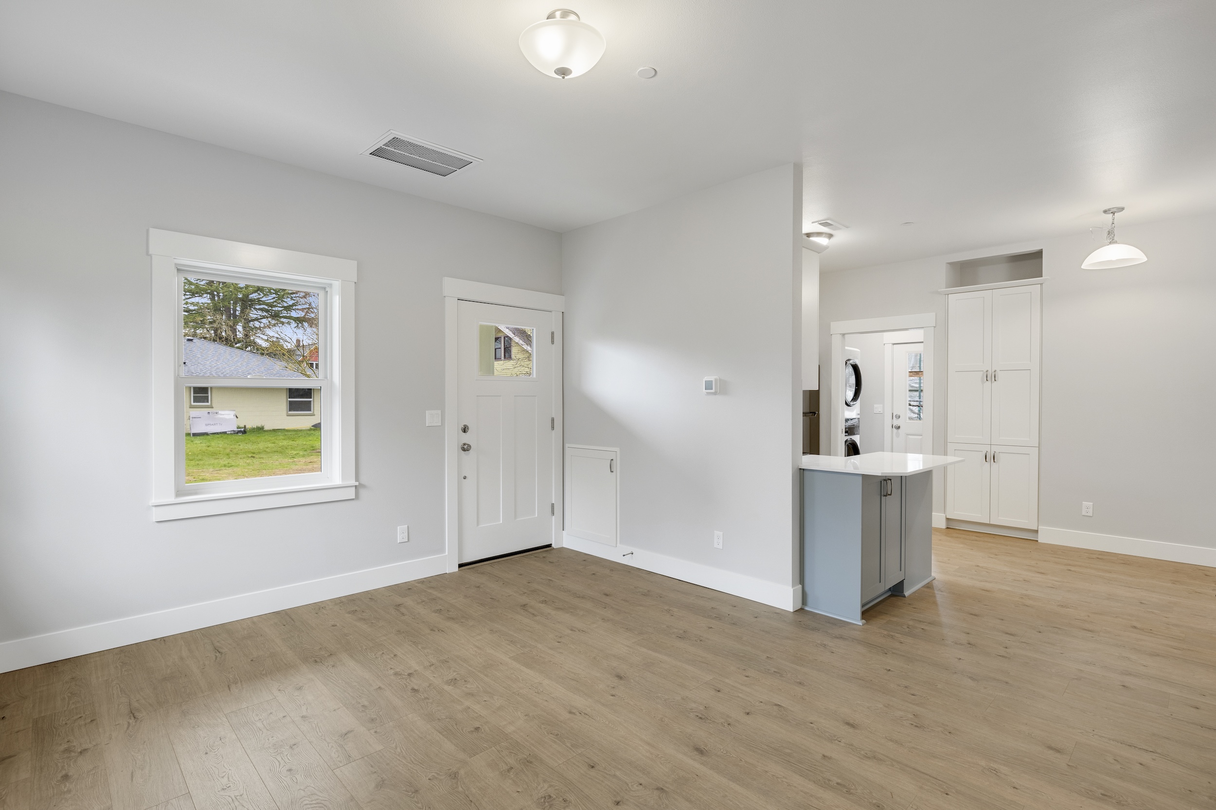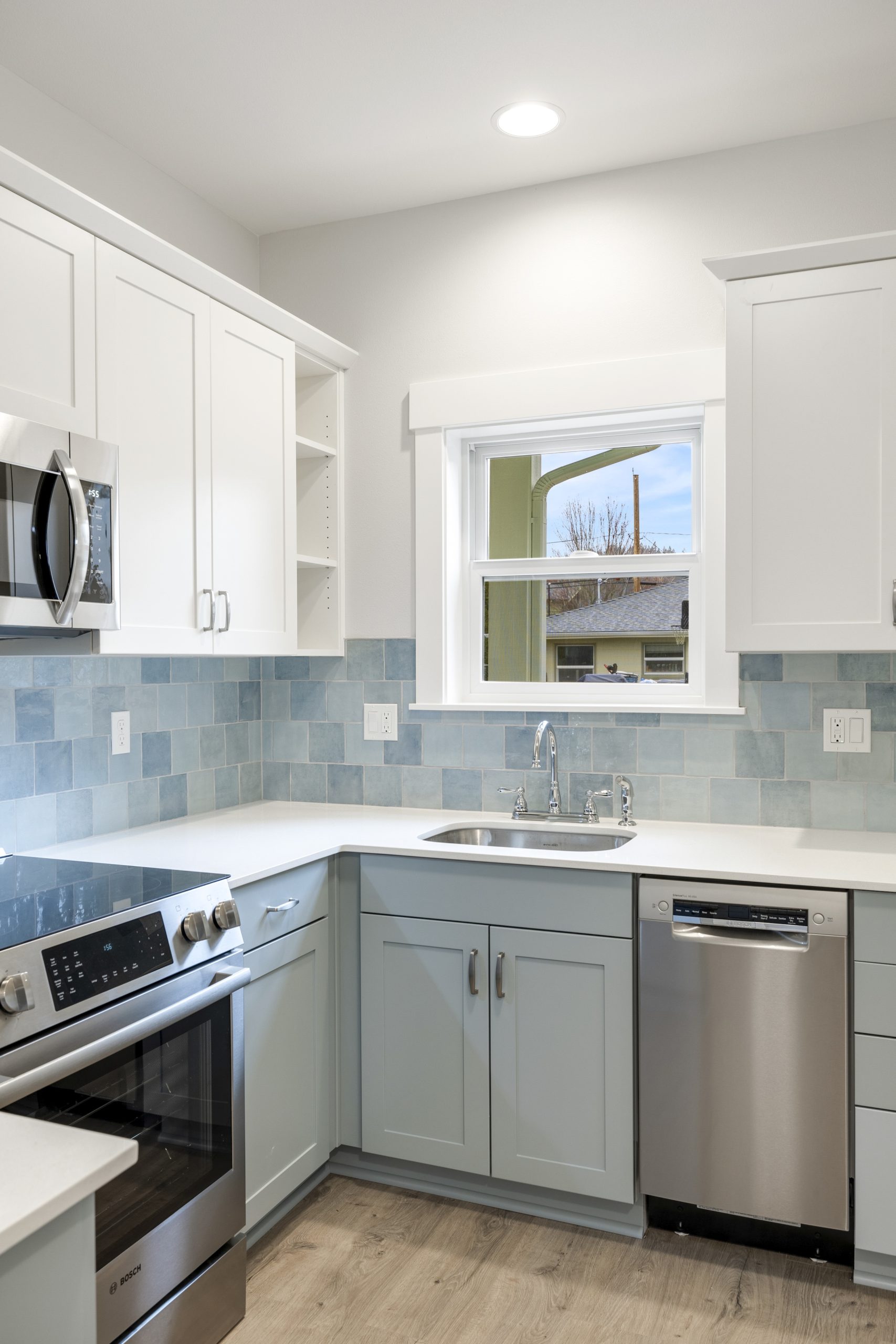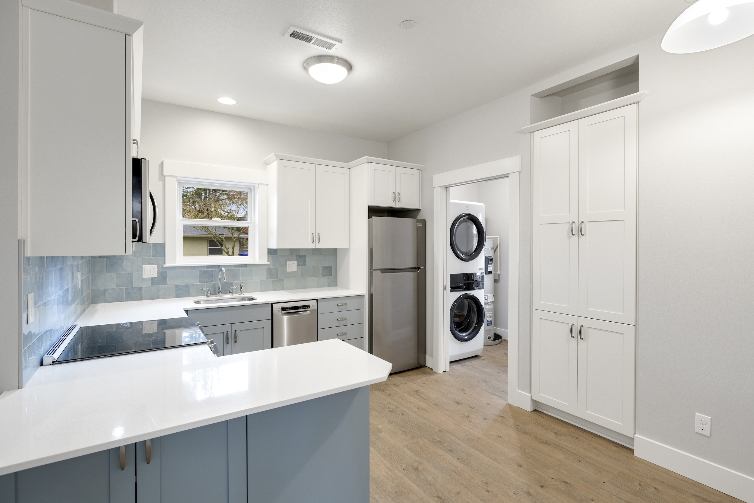 The kitchen is a favorite feature, adorned with beautiful Chloe blue tiles that reminded the client of an Oregon partly cloudy day. A cozy dining nook adds to the charm, and a side entry leads into a practical utility and laundry area. Thanks to the generous lot, the ADU enjoys both front and back yards—now ready to be transformed with the client’s landscaping vision into a lush, inviting retreat.