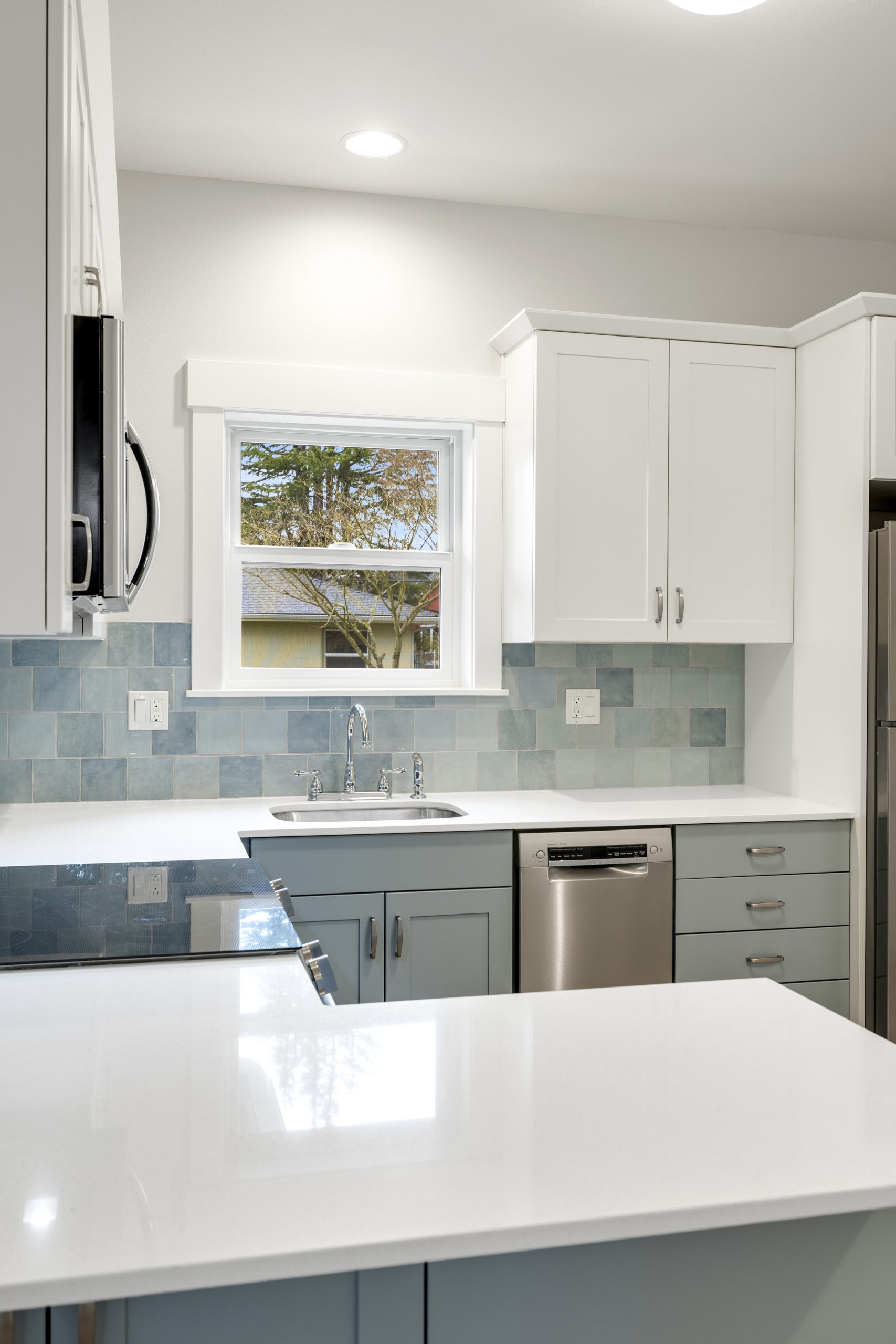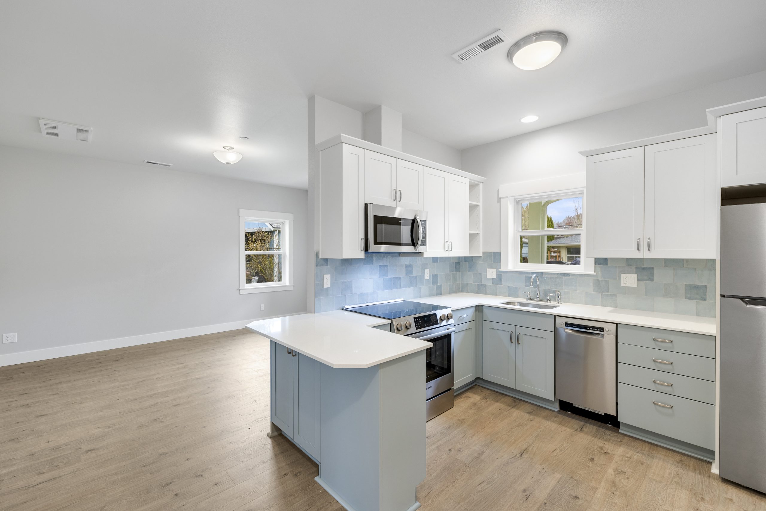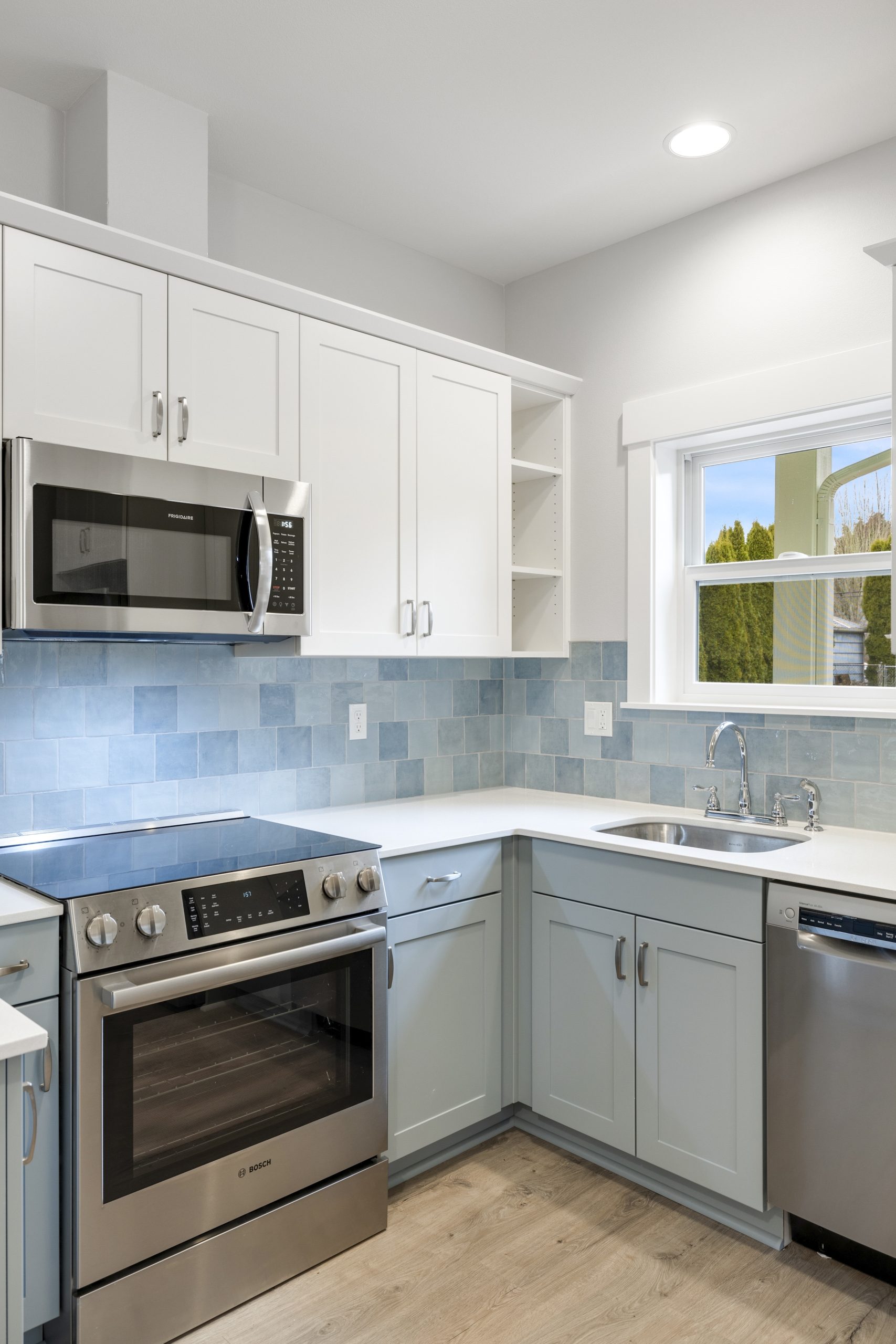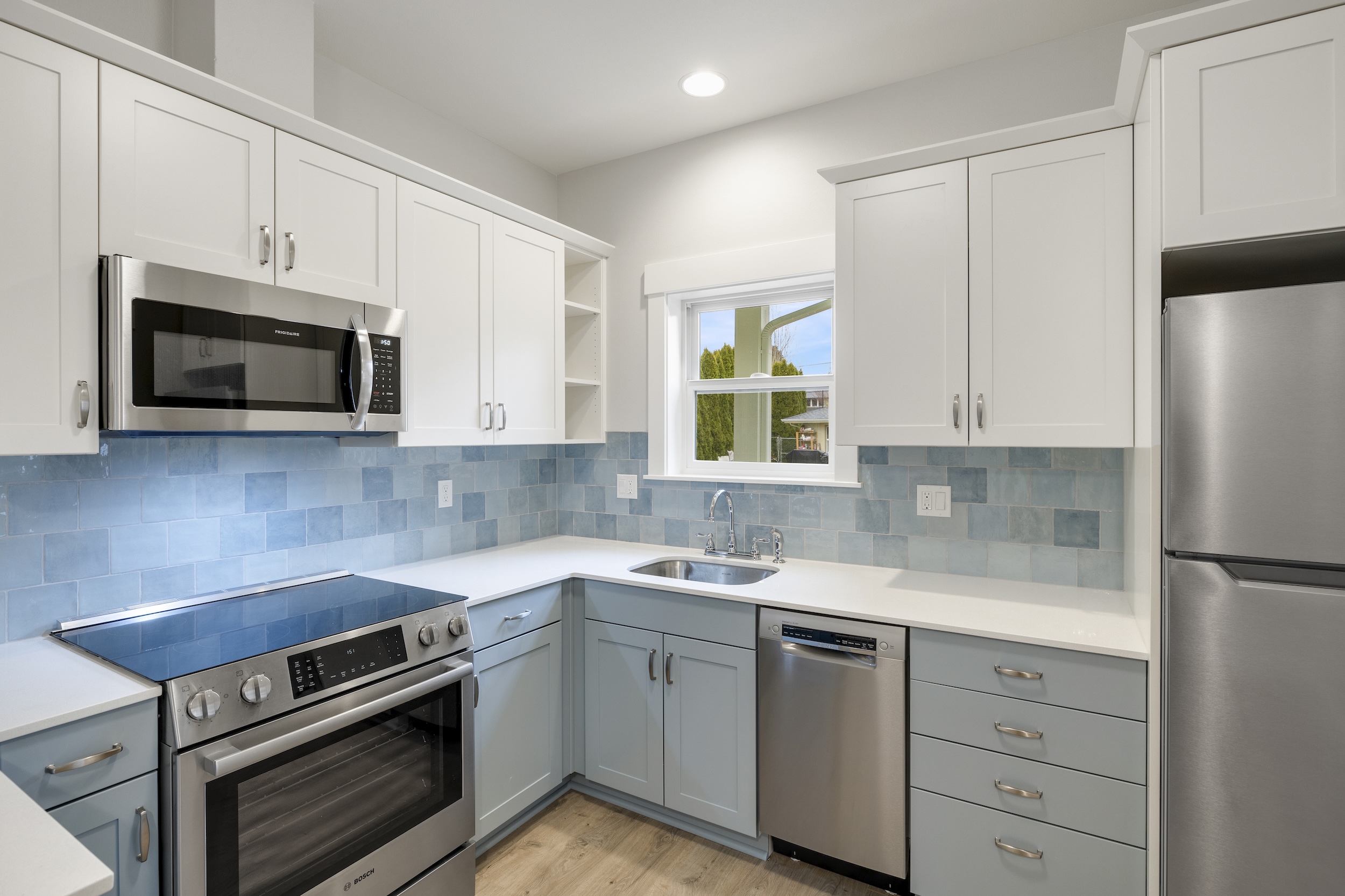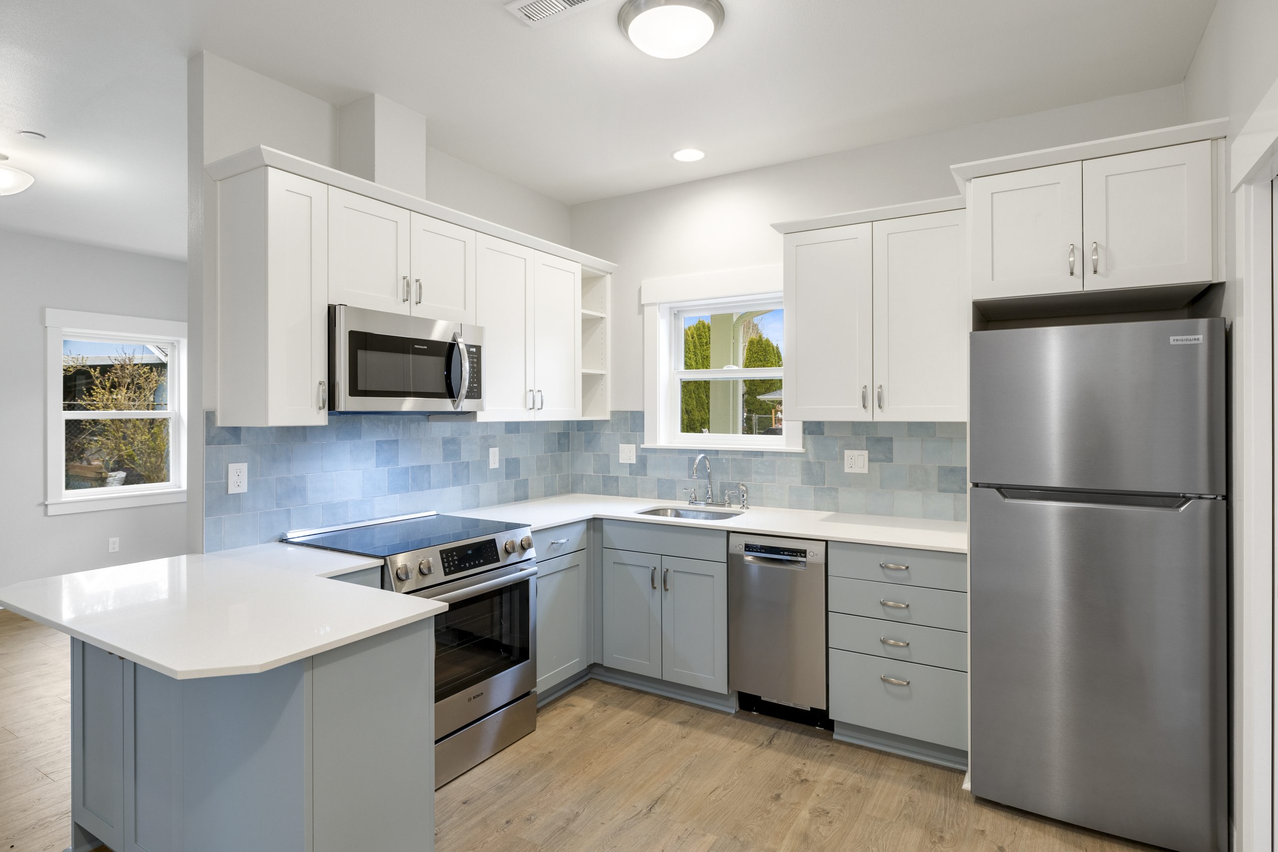 The kitchen is a favorite feature, adorned with beautiful Chloe blue tiles that reminded the client of an Oregon partly cloudy day. A cozy dining nook adds to the charm, and a side entry leads into a practical utility and laundry area. Thanks to the generous lot, the ADU enjoys both front and back yards—now ready to be transformed with the client’s landscaping vision into a lush, inviting retreat.