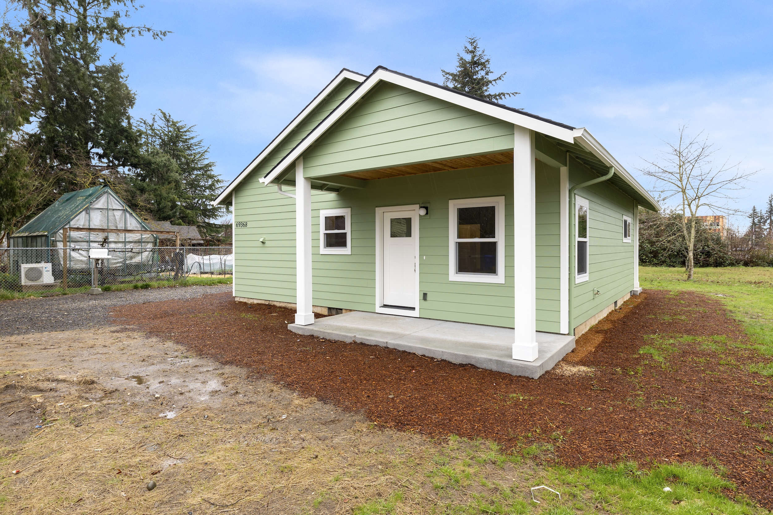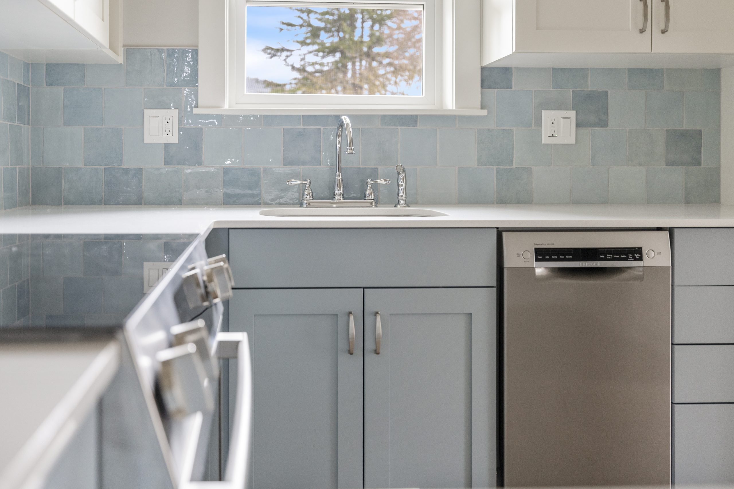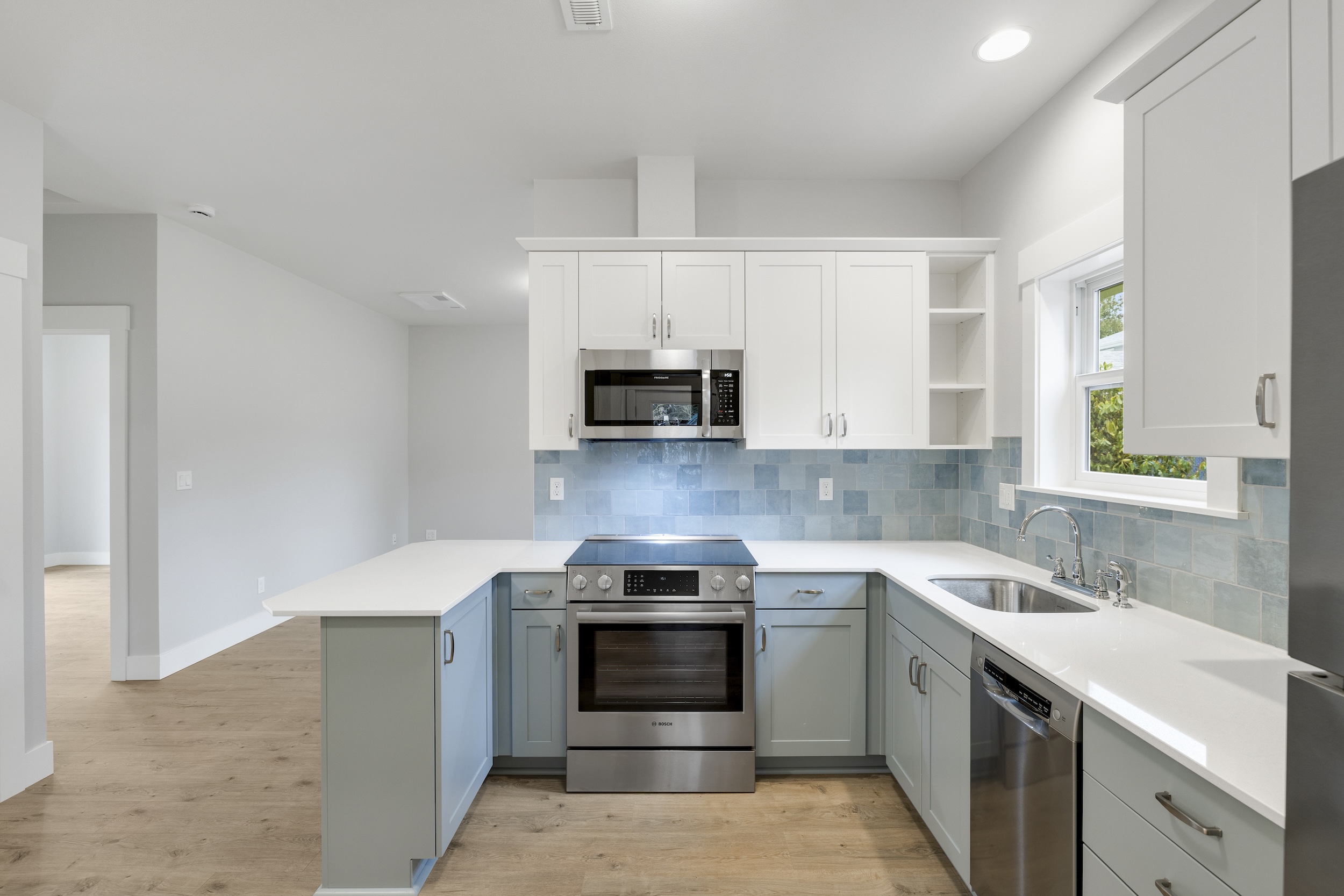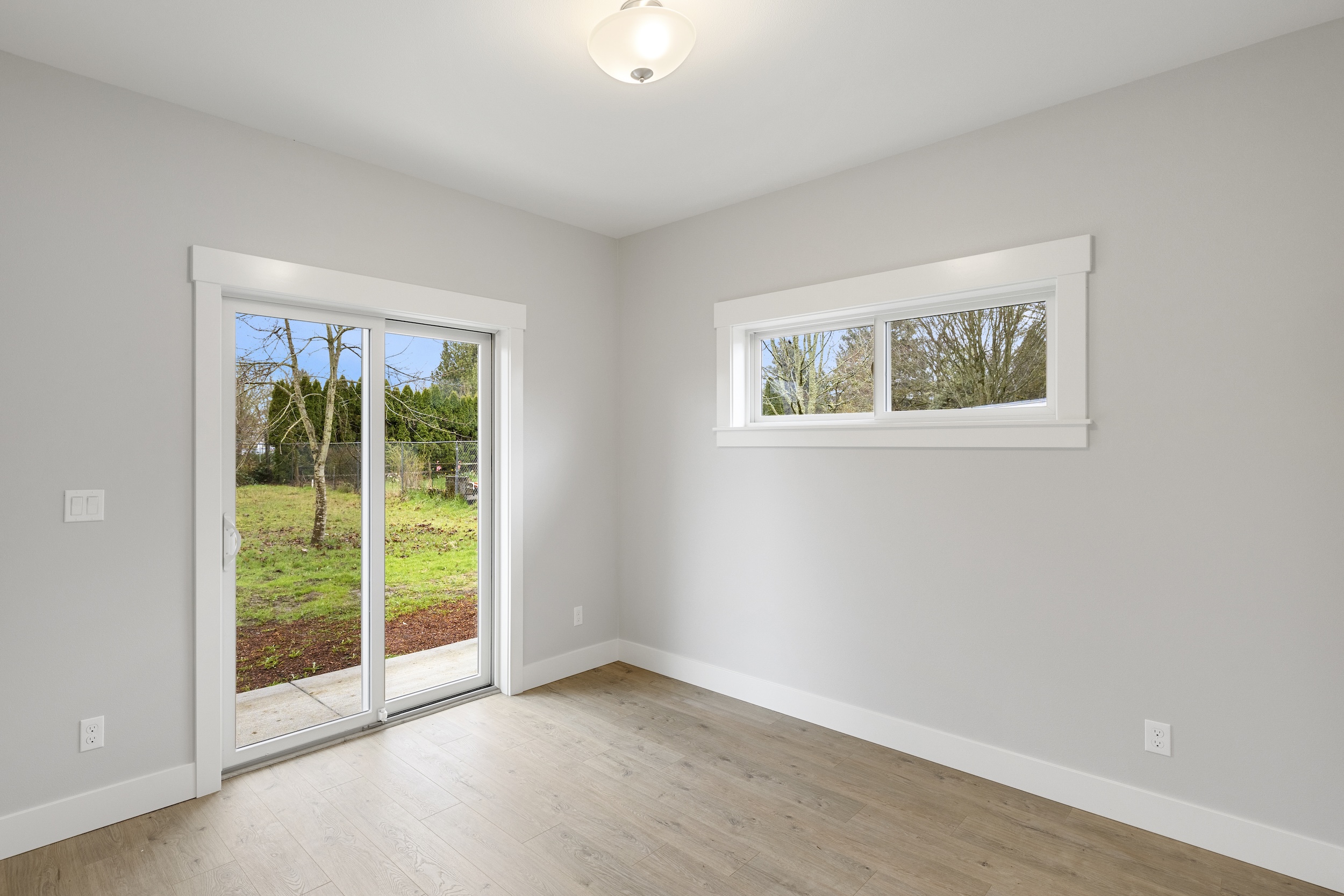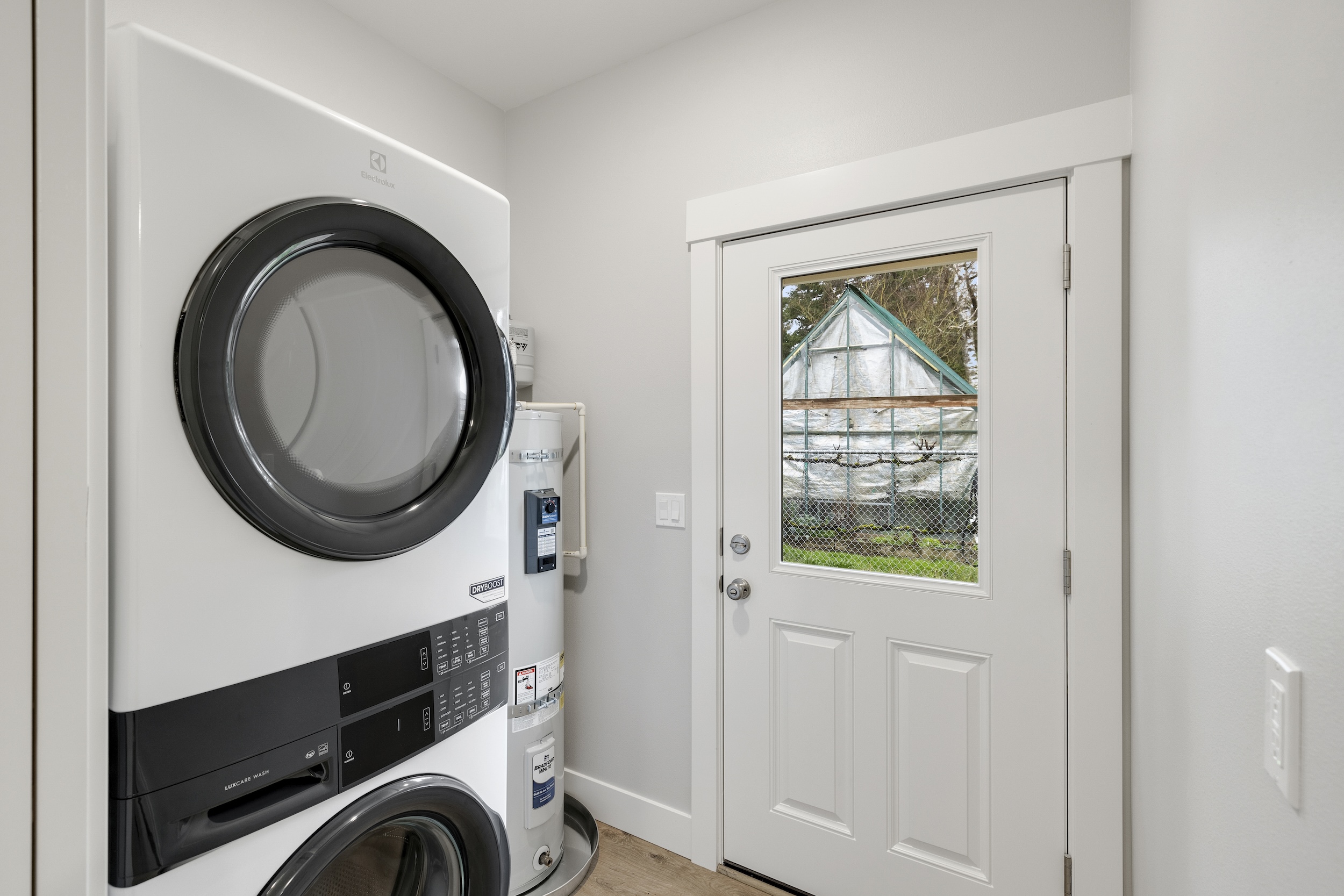 The kitchen is a favorite feature, adorned with beautiful Chloe blue tiles that reminded the client of an Oregon partly cloudy day. A cozy dining nook adds to the charm, and a side entry leads into a practical utility and laundry area. Thanks to the generous lot, the ADU enjoys both front and back yards—now ready to be transformed with the client’s landscaping vision into a lush, inviting retreat.