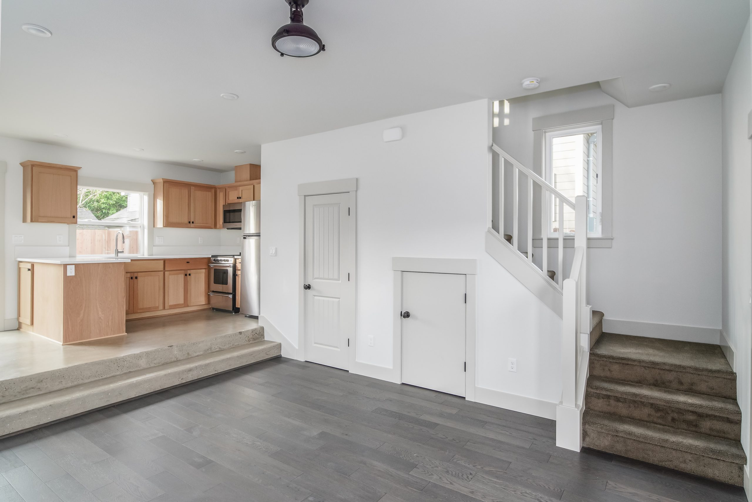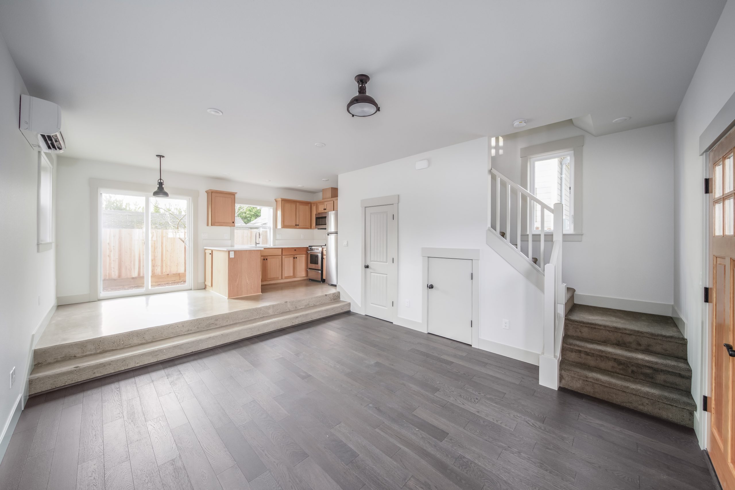 The first level boasts an inviting kitchen, cozy living room, and convenient half bath, all set against an exposed concrete floor for a touch of industrial chic. Upstairs, two bedrooms and a full bath await, complete with plush carpeting for added comfort.
