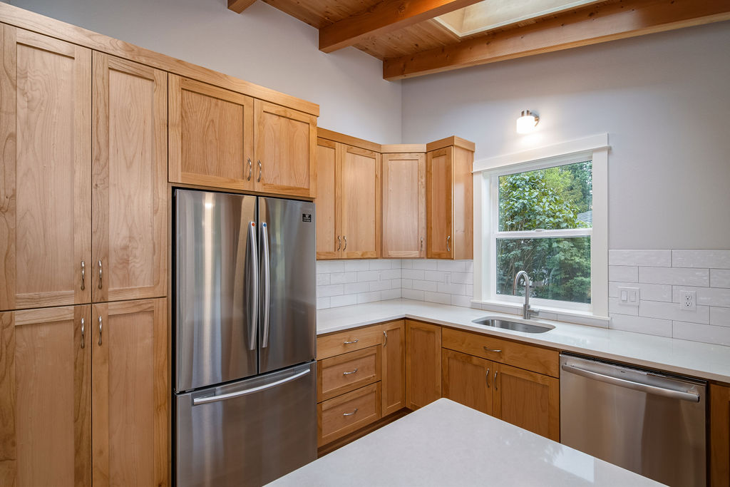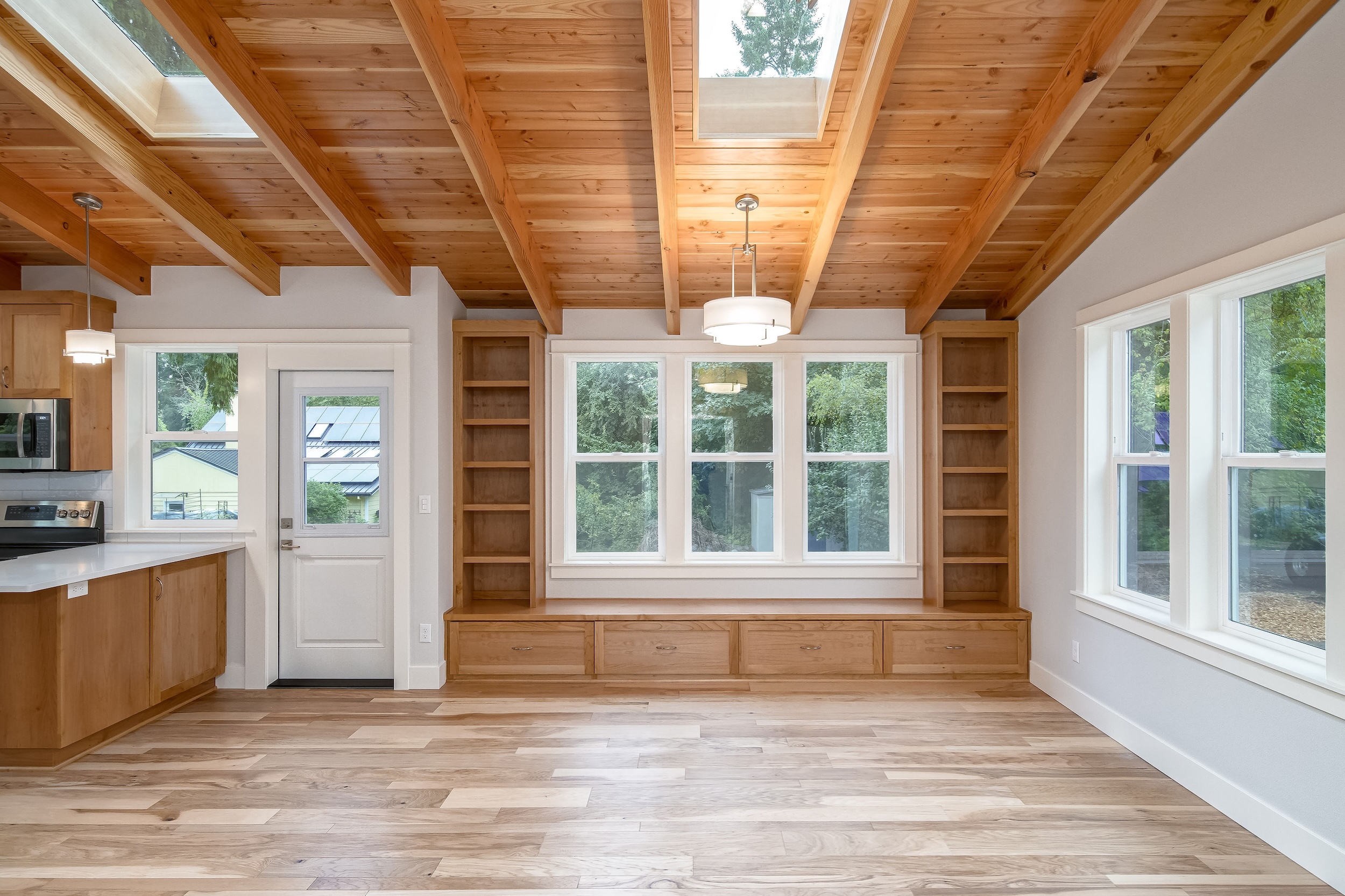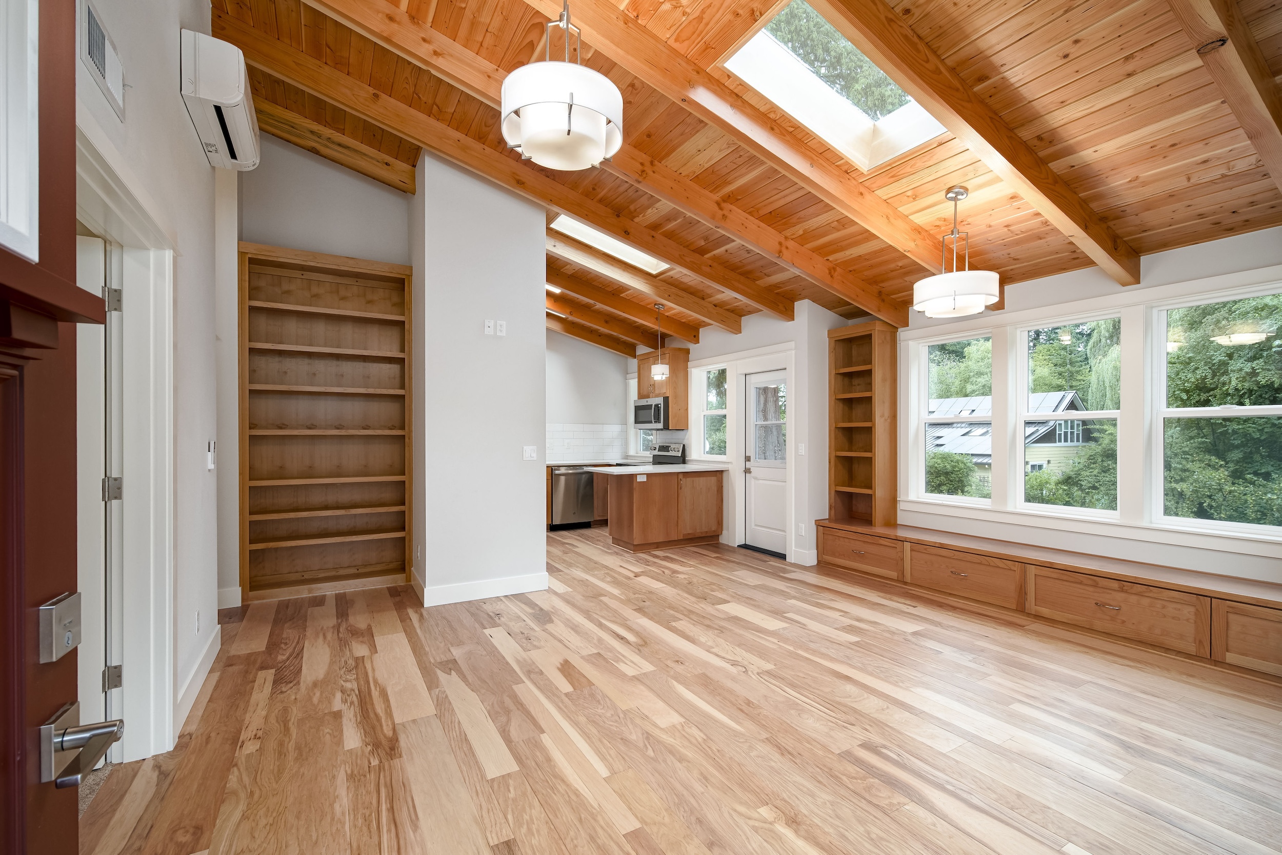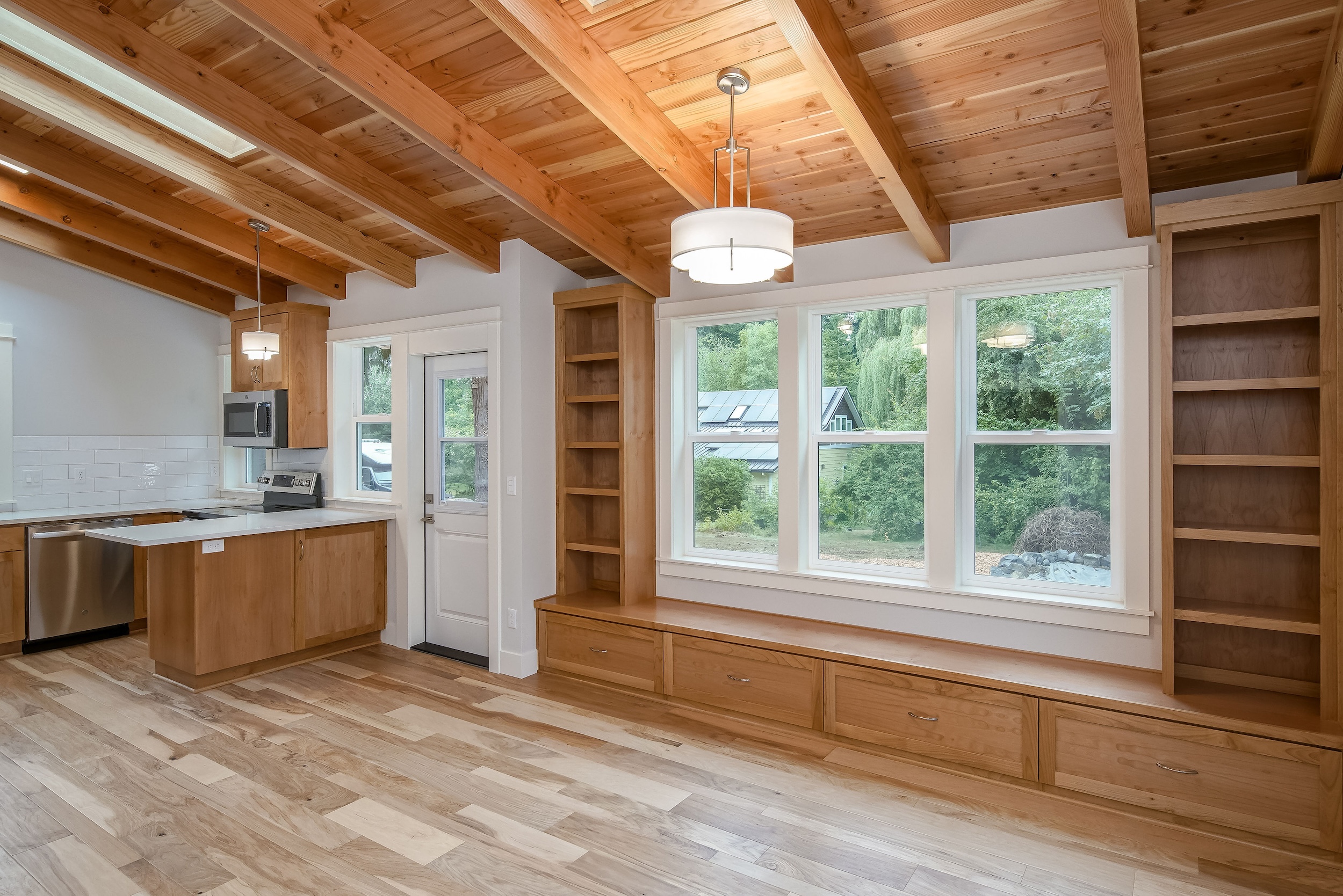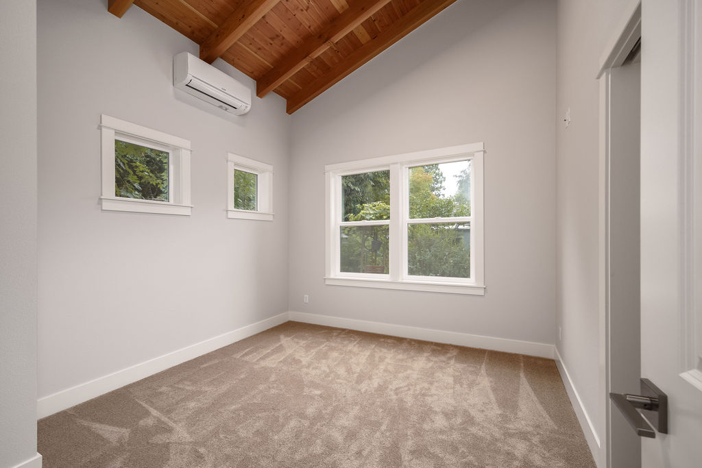 The Shaw’s modern contemporary ADU features vaulted ceilings, exposed beams, and a tongue-and-groove aesthetic. This spacious 800 square foot dwelling exudes sophistication, with its built-in cabinets and window bench enhancing both functionality and style.