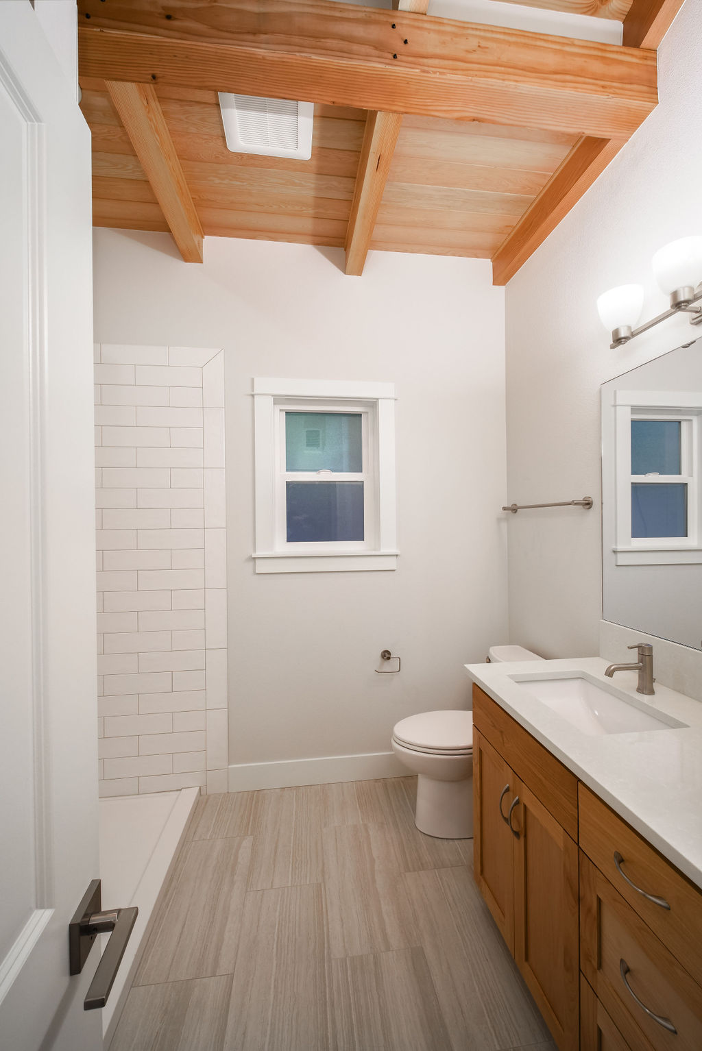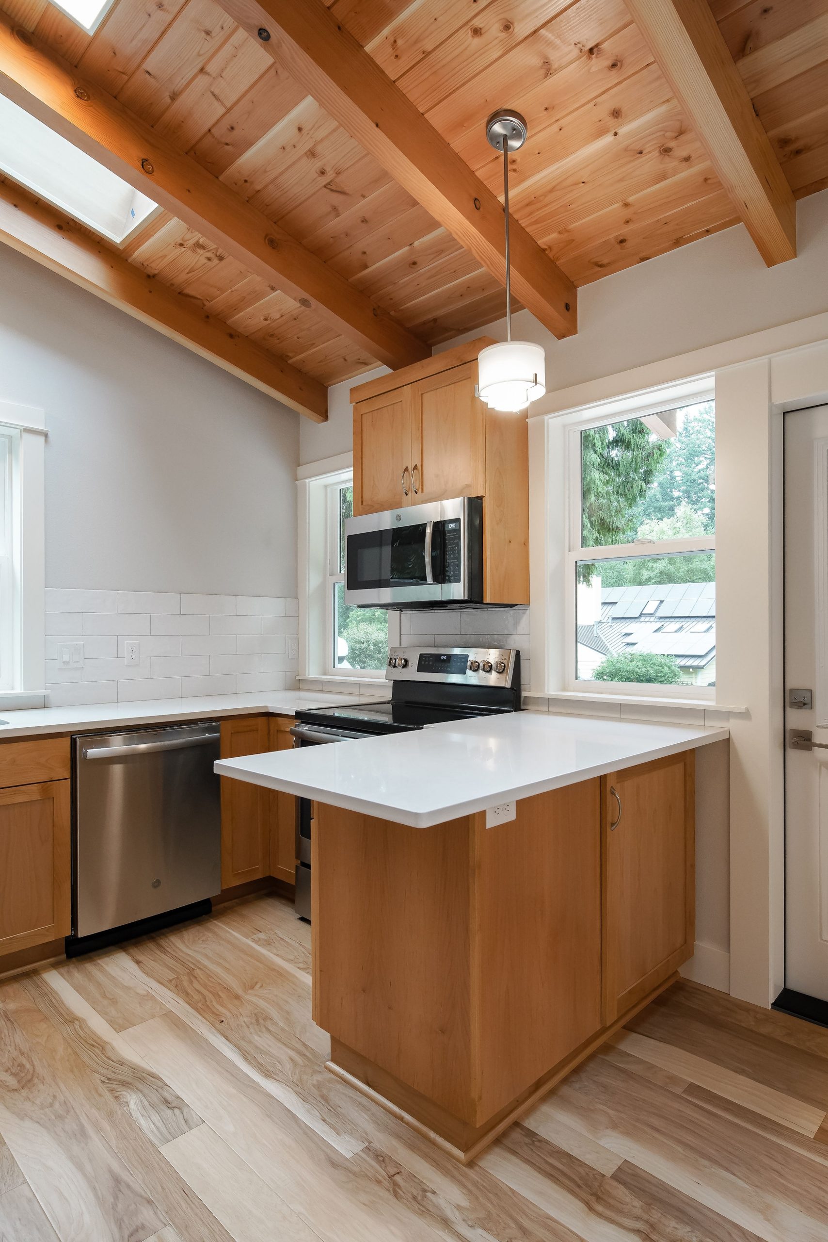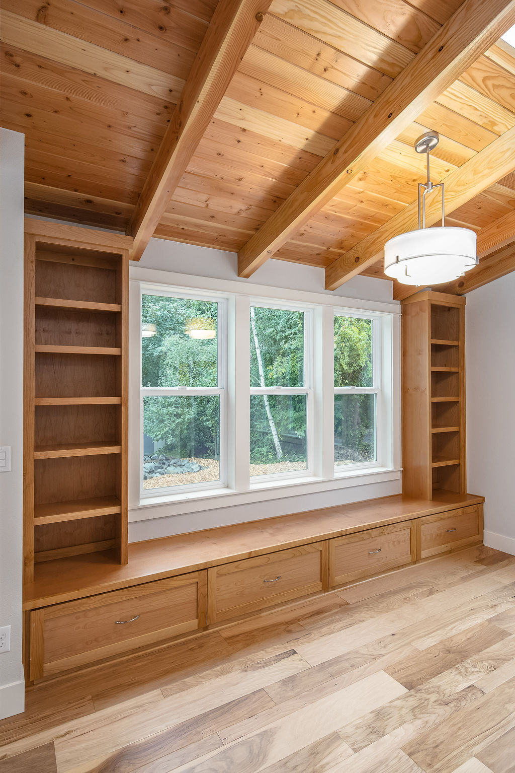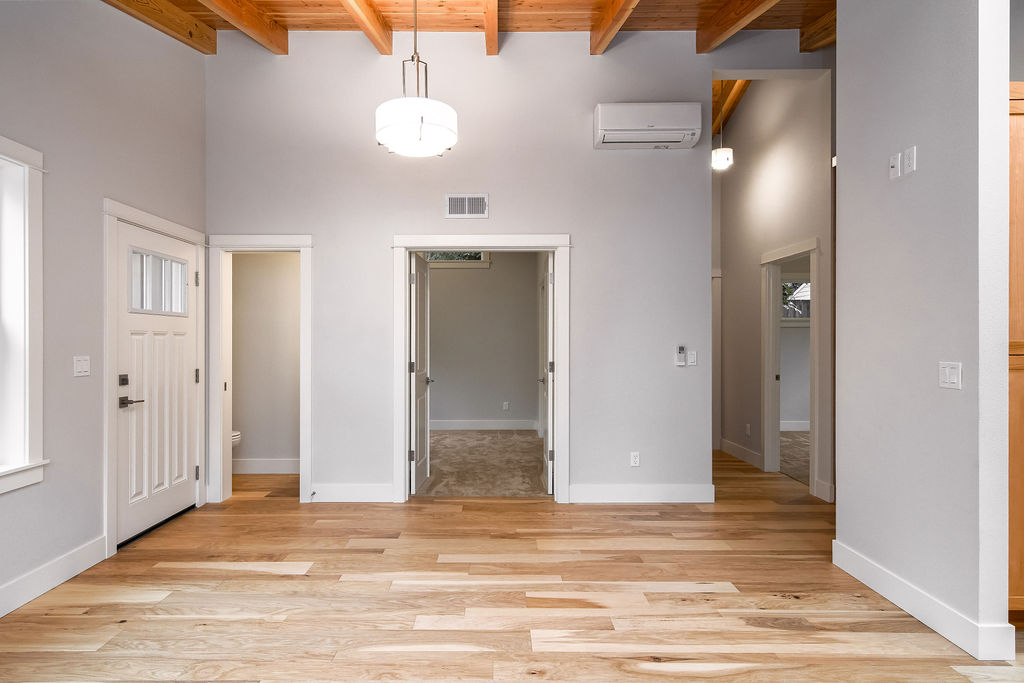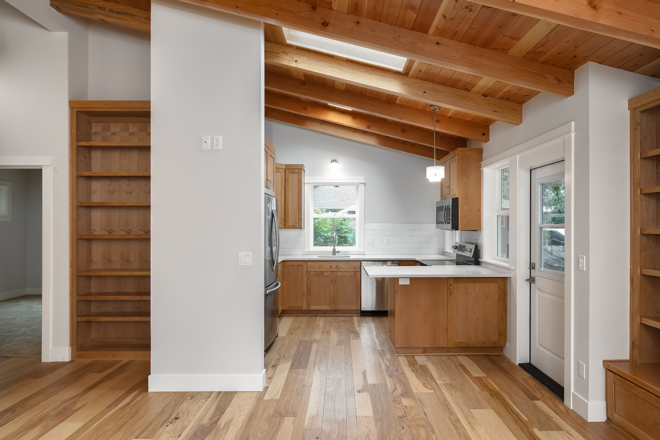 The Shaw’s modern contemporary ADU features vaulted ceilings, exposed beams, and a tongue-and-groove aesthetic. This spacious 800 square foot dwelling exudes sophistication, with its built-in cabinets and window bench enhancing both functionality and style.