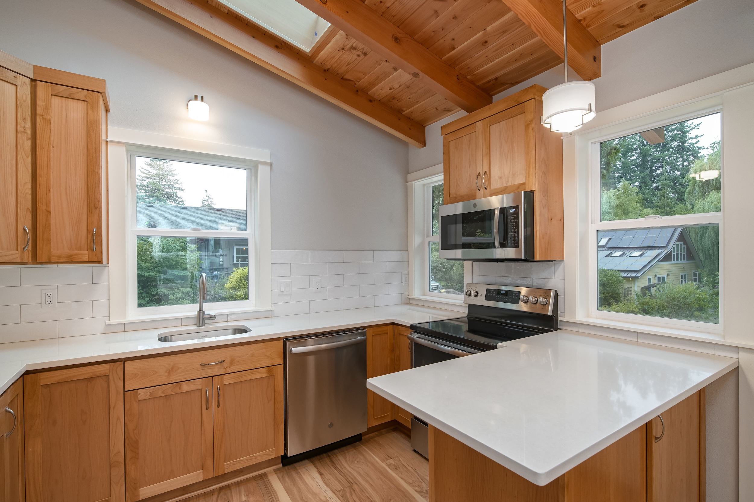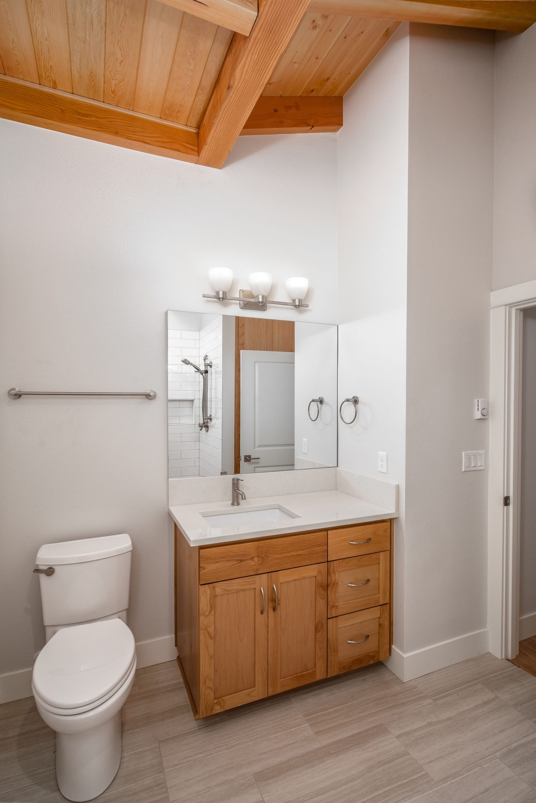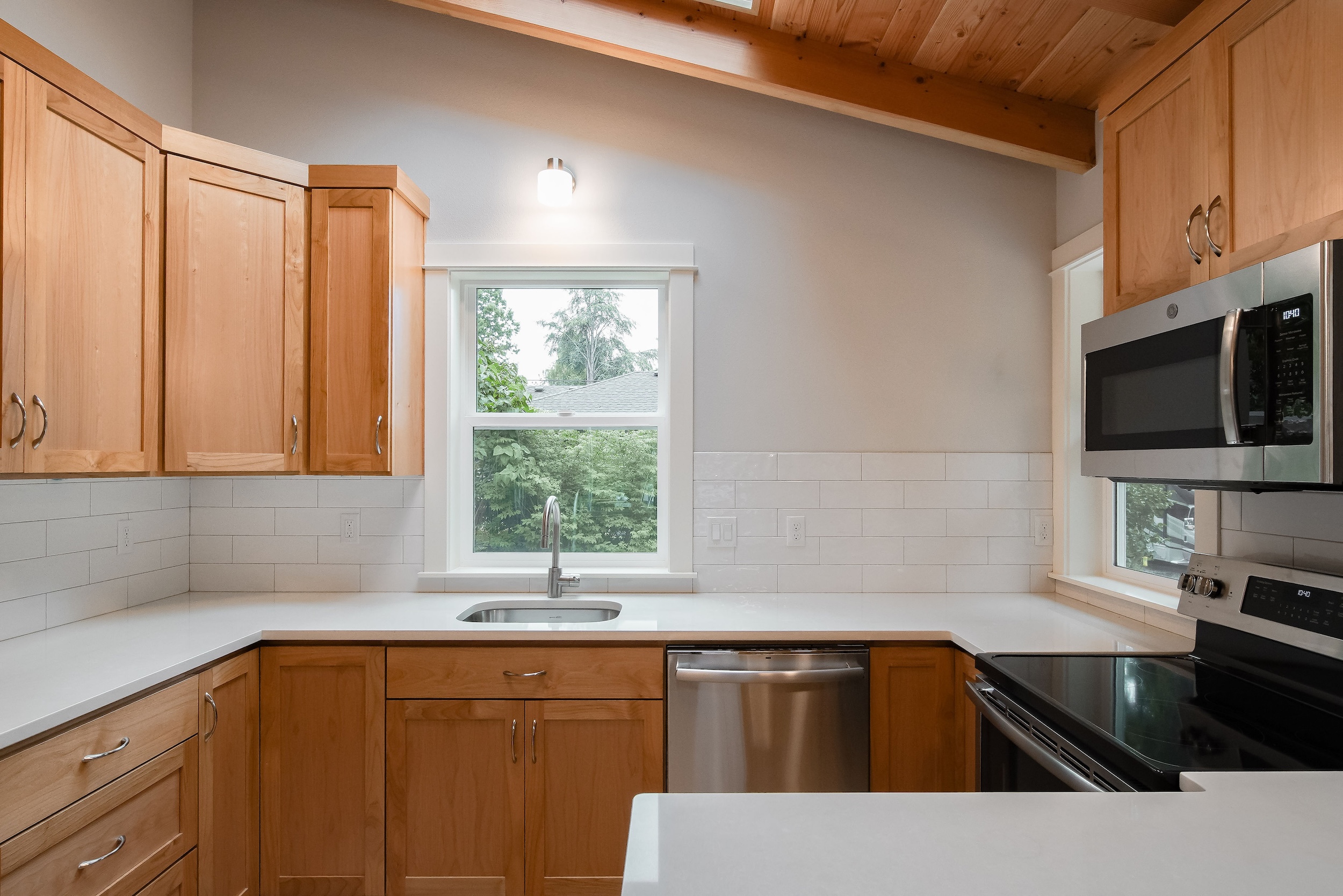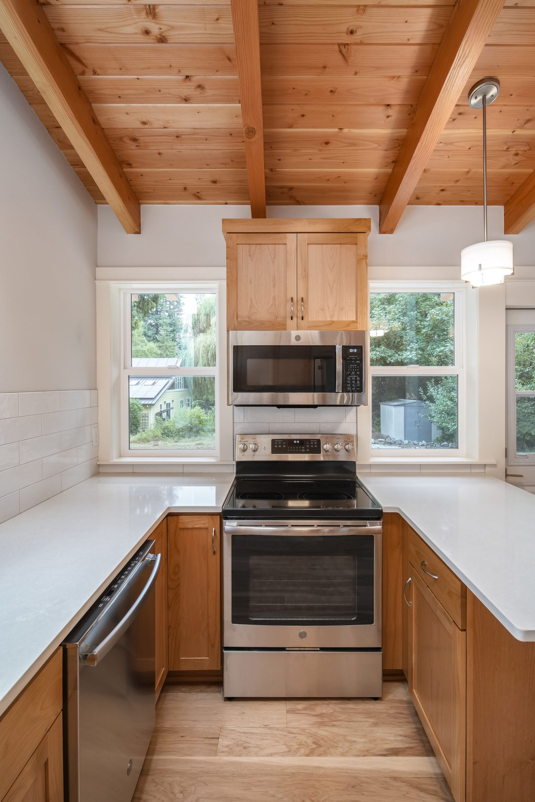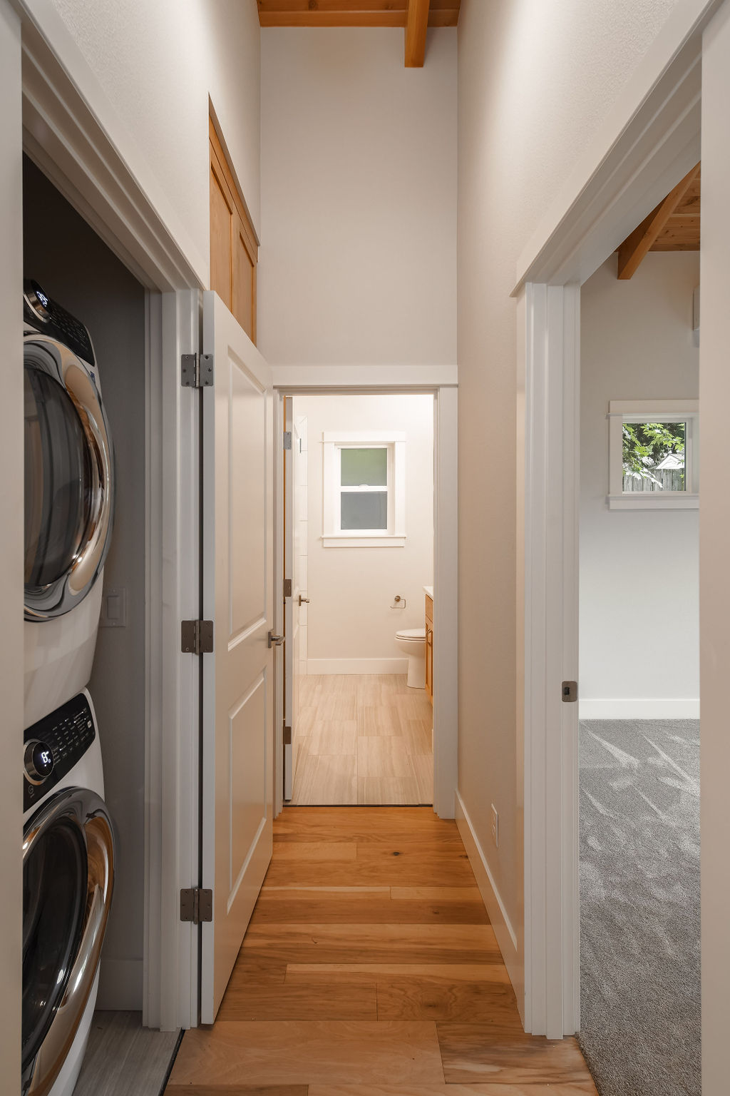 The Shaw’s modern contemporary ADU features vaulted ceilings, exposed beams, and a tongue-and-groove aesthetic. This spacious 800 square foot dwelling exudes sophistication, with its built-in cabinets and window bench enhancing both functionality and style.