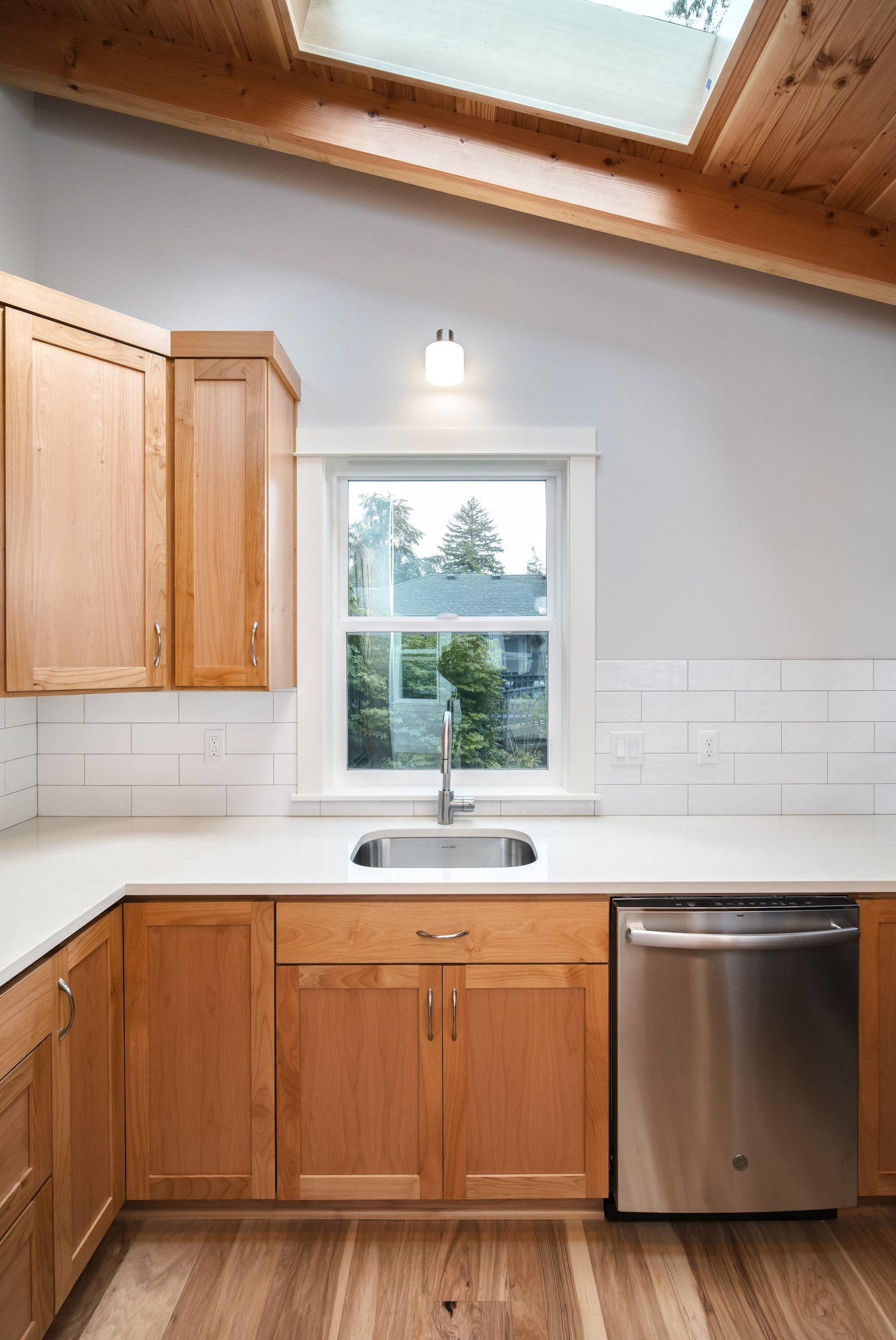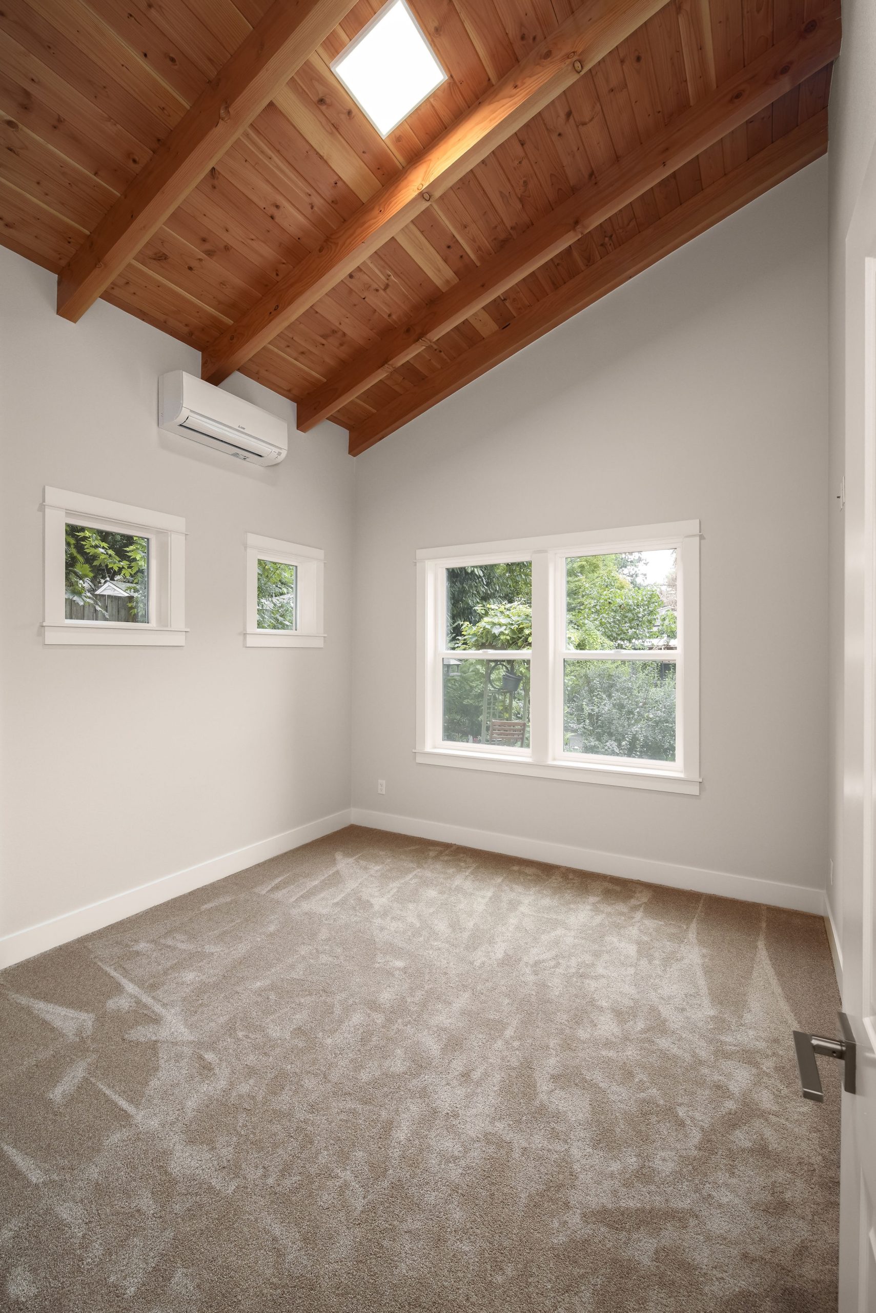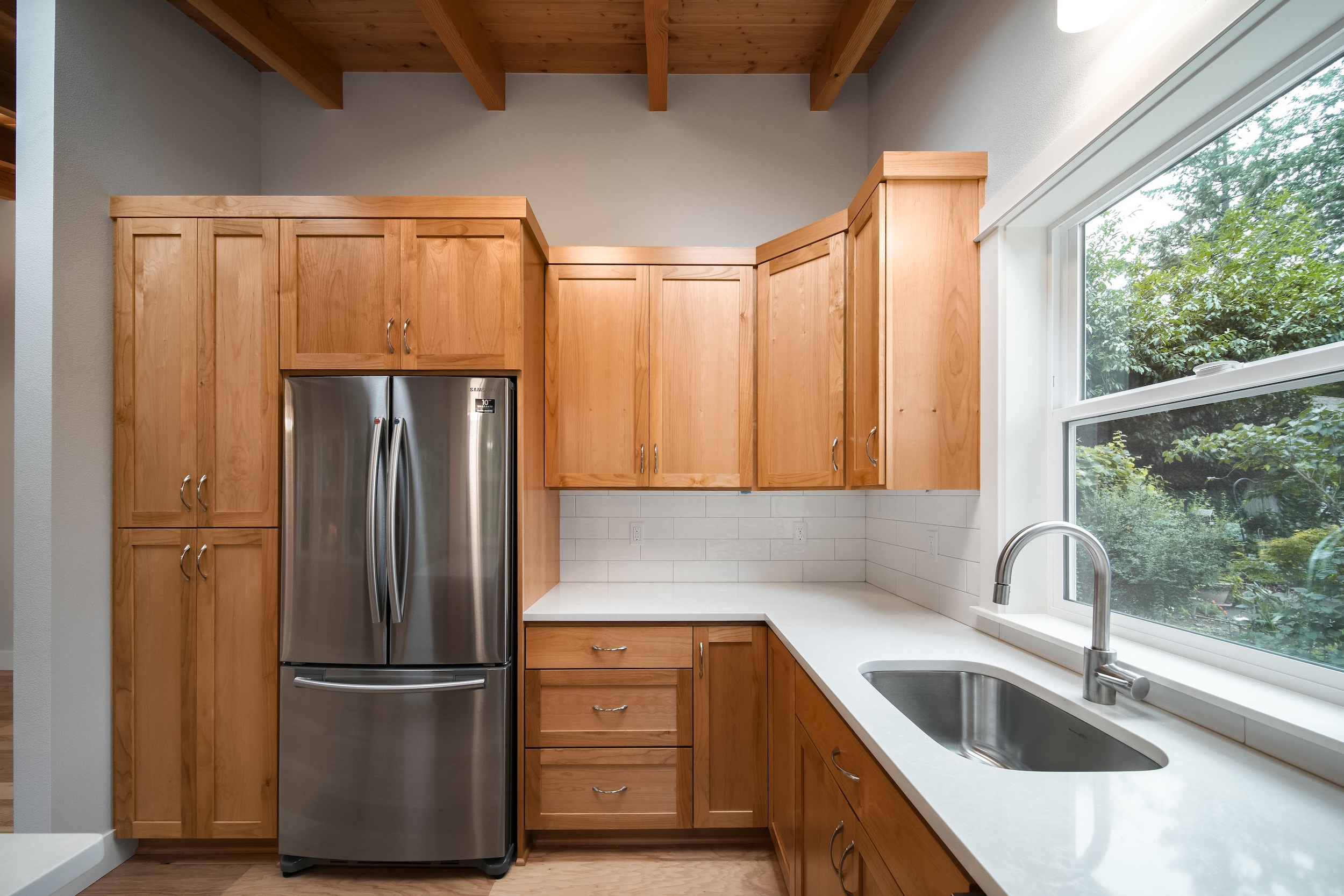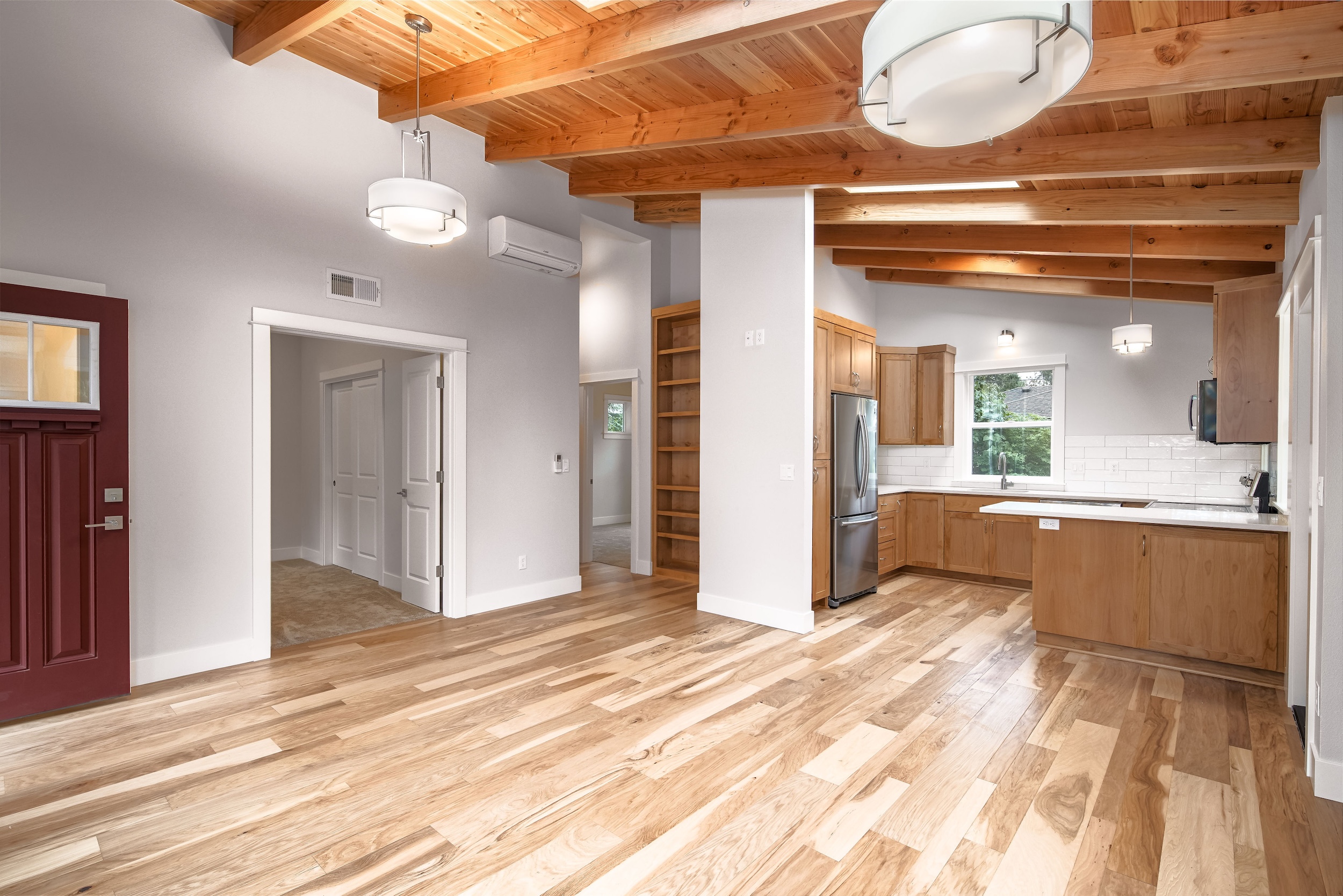 The Shaw’s modern contemporary ADU features vaulted ceilings, exposed beams, and a tongue-and-groove aesthetic. This spacious 800 square foot dwelling exudes sophistication, with its built-in cabinets and window bench enhancing both functionality and style.