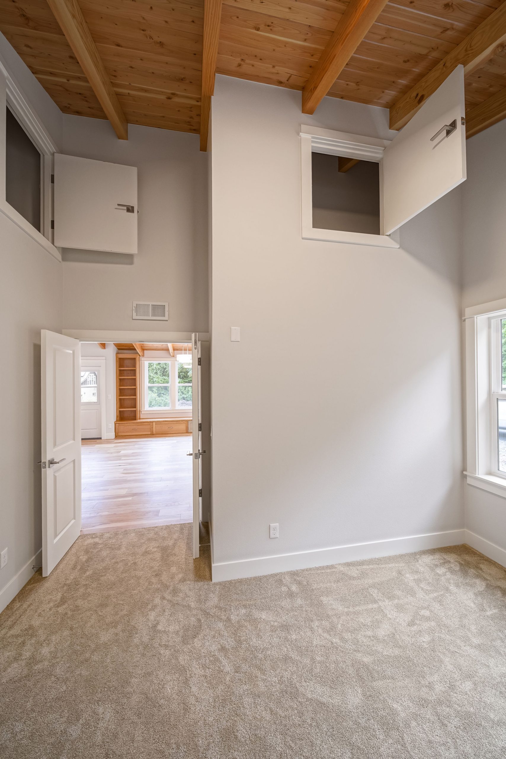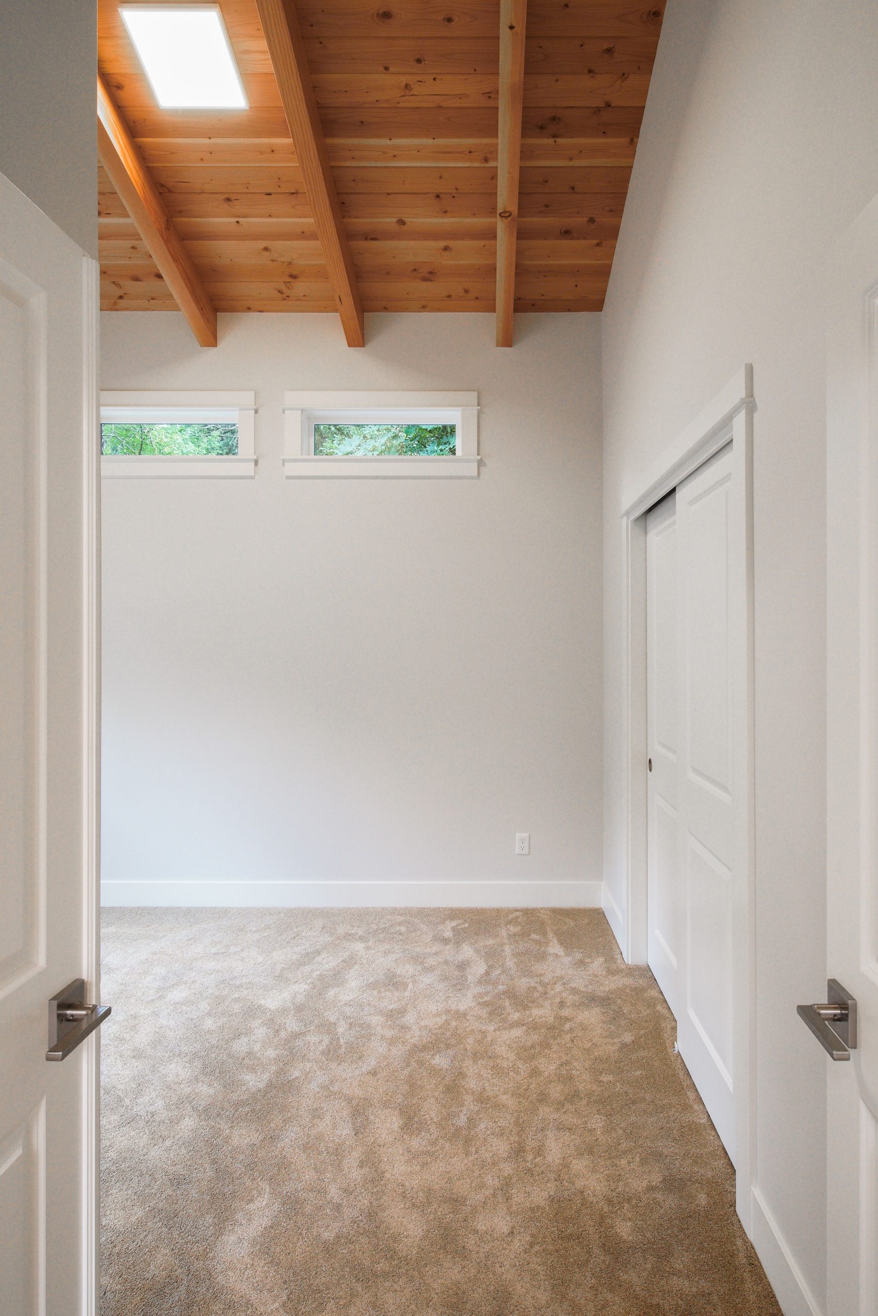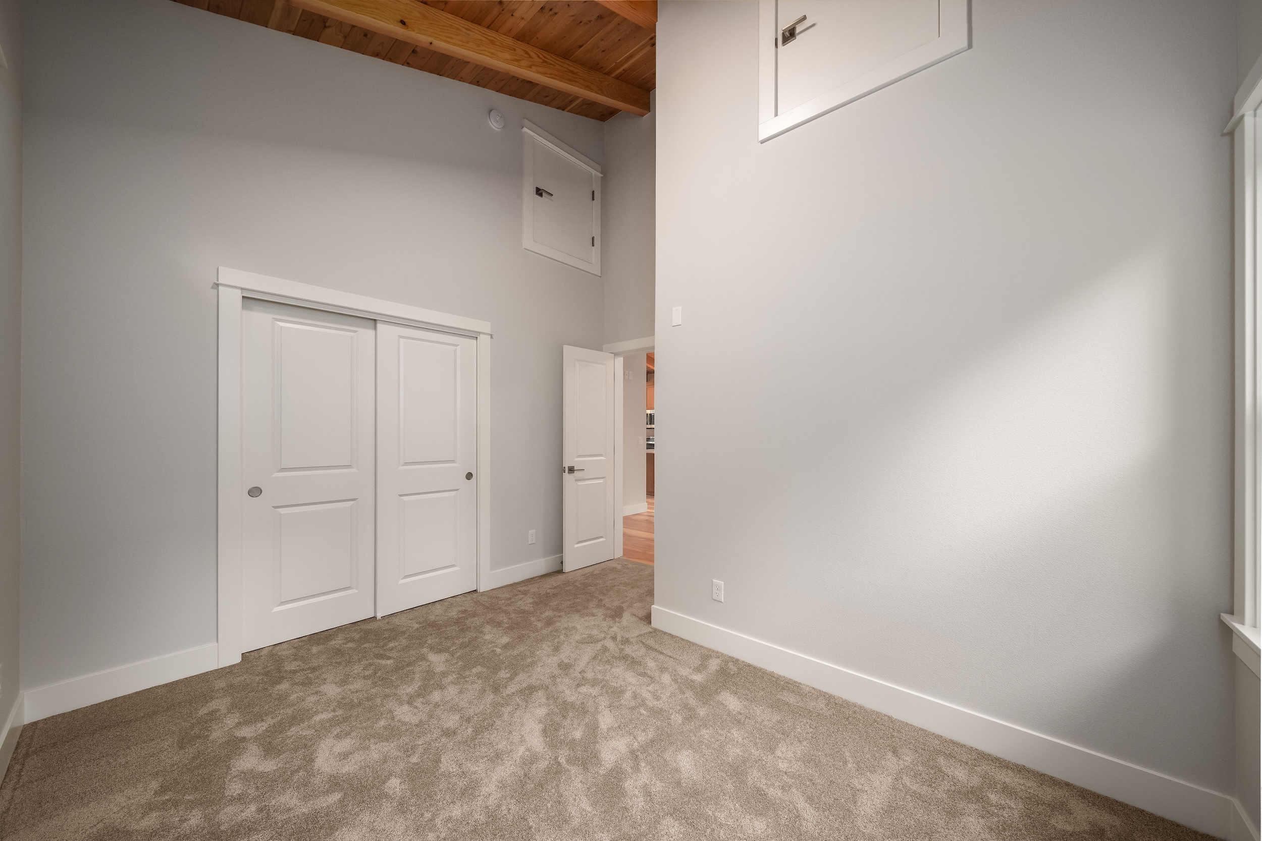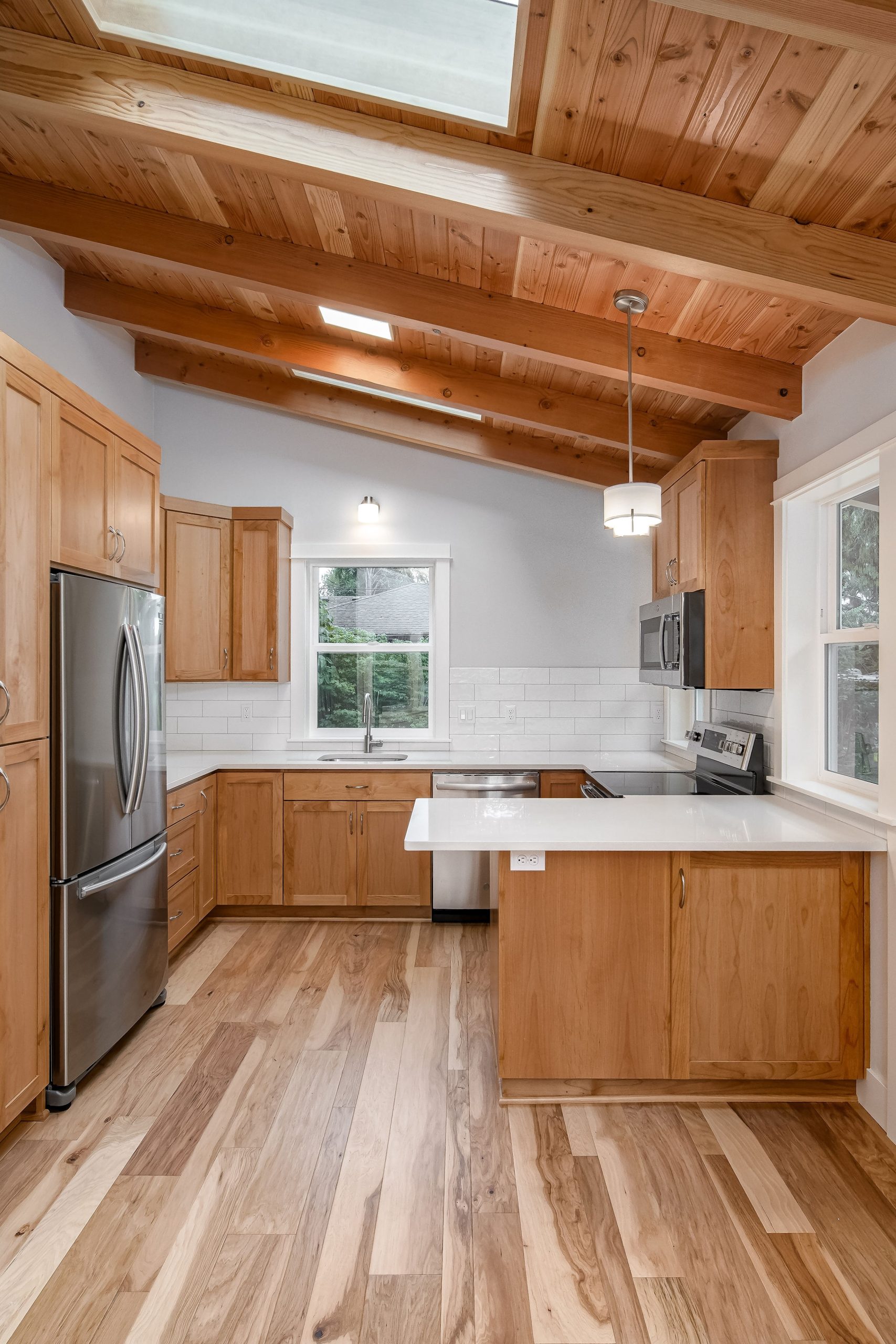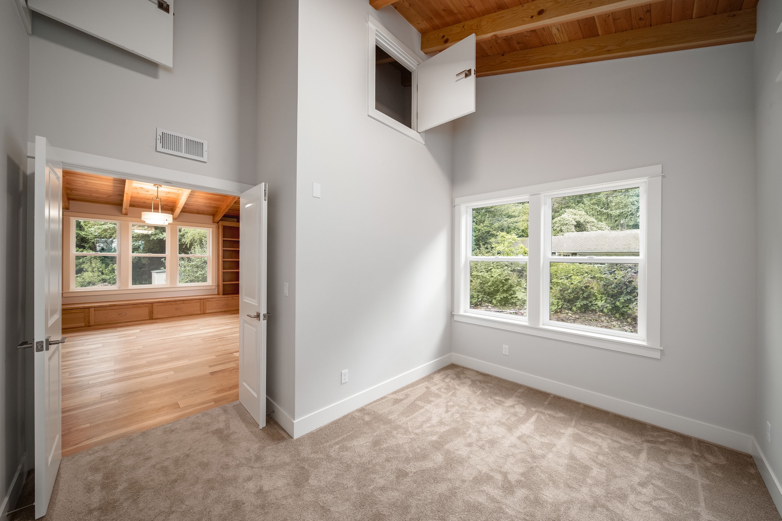The Shaw’s modern contemporary ADU features vaulted ceilings, exposed beams, and a tongue-and-groove aesthetic. This spacious 800 square foot dwelling exudes sophistication, with its built-in cabinets and window bench enhancing both functionality and style.