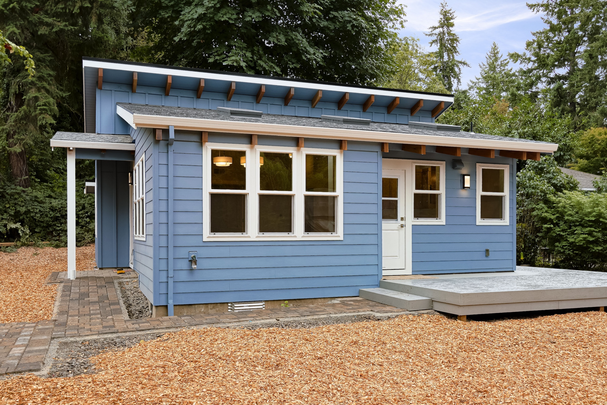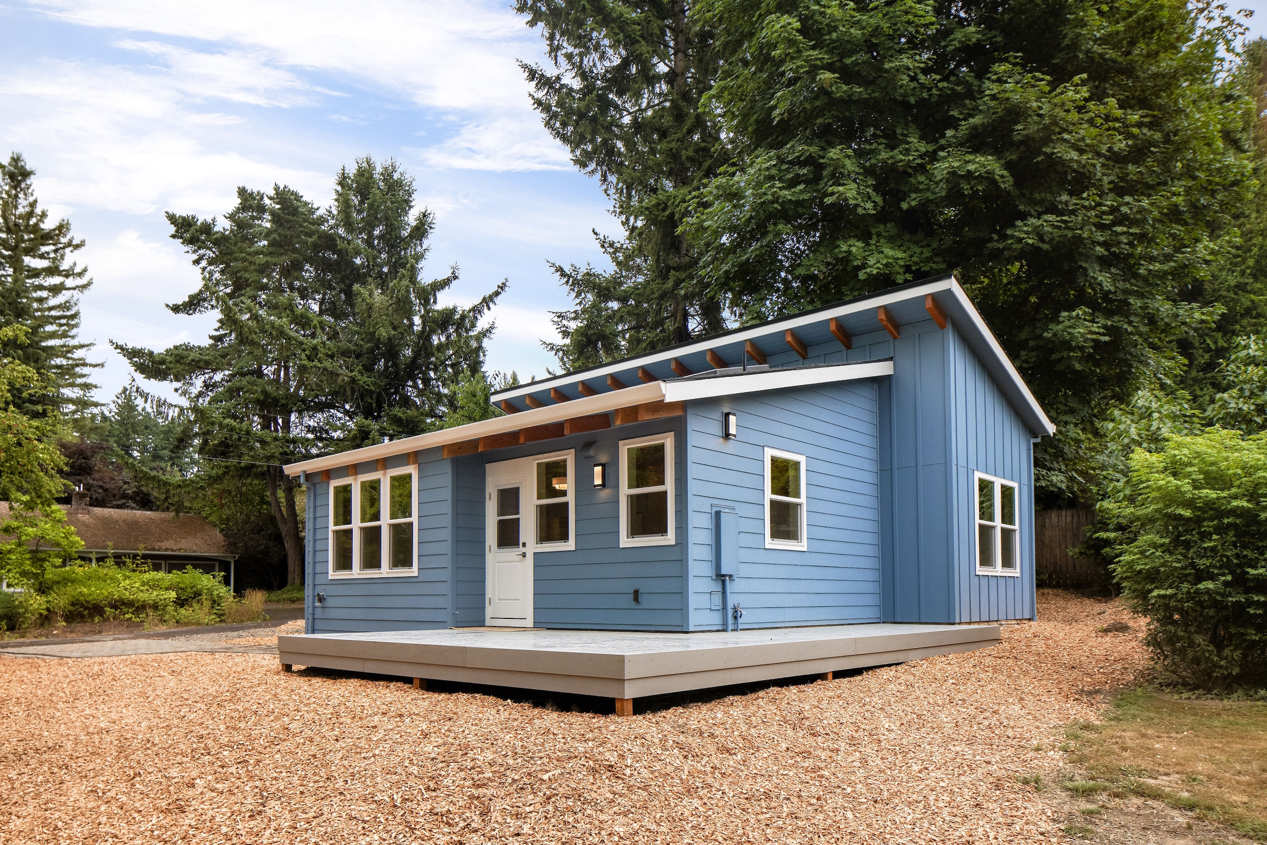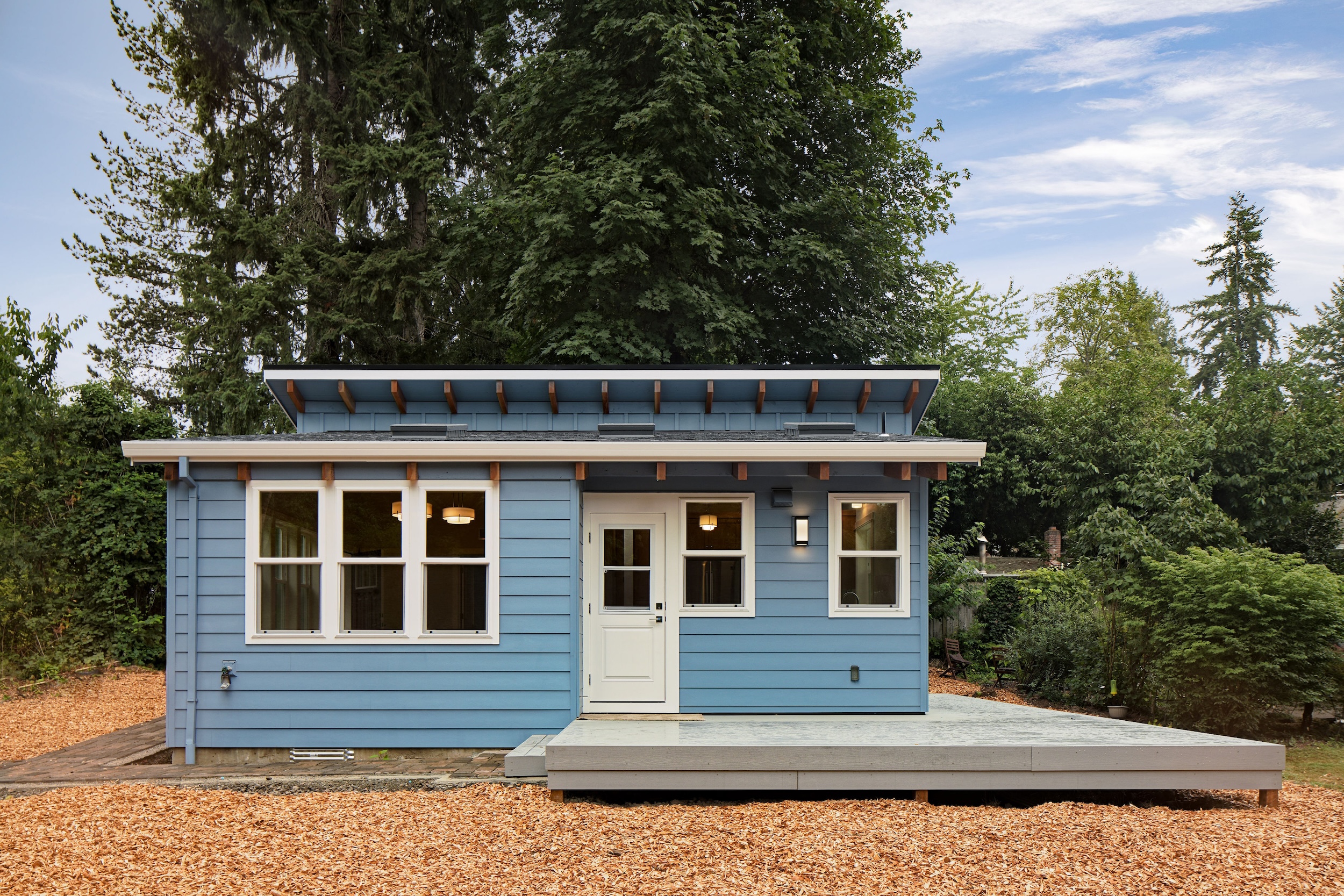 Set on a 32×34 footprint, this ADU includes a raised deck and planned hardscaping, seamlessly blending indoor and outdoor living to complement the sloped property.
