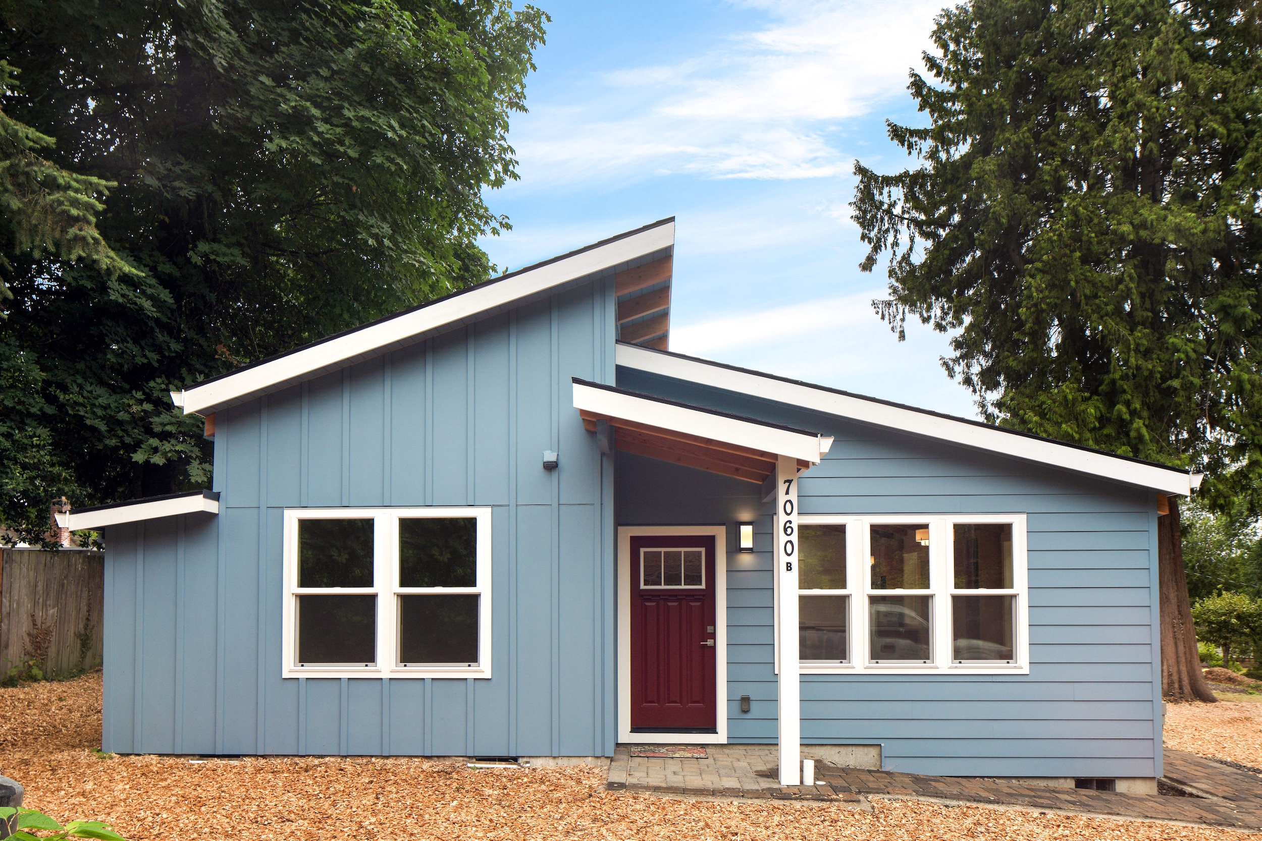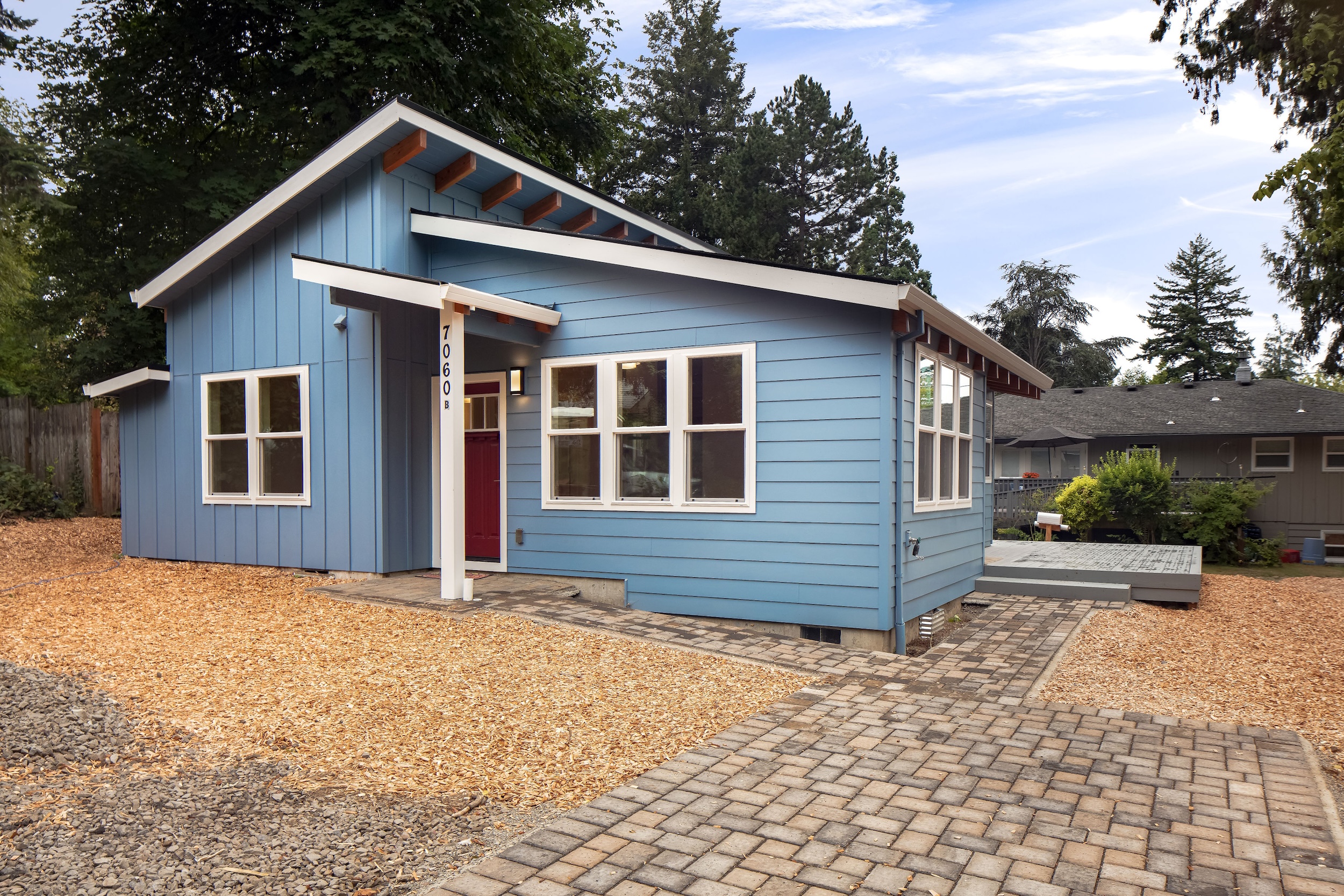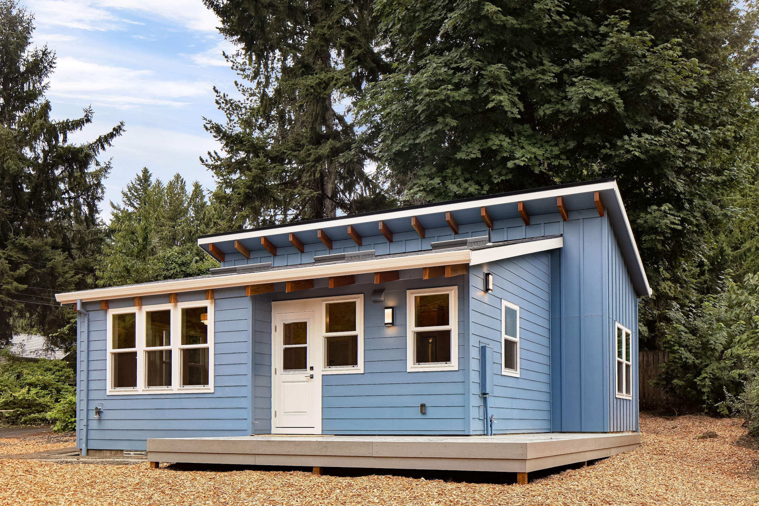 Set on a 32×34 footprint, this ADU includes a raised deck and planned hardscaping, seamlessly blending indoor and outdoor living to complement the sloped property.