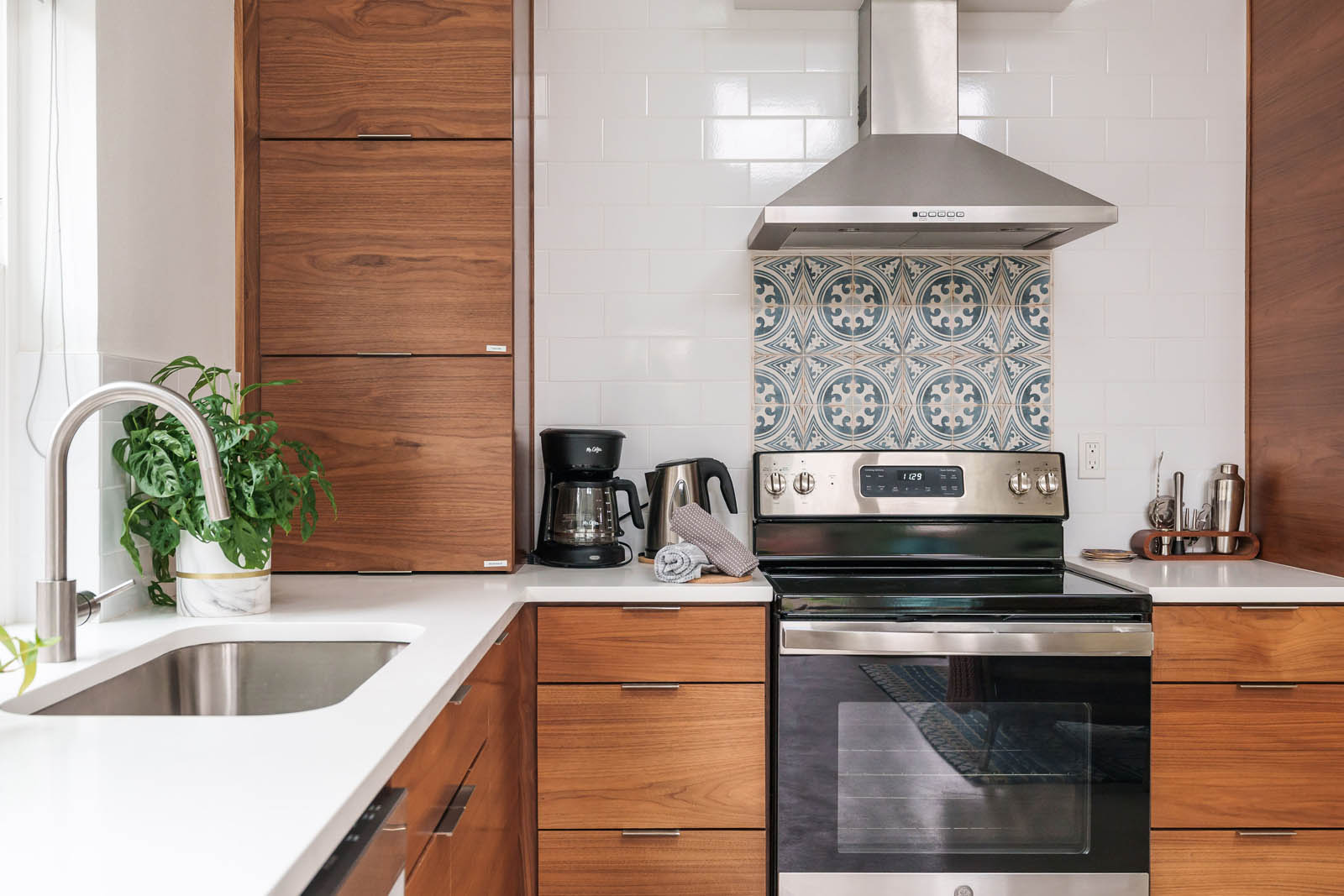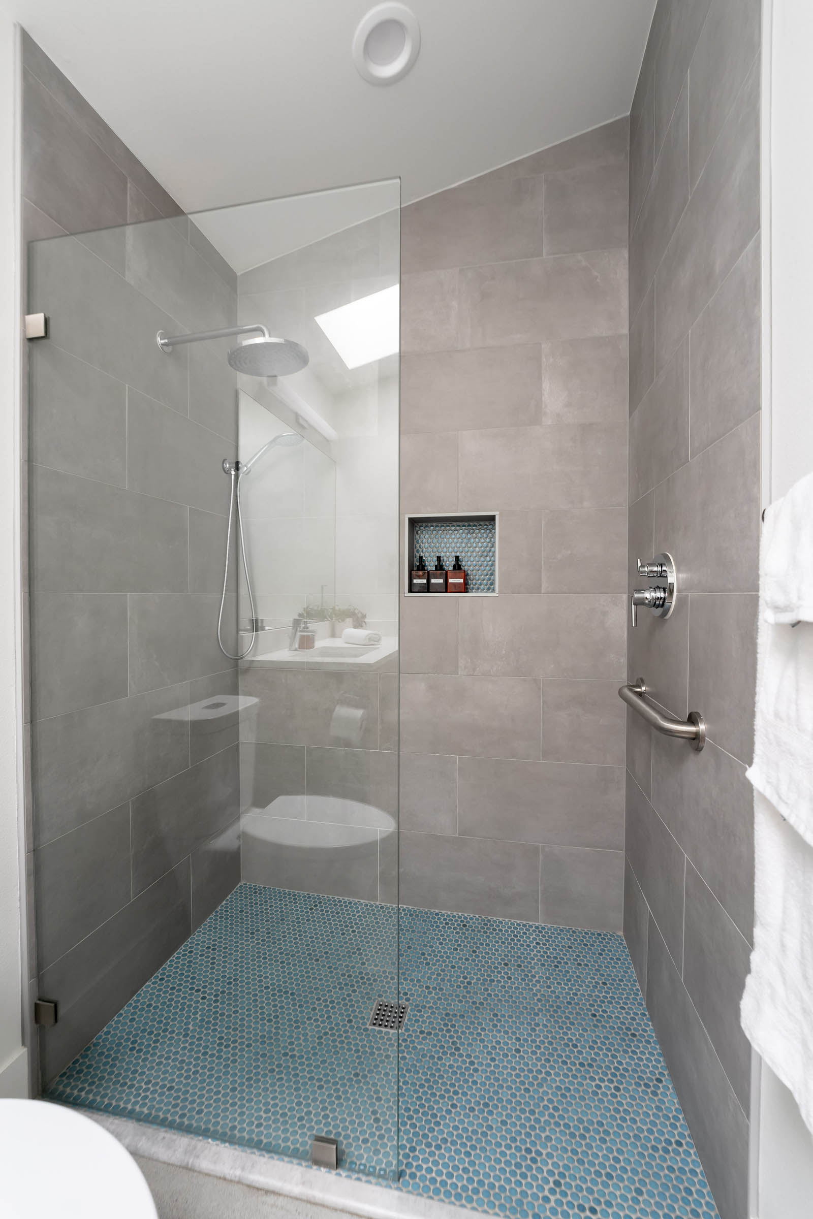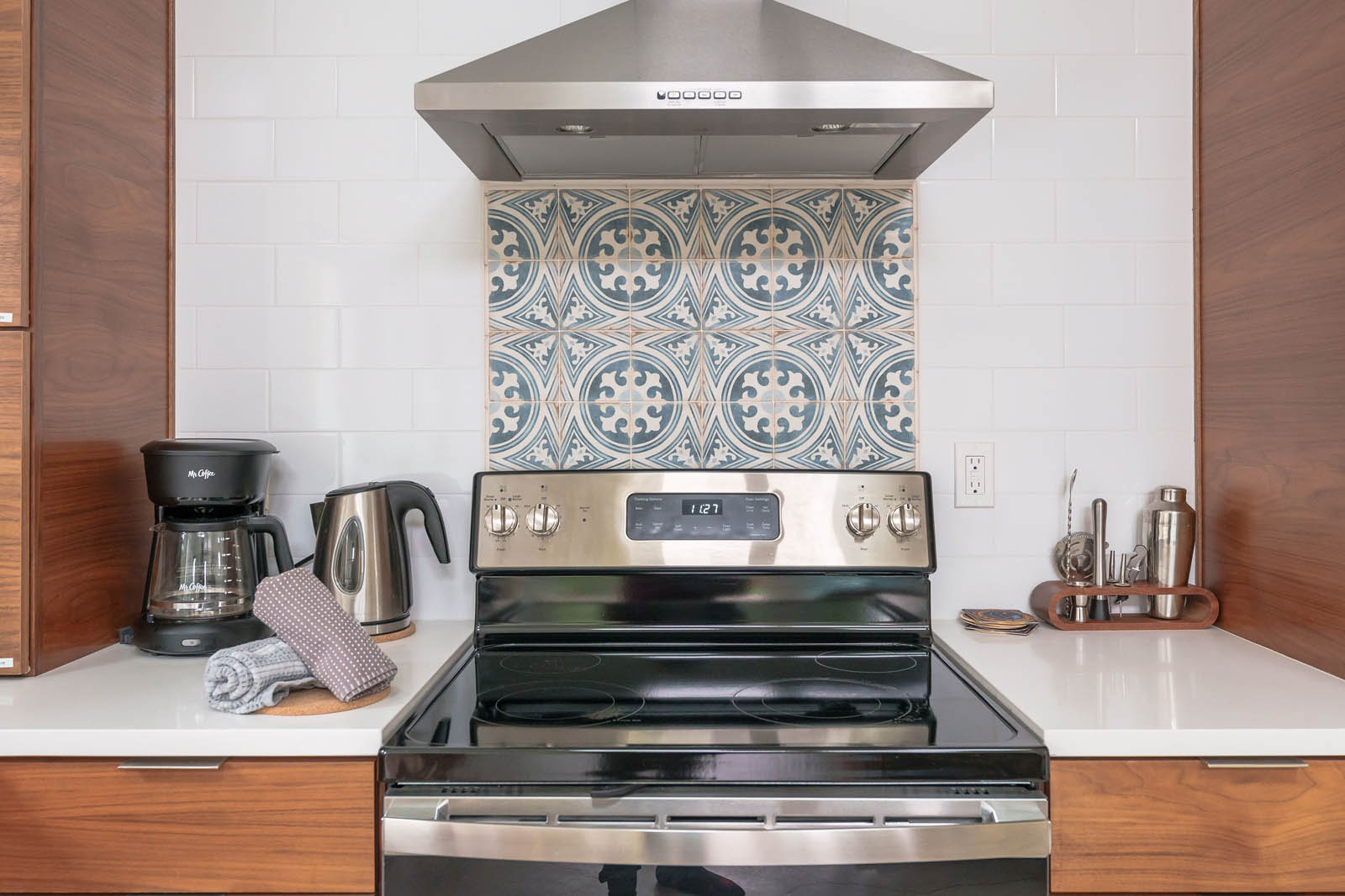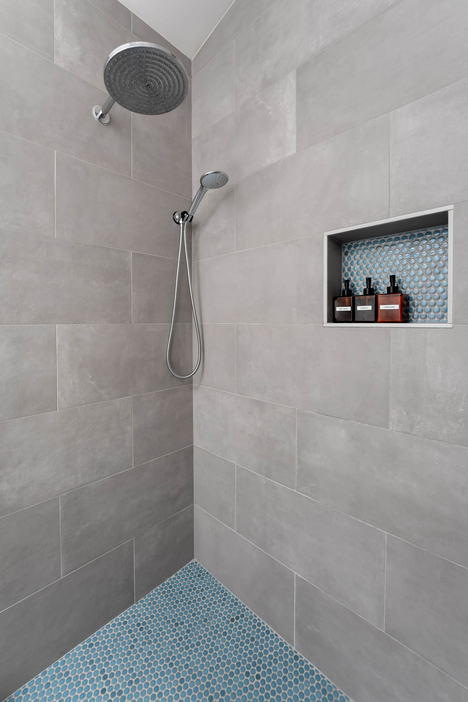 Their chosen aesthetic incorporates clean lines and vibrant pops of color, inspired by their recent travels. This influence is evident in the blue penny rounds adorning the shower floor and niche, as well as the deco tiles behind the range. The sleek look of the kitchen and bathroom vanity is achieved with flat fronts on the cabinet doors.