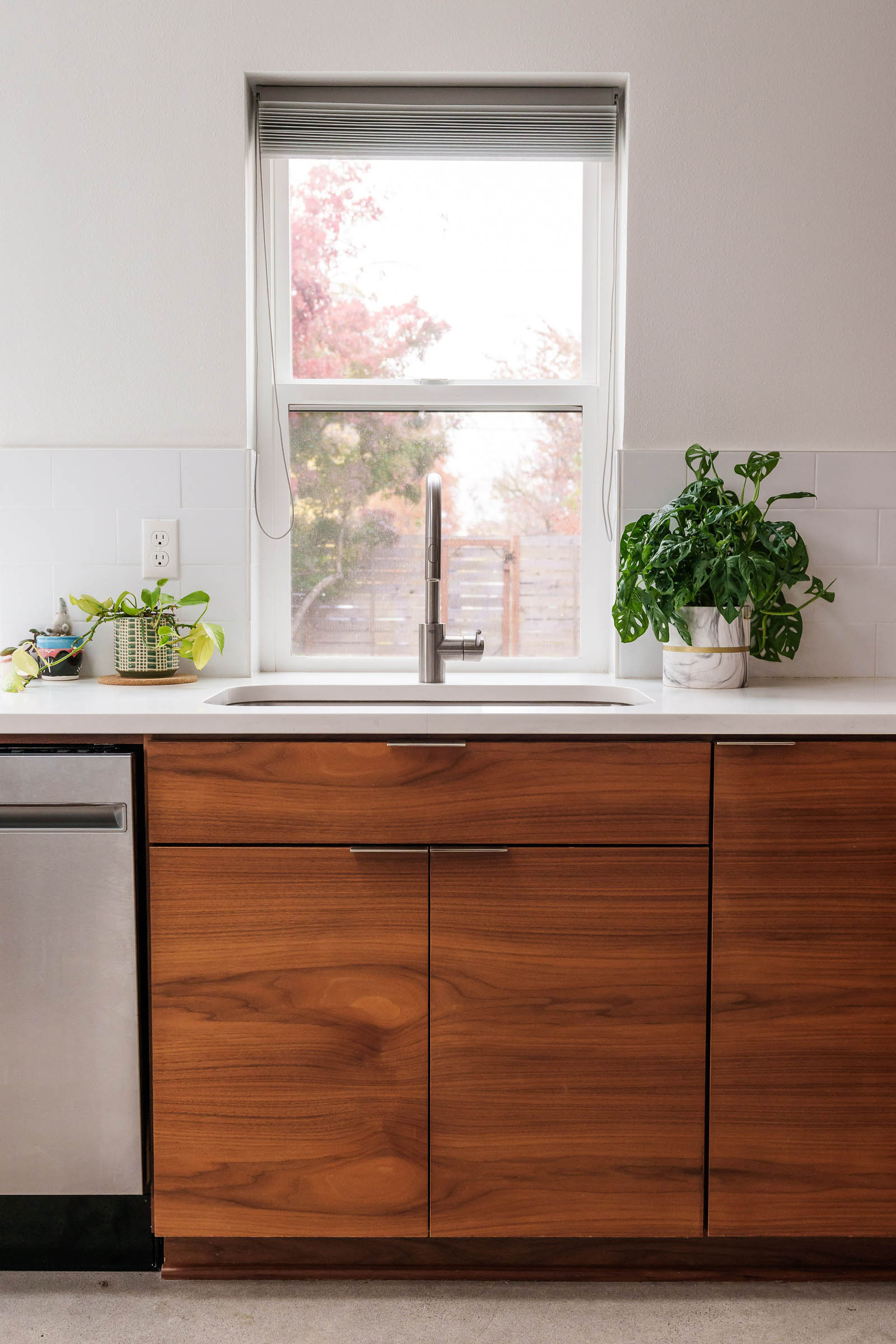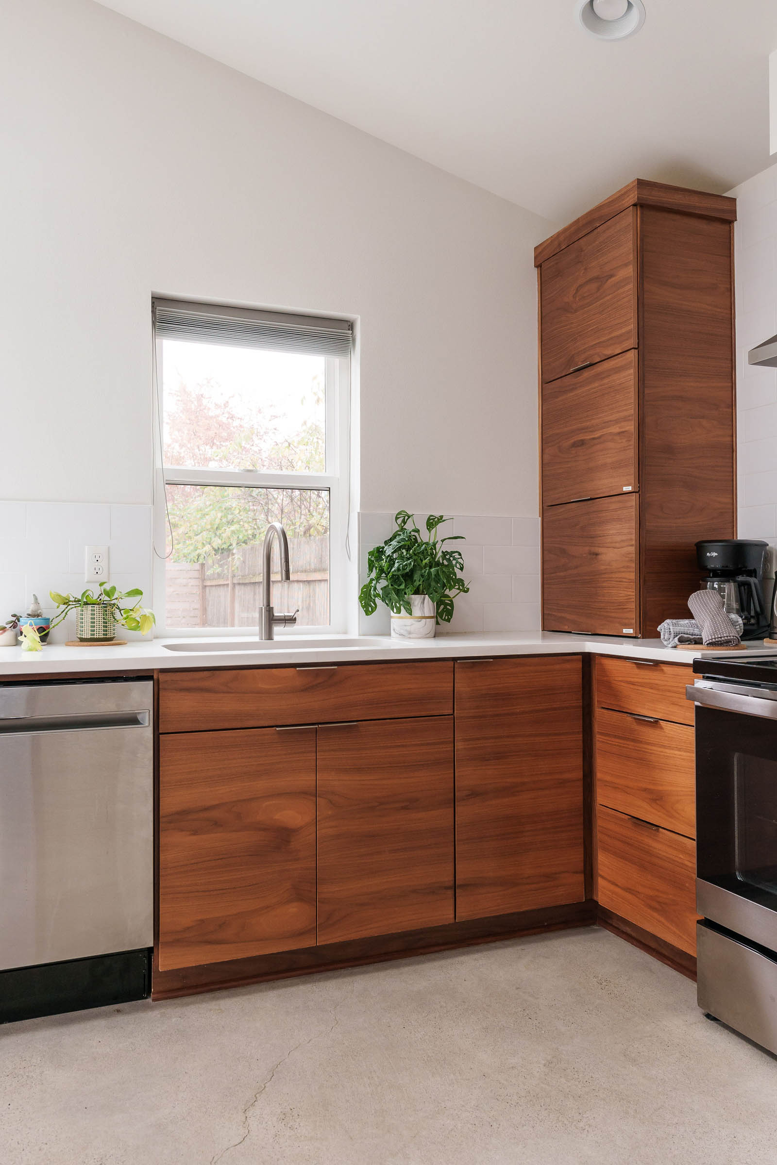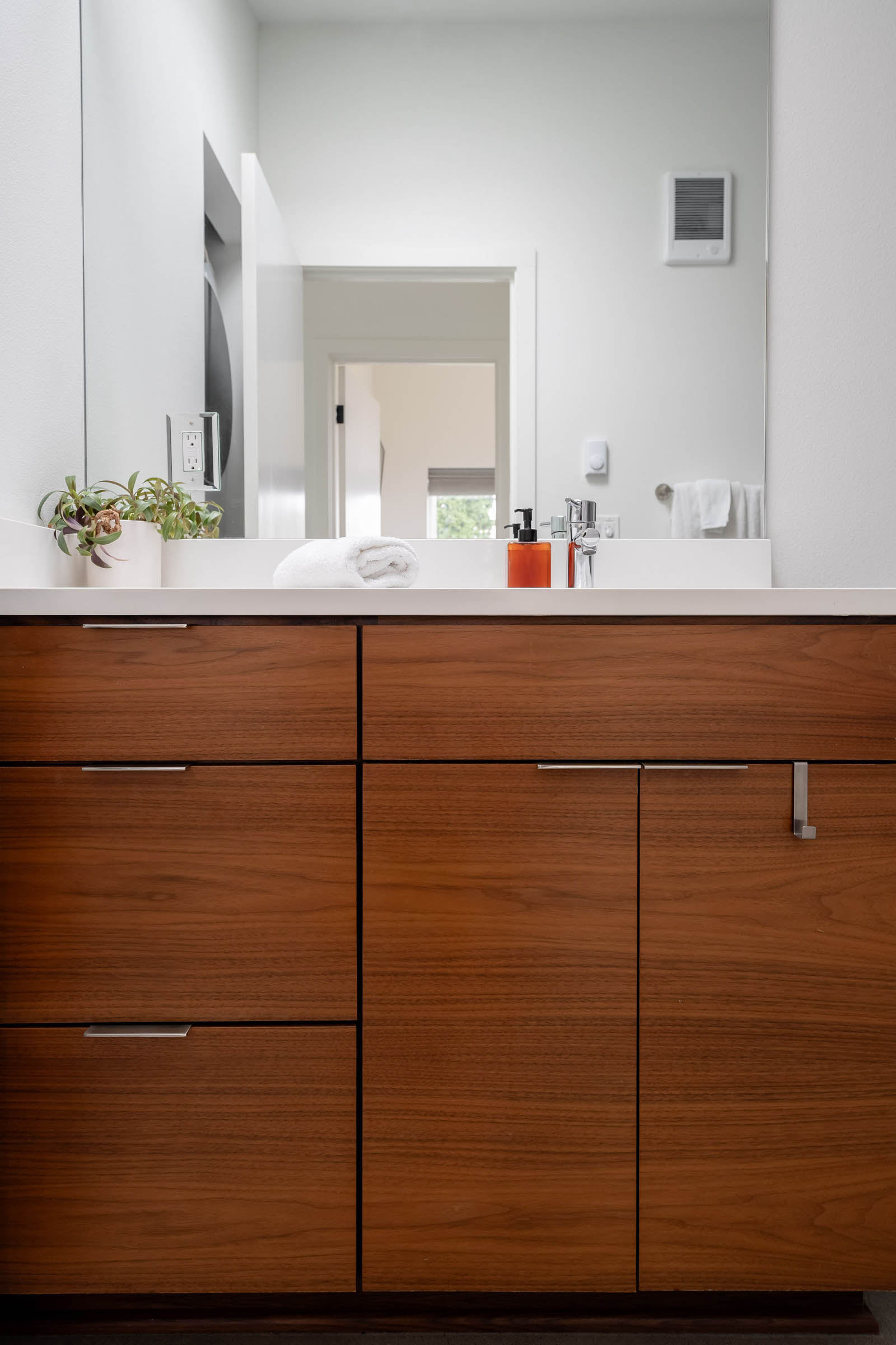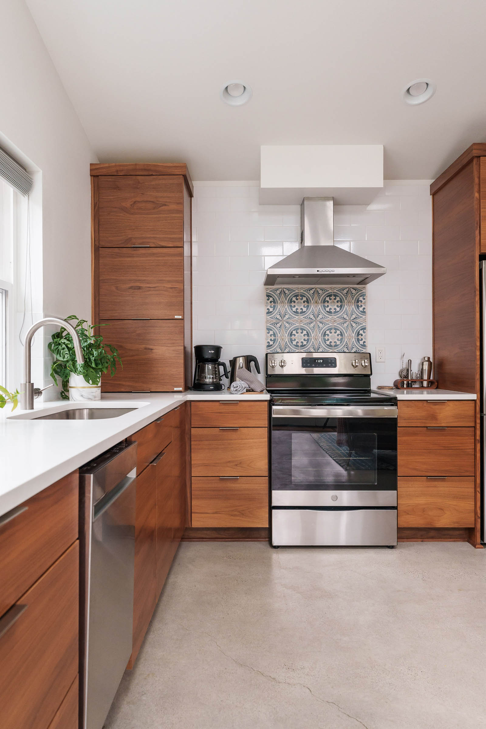 Their chosen aesthetic incorporates clean lines and vibrant pops of color, inspired by their recent travels. This influence is evident in the blue penny rounds adorning the shower floor and niche, as well as the deco tiles behind the range. The sleek look of the kitchen and bathroom vanity is achieved with flat fronts on the cabinet doors.
