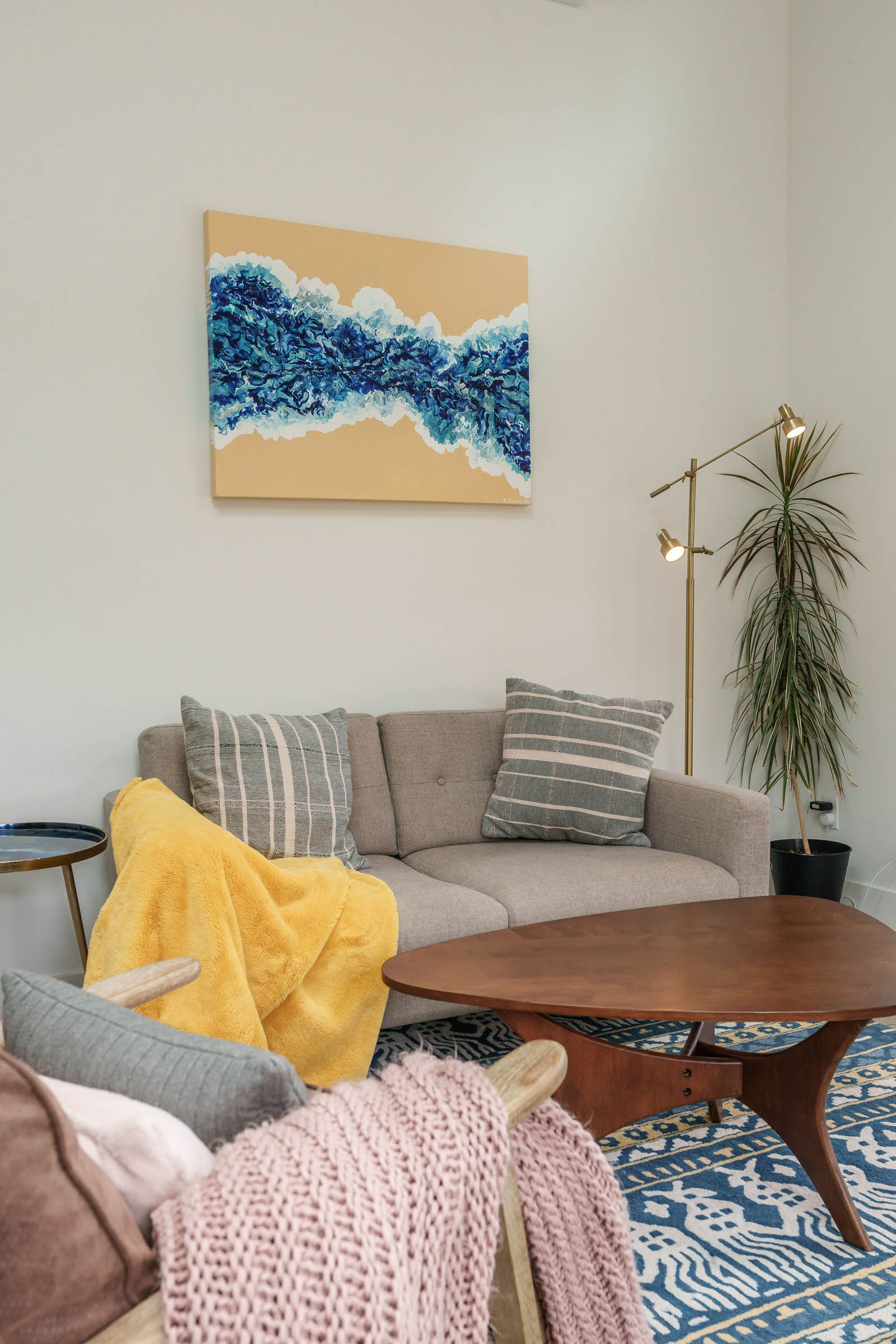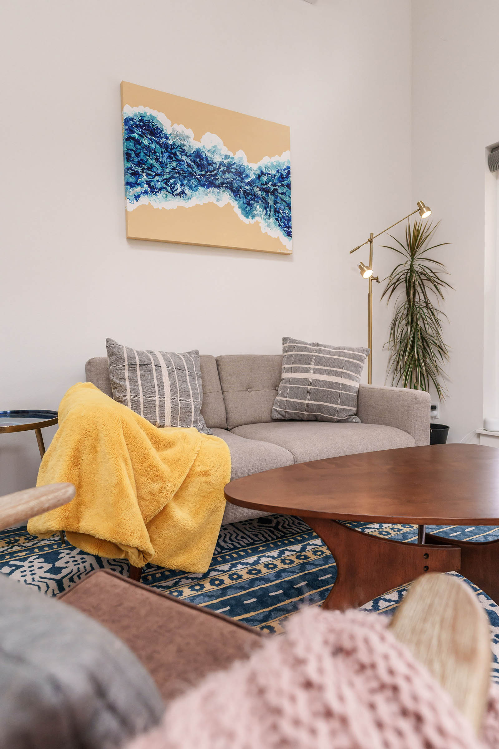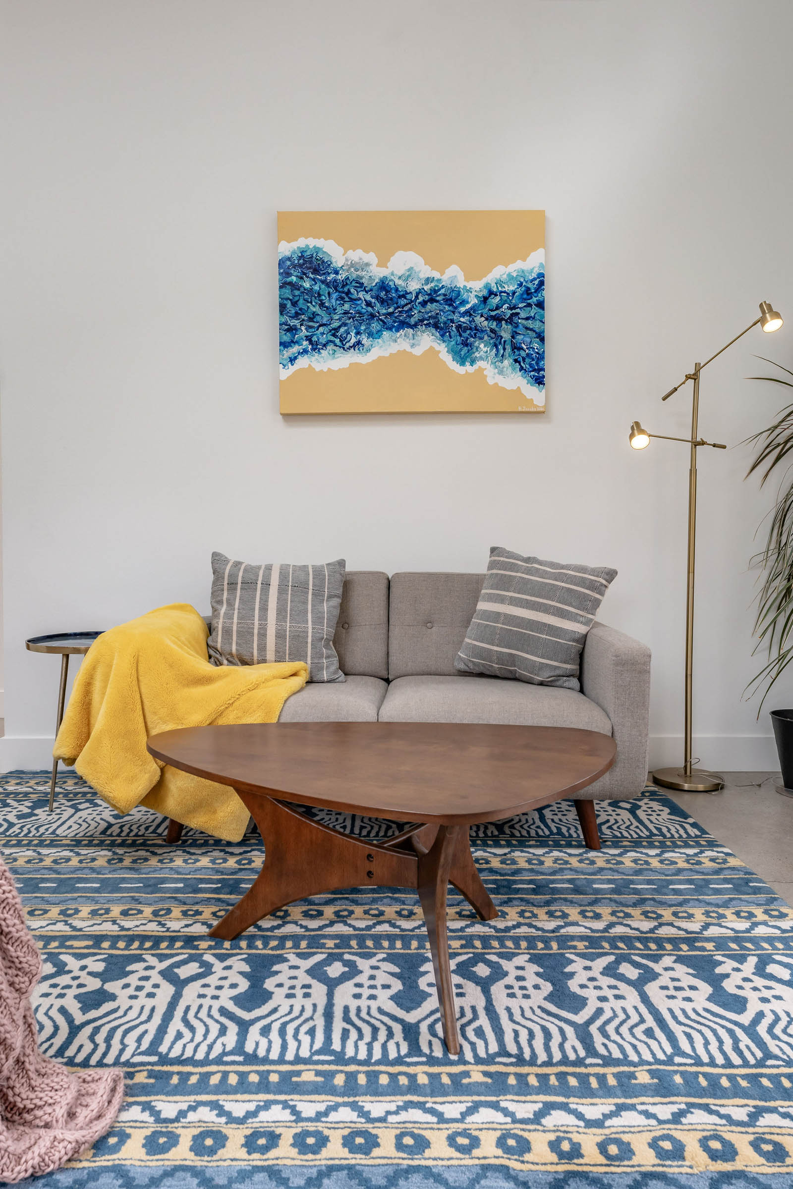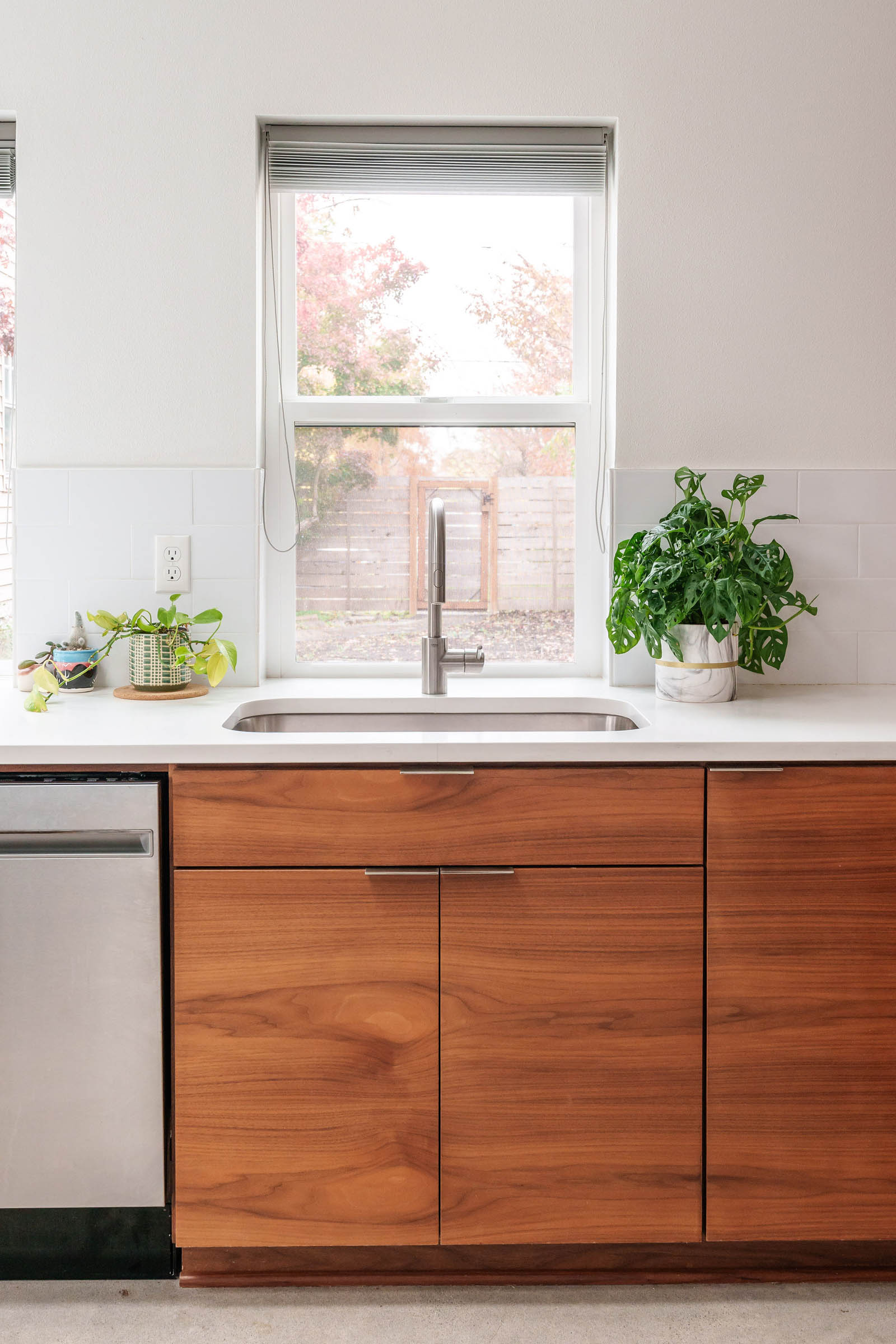 Their chosen aesthetic incorporates clean lines and vibrant pops of color, inspired by their recent travels. This influence is evident in the blue penny rounds adorning the shower floor and niche, as well as the deco tiles behind the range. The sleek look of the kitchen and bathroom vanity is achieved with flat fronts on the cabinet doors.