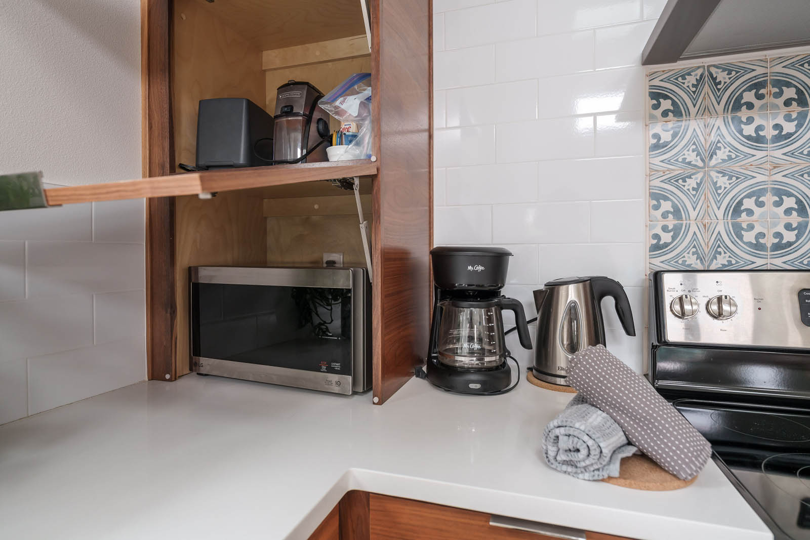 Notably, they take pride in showcasing a microwave cabinet with lift operation, seamlessly integrated atop the countertop.