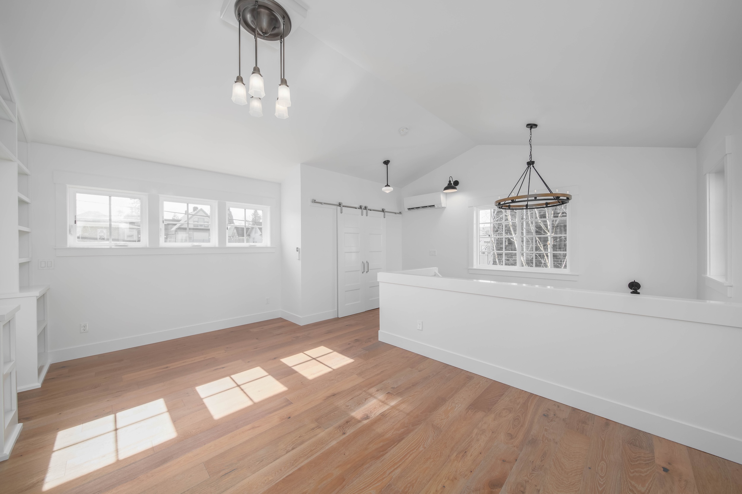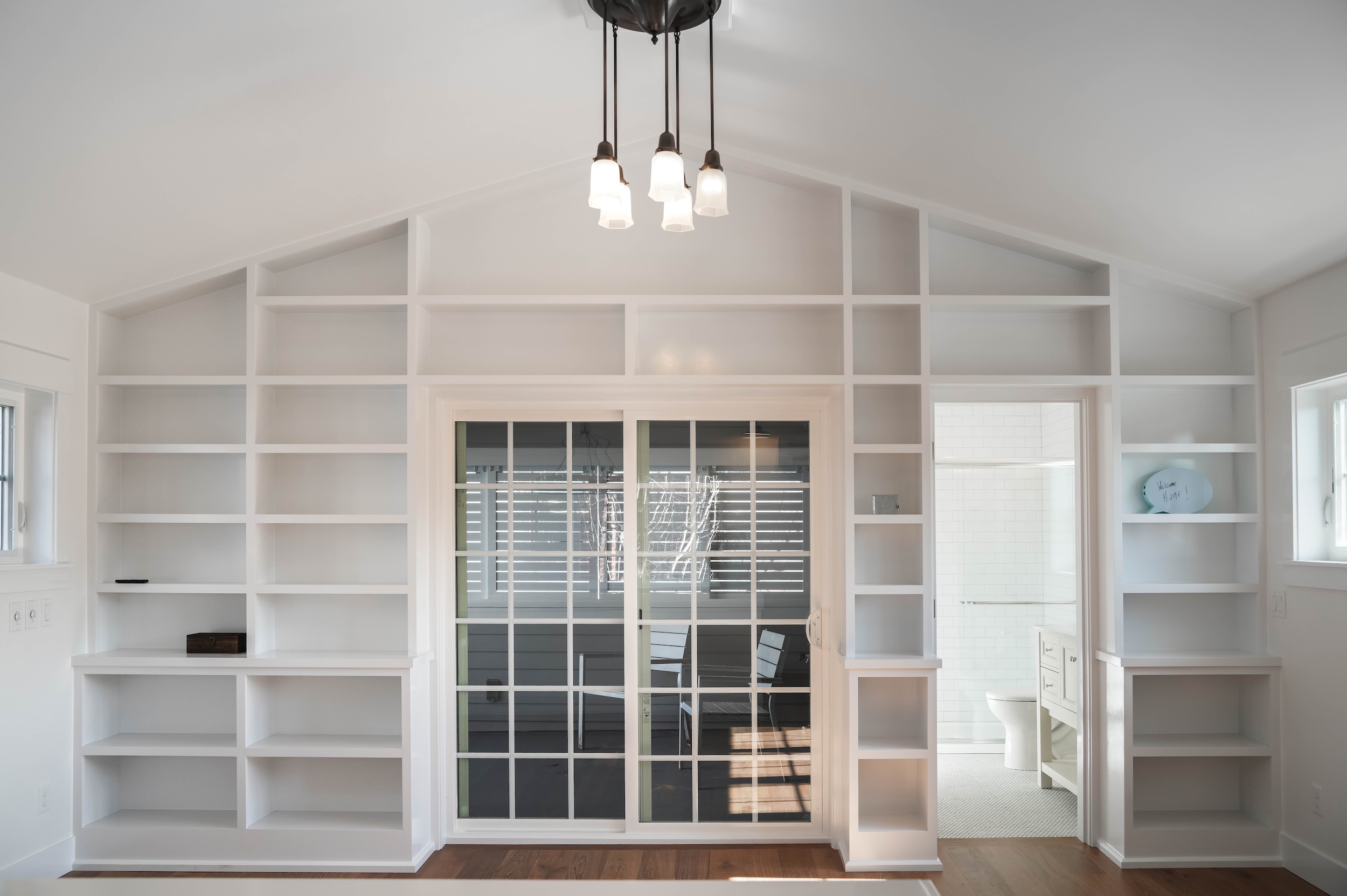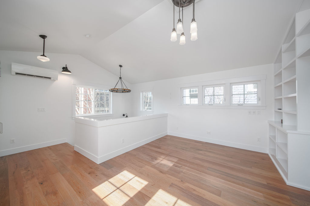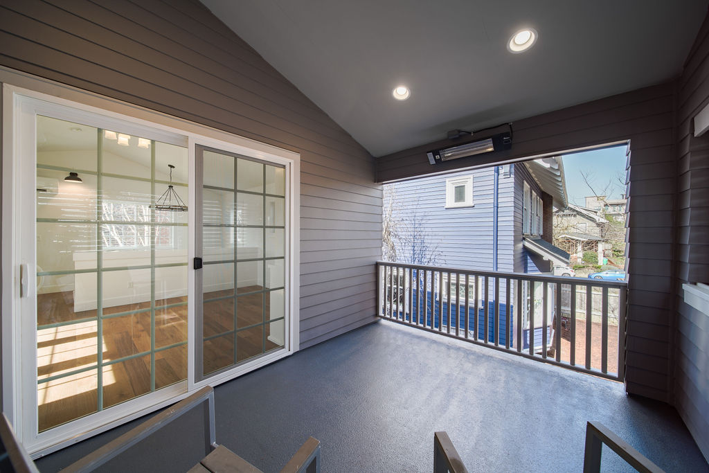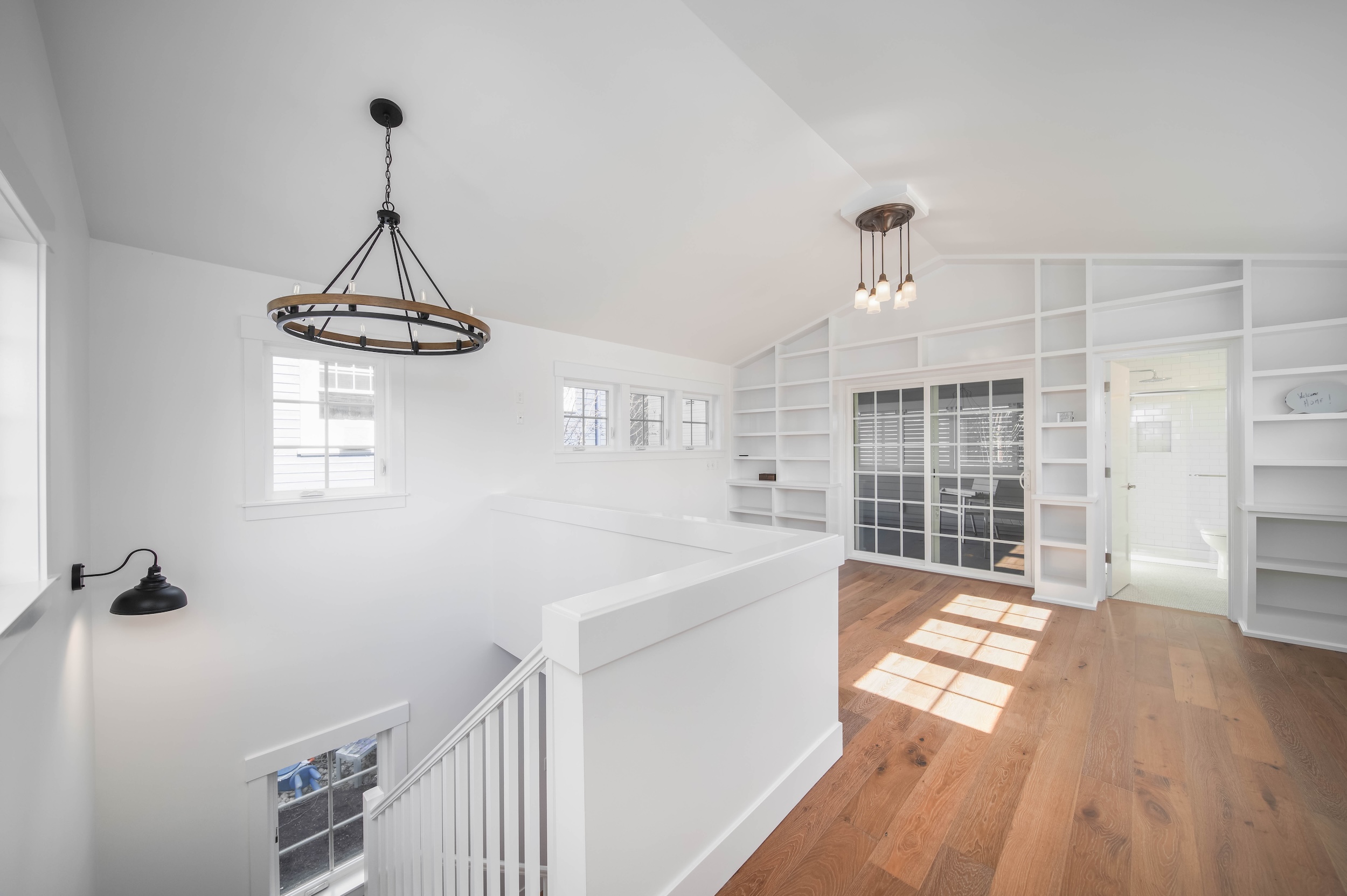 This luminous space boasts bright natural light, complemented by stunning floor-to-ceiling built-in shelving in the upper loft bedroom. The covered atrium-style porch on the upper level allows for easy access to the outdoors.