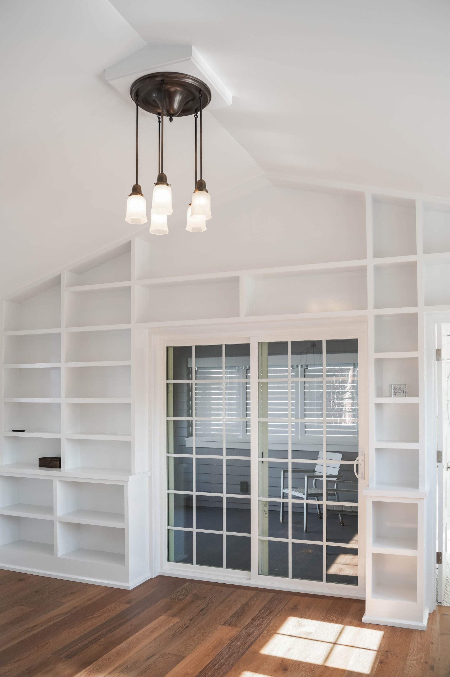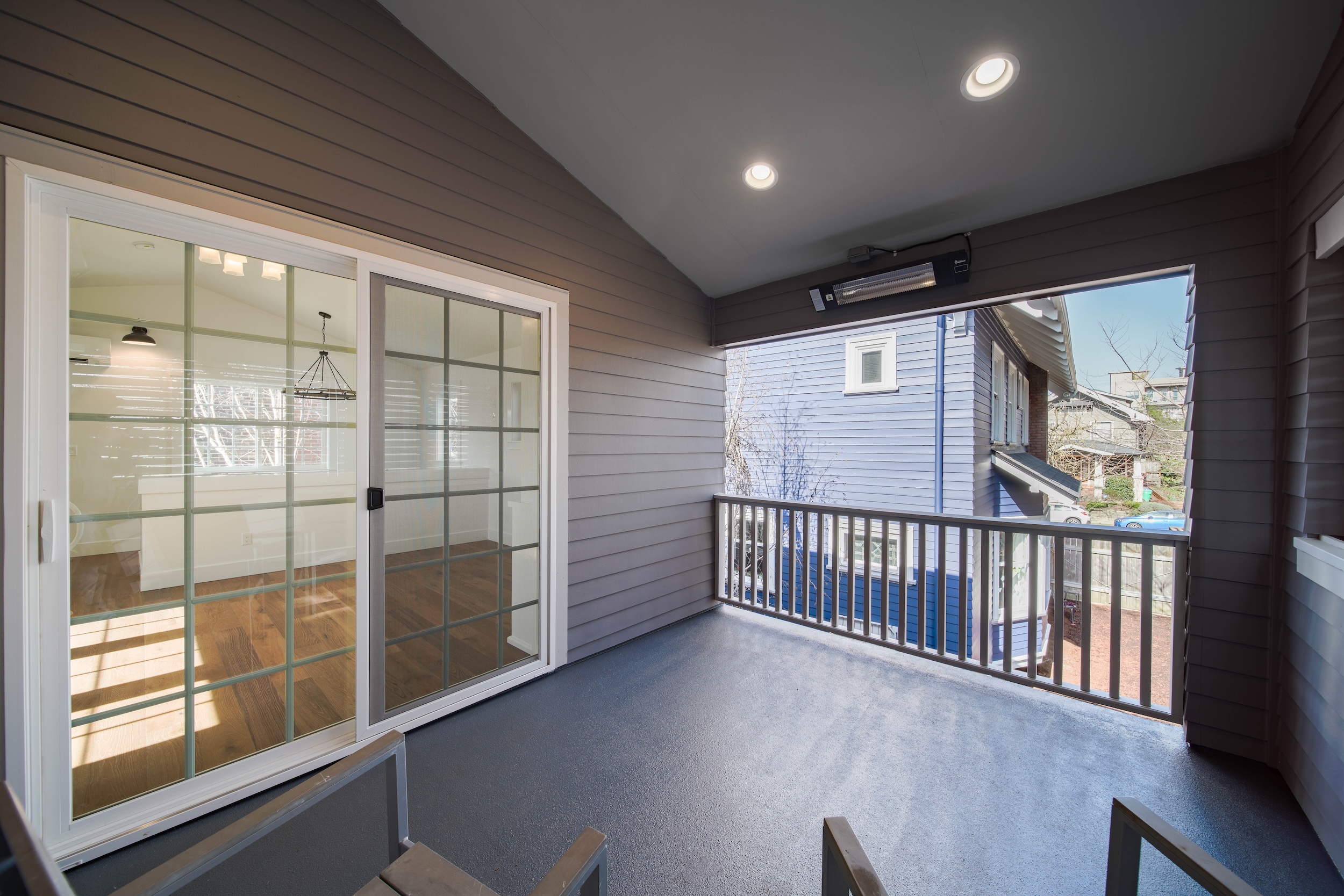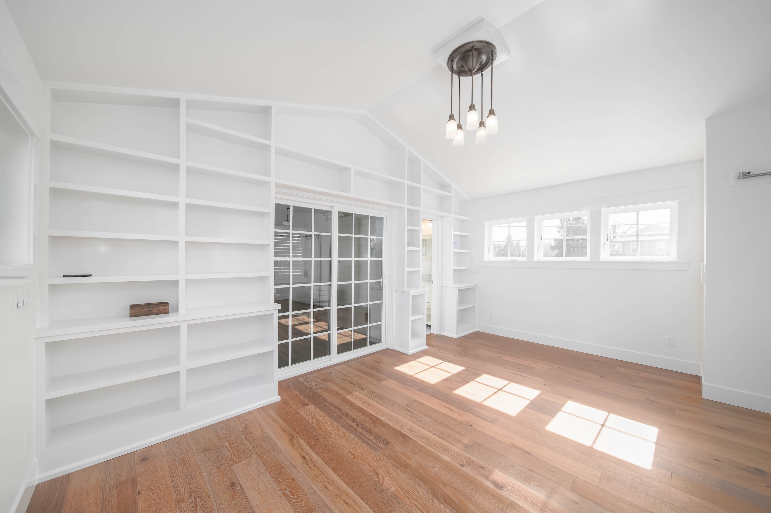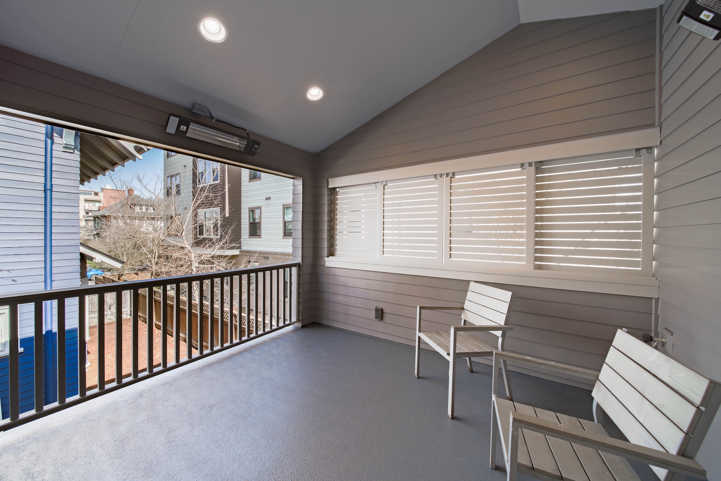 This luminous space boasts bright natural light, complemented by stunning floor-to-ceiling built-in shelving in the upper loft bedroom. The covered atrium-style porch on the upper level allows for easy access to the outdoors.