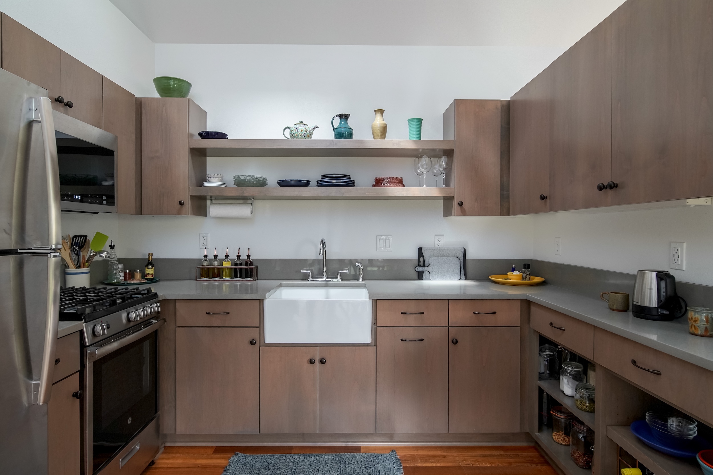 This floorplan has one bedroom, one bath, and shared laundry space – all on one level. As with many of our projects, this ADU was ingeniously converted from an old garage, maximizing both space and functionality.